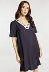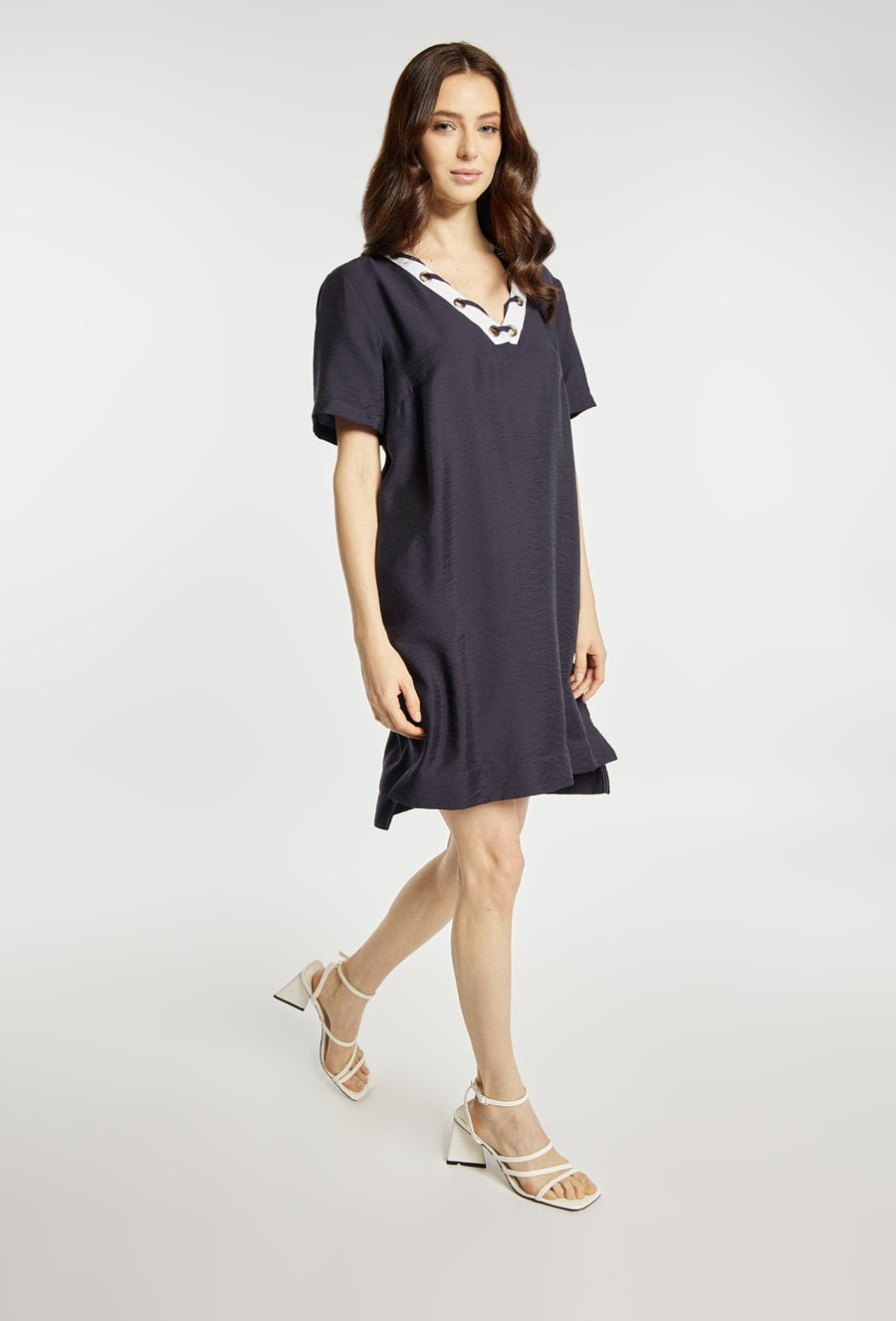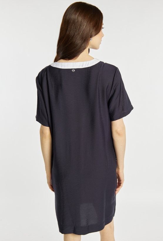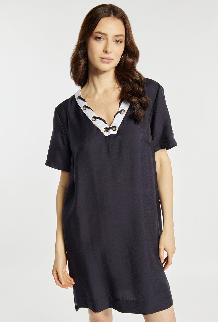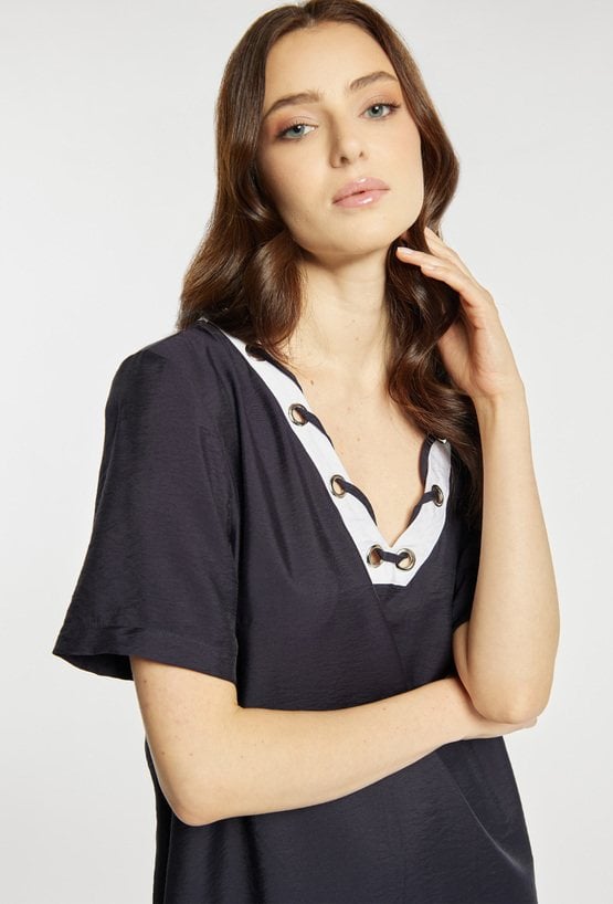Sukienka o prostym, swobodnym kroju, z krótkim rękawem i dekoltem w serek ozdobionym kontrastową lamówką oraz metalowymi oczkami. Sukienka ma długość przed kolano (mini), dzięki czemu jest lekka i wygodna na co dzień. Modelka na zdjęciu ma 177 cm wzrostu i prezentuje rozmiar 36.