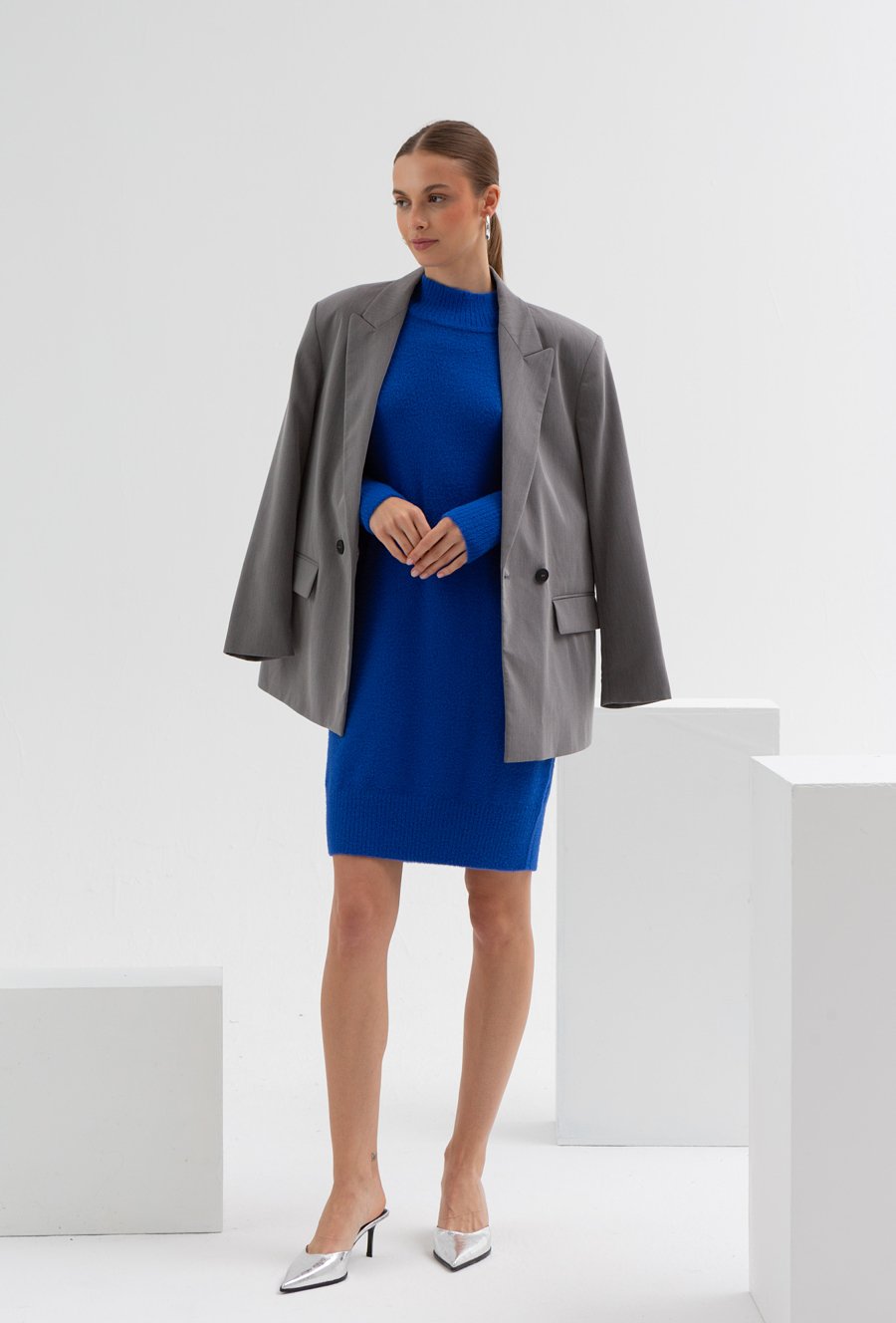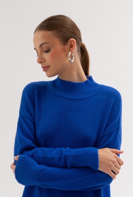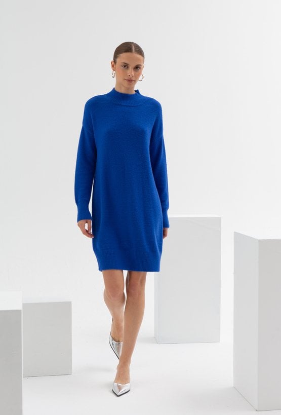 Kobaltowa sukienka z półgolfem wykonana z miękkiej i przyjemnej w dotyku dzianiny z dodatkiem wiskozy . Ma dopasowany fason z półgolfem. Długość przed kolna prezentuje się kobieco. Sukienka ma długie rękawy. Bedzie doskonałą propozycją na chłodne jesienne dni. Noś ją z kozakami lub szpilkami. Modelka na zdjęciu ma 178 cm wzrostu i prezentuje rozmiar 36.
