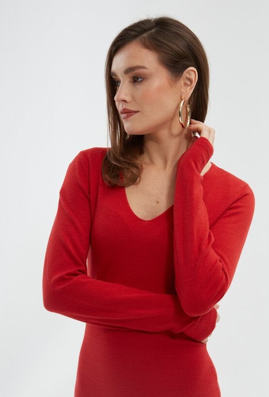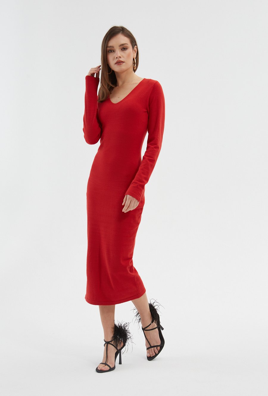Koralowa, dopasowana sukienka wykonana z przyjemnej w dotyku wiskozowej dzianiny. Długość poniżej kolan prezentuje się klasycznie. Posiada kobiecy dekolt, jednocześnie pięknie podkreśla sylwetkę. Modelka na zdjęciu ma 175 cm wzrostu i prezentuje rozmiar 36.