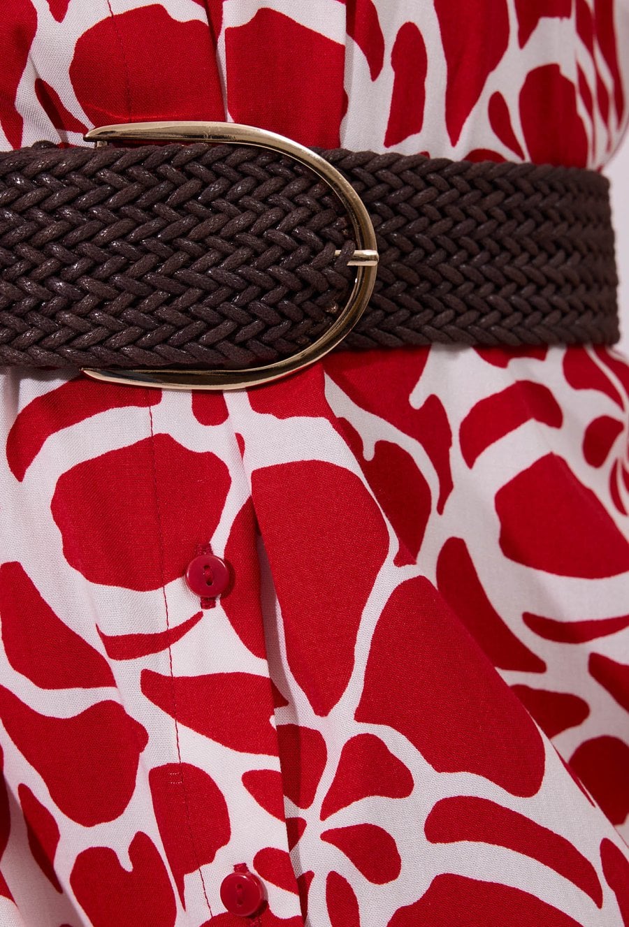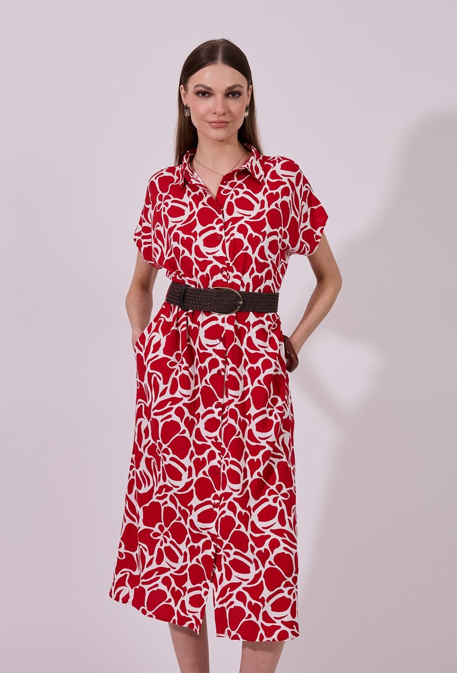Sukienka damska o klasycznym, koszulowym kroju. Model o długości midi z krótkim rękawem oraz kołnierzykiem, zapinany na guziki na całej długości. Prosta forma i staranne wykończenie nadają całości eleganckiego, ponadczasowego charakteru. Koszulowa sukienka damska doskonale sprawdzi się w codziennych oraz bardziej stylowych stylizacjach. Pasek widoczny na zdjęciu nie stanowi elementu sukienki. Modelka na zdjęciu ma 177 cm wzrostu i prezentuje rozmiar S.