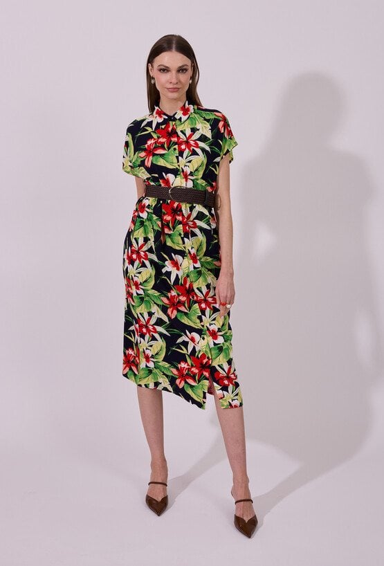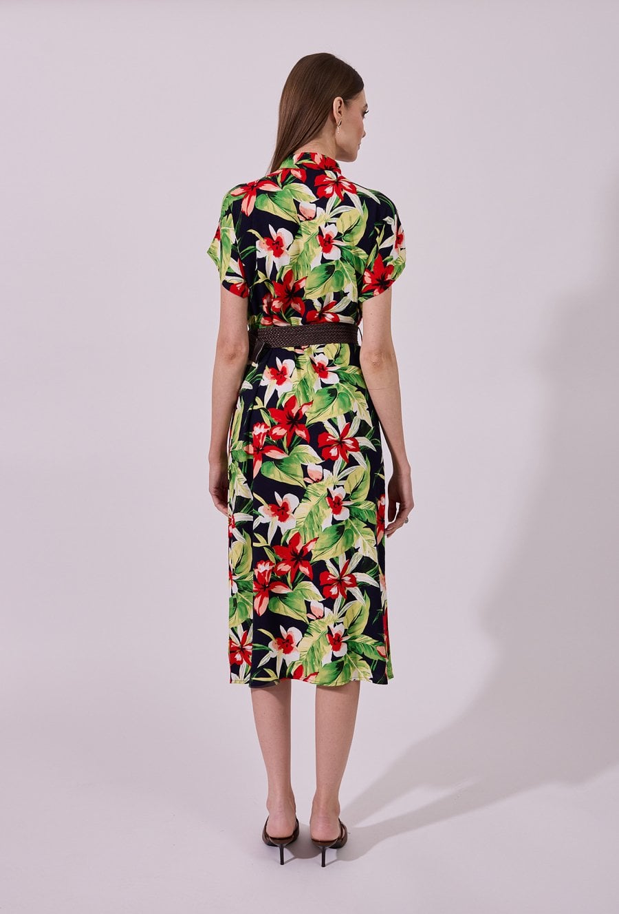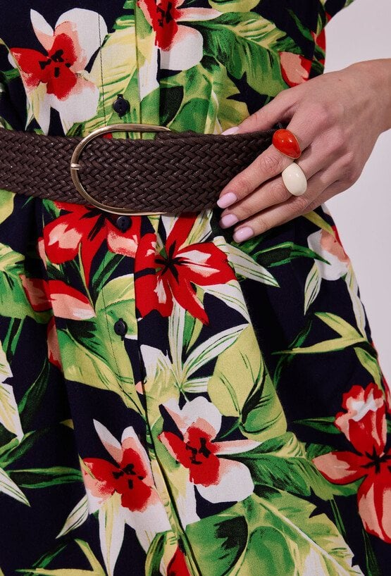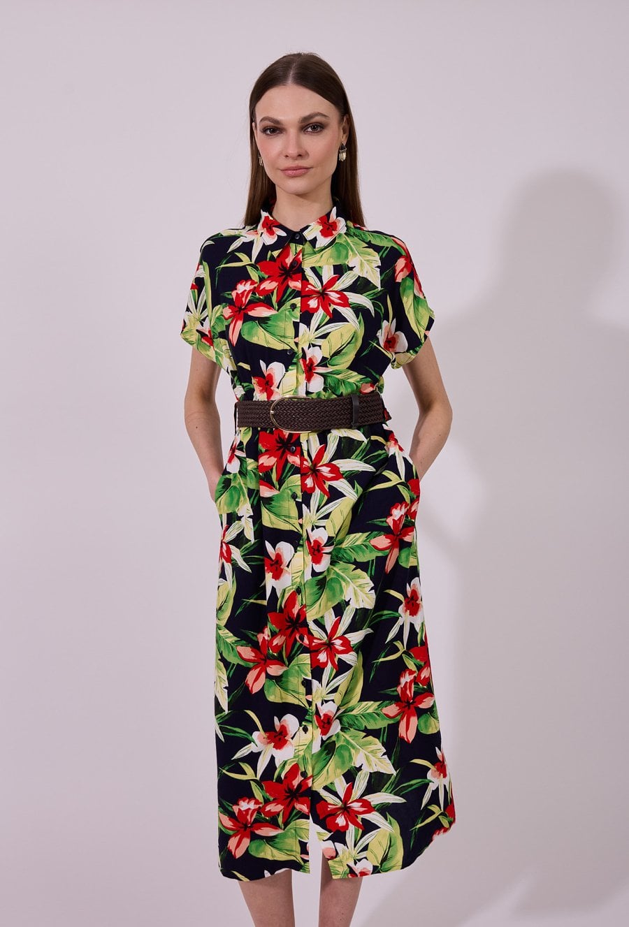 Sukienka damska o klasycznym, koszulowym kroju. Model o długości midi z krótkim rękawem oraz kołnierzykiem, zapinany na guziki na całej długości. Prosta forma i staranne wykończenie nadają całości eleganckiego, ponadczasowego charakteru. Koszulowa sukienka damska doskonale sprawdzi się w codziennych oraz bardziej stylowych stylizacjach. Pasek widoczny na zdjęciu nie stanowi elementu sukienki. Modelka na zdjęciu ma 177 cm wzrostu i prezentuje rozmiar S.