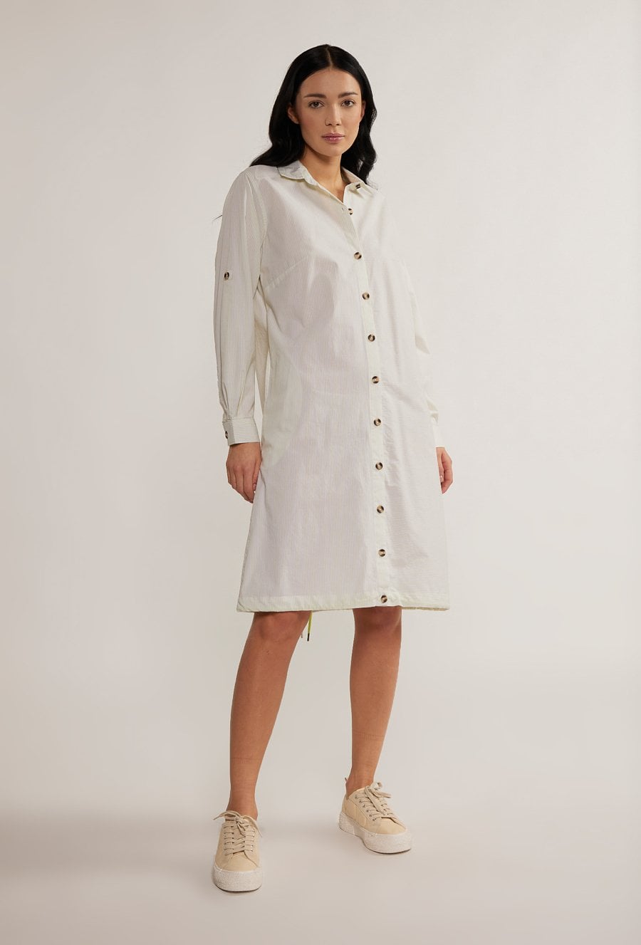 Koszulowa sukienka damska z długimi rękawami z możliwością podwinięcia do łokci oraz kołnierzem przy dekolcie. Sukienka sięgająca do kolan z ściągaczem i wiązaniem. Sukienka zapinana na guziki. Model ten idealnie sprawdzi się do codziennych stylizacji. Modelka na zdjęciu ma 177 cm wzrostu i prezentuje rozmiar 36.