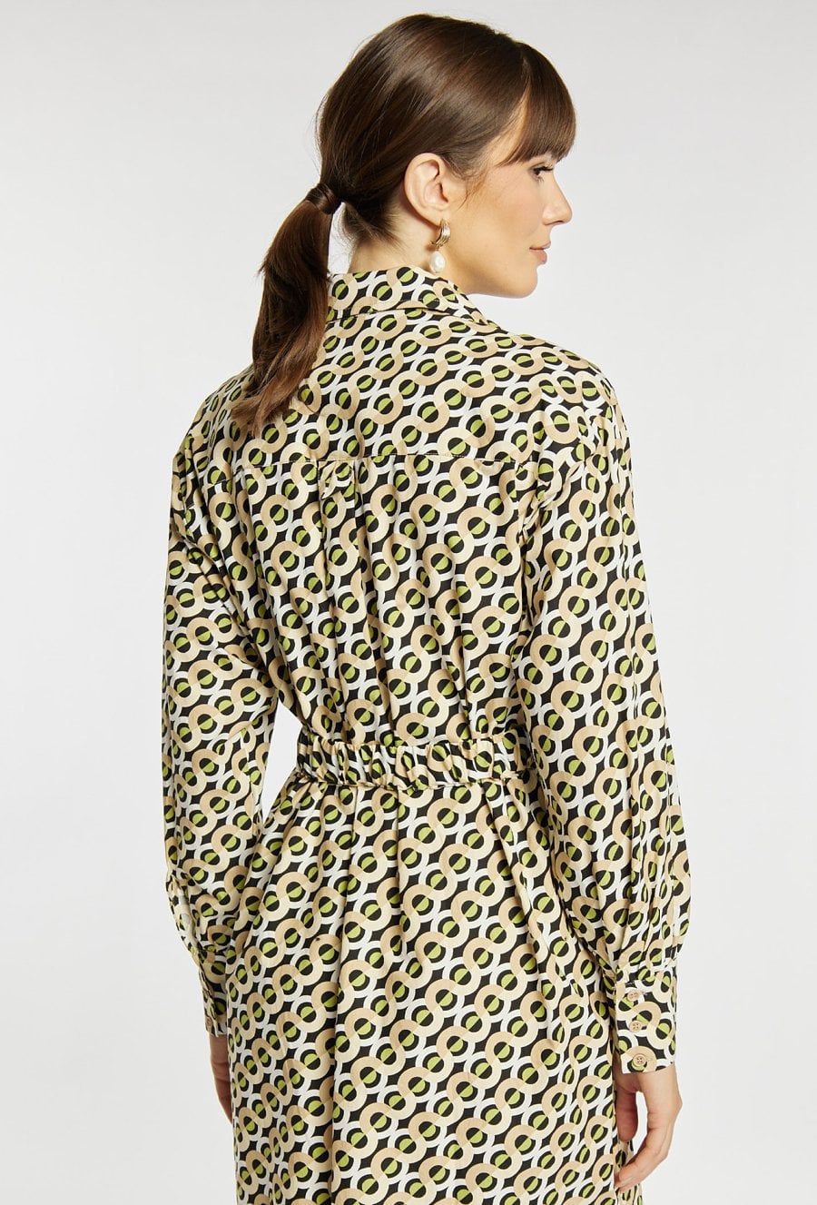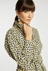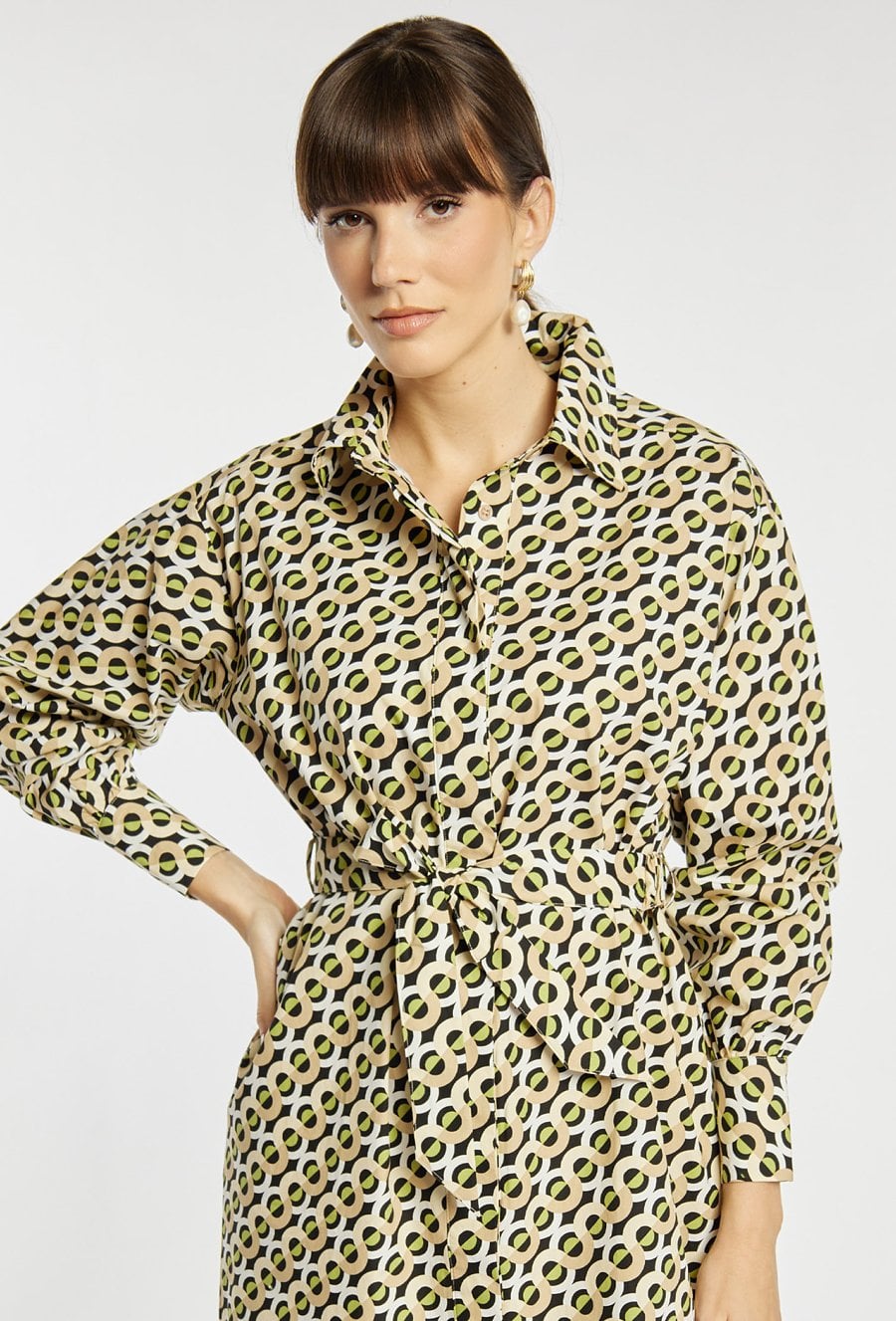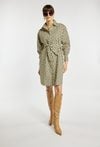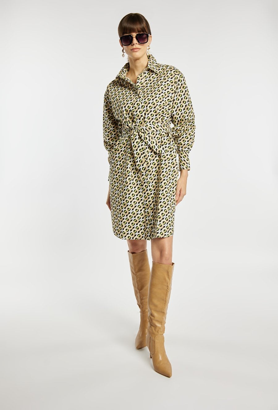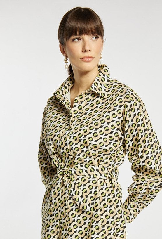 Koszulowa sukienka damska z efektownym printem na całej długości. Wyposażona w kołnierzyk, długie rękawy oraz praktyczne kieszenie. Model z wiązaniem w talii, które podkreśla sylwetkę. Idealna na wiosenne spacery i codzienne stylizacje. Modelka na zdjęciu ma 177 cm wzrostu i prezentuje rozmiar 36.