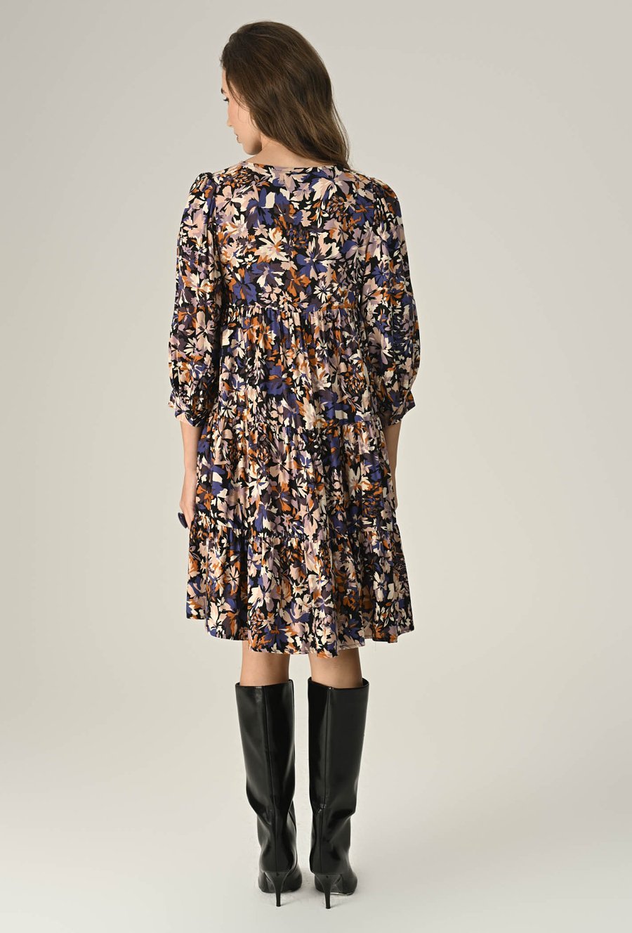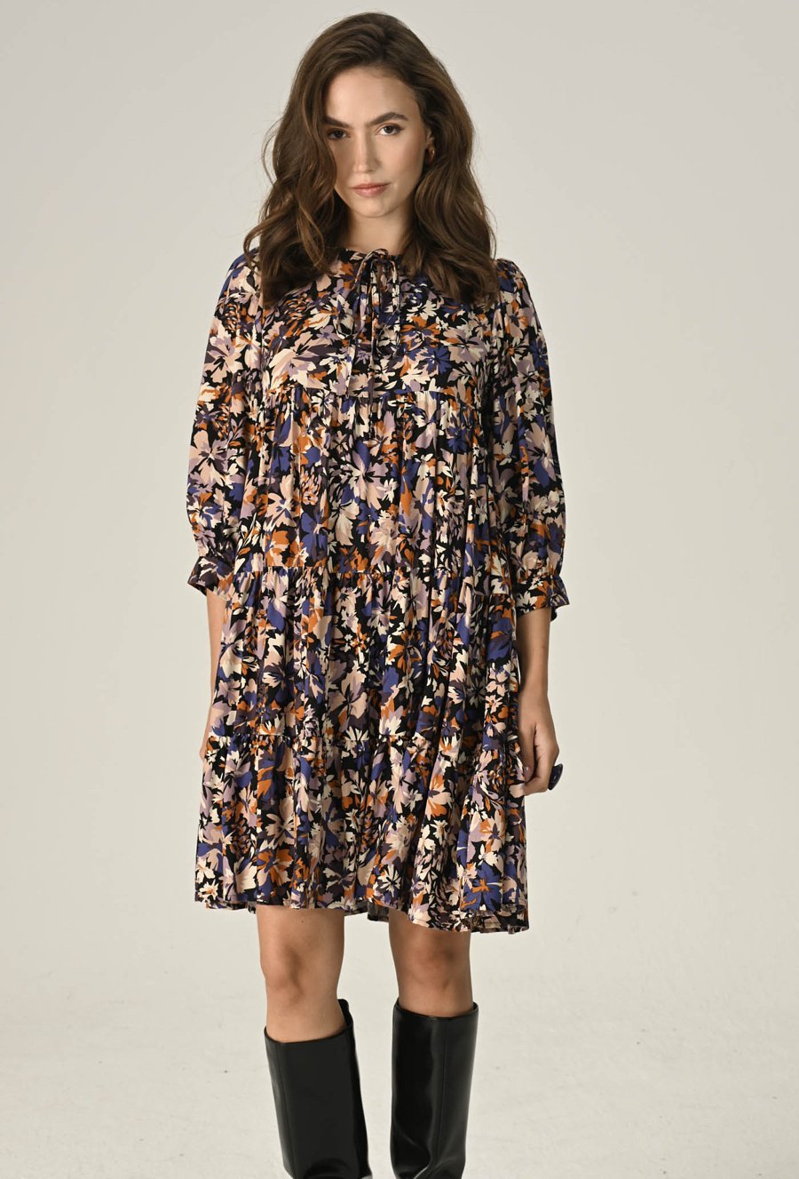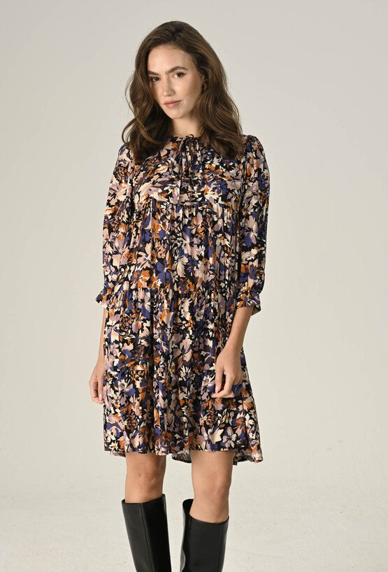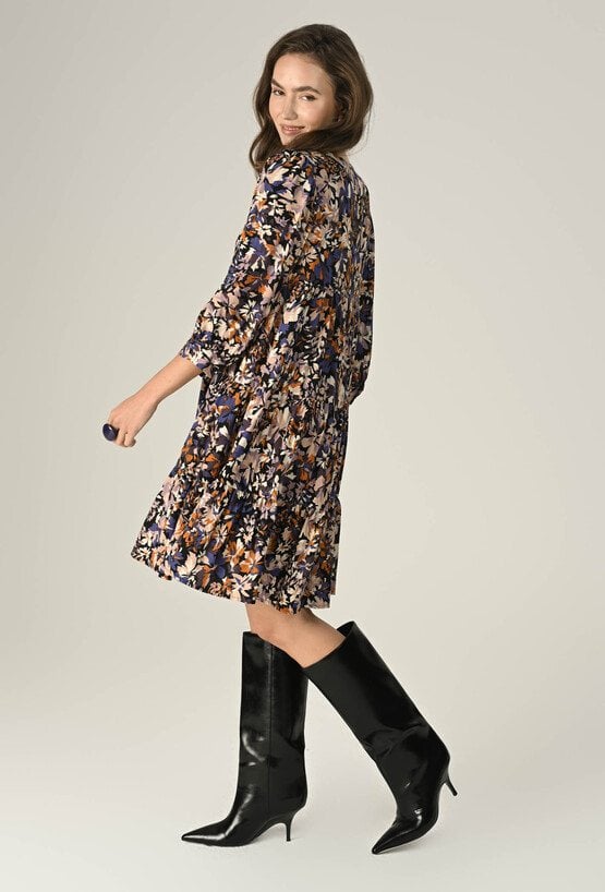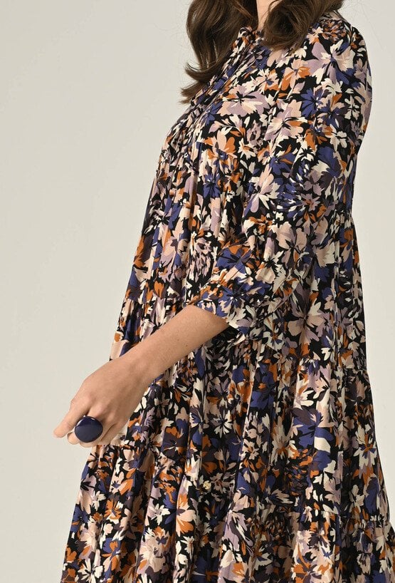 Urokliwa sukienka z lekkiej wiskozy to doskonały wybór dla miłośniczek kobiecych fasonów i romantycznych detali. Bufiaste rękawy 3/4 zakończone mankietem nadają sylwetce lekkości, a falbany dodają sukience zwiewności i subtelnego ruchu. Półokrągły dekolt z delikatnym wiązaniem podkreśla szyję i nadaje całości wyjątkowego charakteru. Idealna na spotkania, spacery i letnie okazje. Modelka na zdjęciu ma 174 cm wzrostu i prezentuje rozmiar 36.