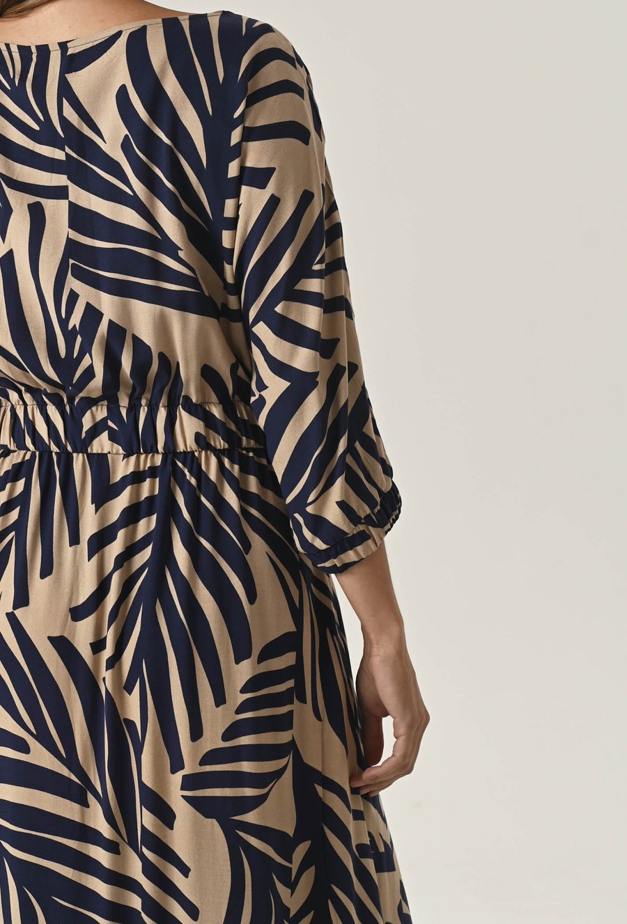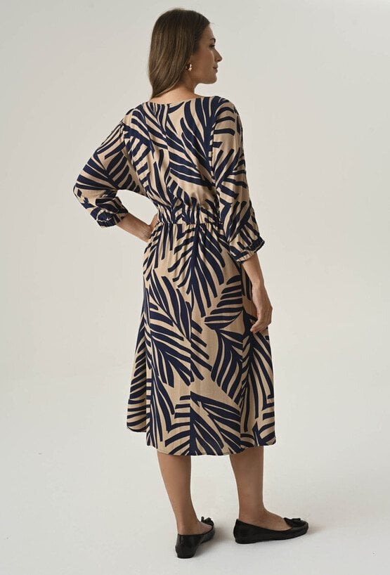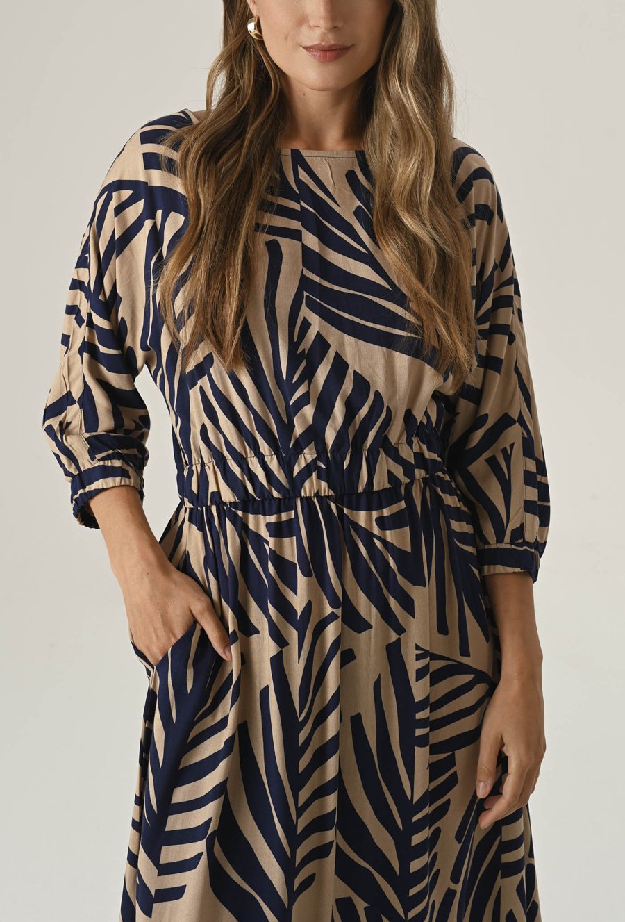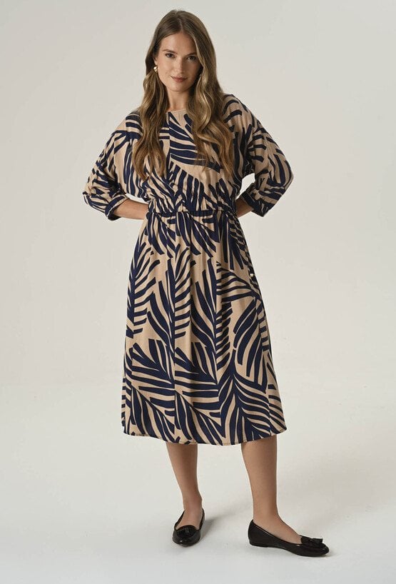Lekka i kobieca sukienka z przyjemnej wiskozy to idealna propozycja na cieplejsze dni. Półokrągły dekolt i rękawy zakończone gumką dodają jej subtelnego uroku, a elastyczna talia pięknie podkreśla sylwetkę i zapewnia wygodę noszenia. Prosty, a zarazem efektowny fason sprawdzi się zarówno na co dzień, jak i przy wyjątkowych okazjach. Modelka na zdjęciu ma 176 cm wzrostu i prezentuje rozmiar S