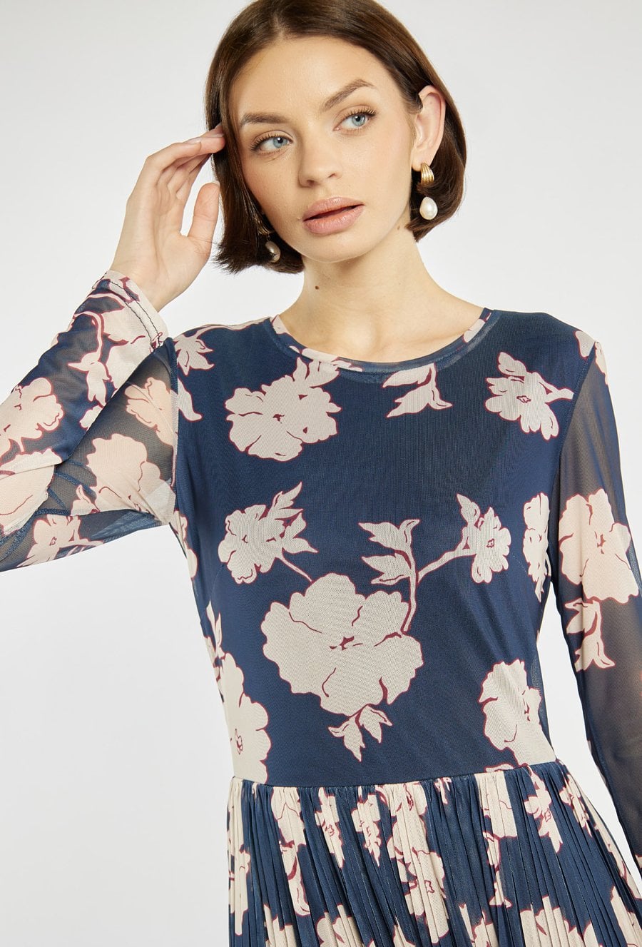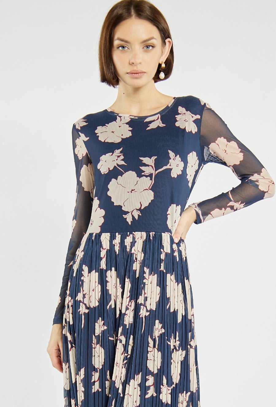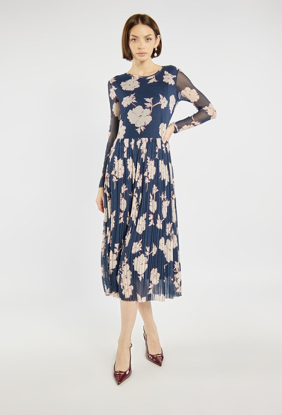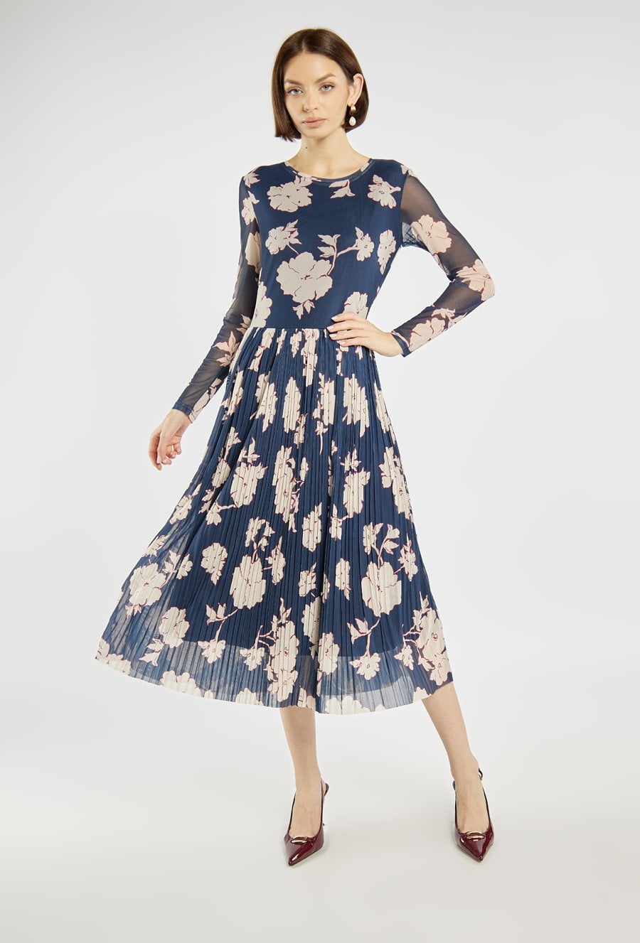 Zjawiskowa sukienka damska o długości midi. Góra z długimi, półtransparentnymi rękawami dodaje całości elegancji, a plisowany dół nadaje lekkości i kobiecego uroku. Doskonała propozycja na specjalne okazje, spotkania czy wiosenne przyjęcia. Modelka na zdjęciu ma 177 cm wzrostu i prezentuje rozmiar S.