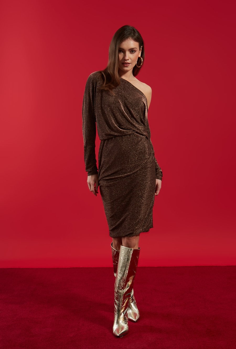 Połyskująca sukienka ze ściągaczem w talii, który pięknie podkreśli sylwetkę. Sukienka z długimi rękawami oraz obniżoną linią ramion. Ma głęboki dekolt w łódkę, który romantycznie opada z ramienia. Model ten świetnie sprawdzi się na wyjątkowe okazjach i sprawi , że będziesz wyglądała zjawiskowo. . Modelka na zdjęciu ma 175 cm wzrostu i prezentuje rozmiar 36.