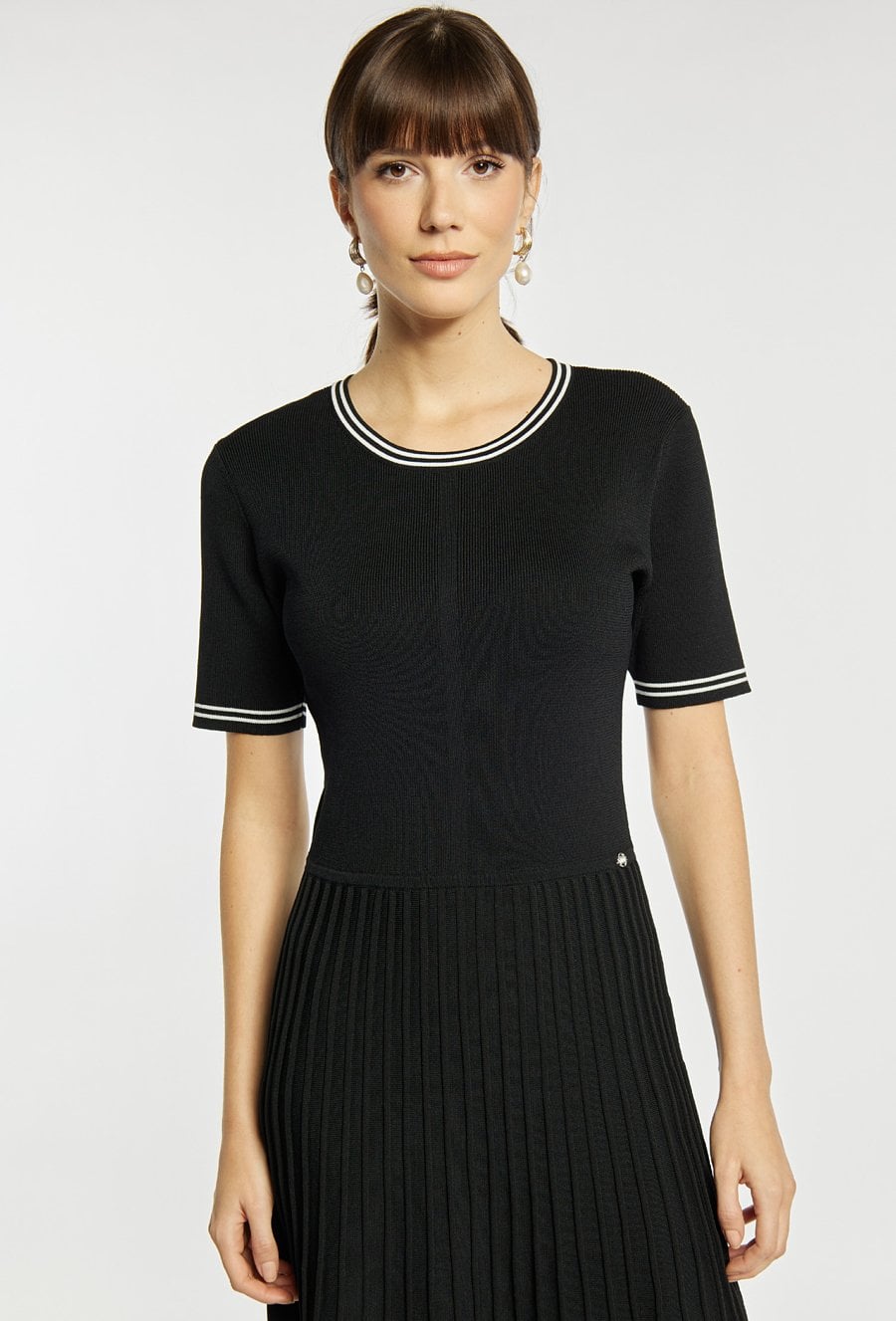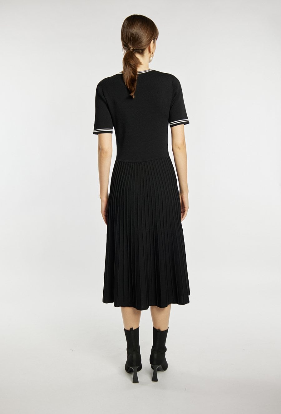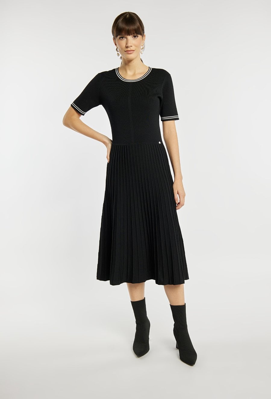 Sukienka o kobiecym, rozkloszowanym fasonie z krótkim rękawem i eleganckim plisowanym dołem. Sukienka podkreśla sylwetkę w górnej części, a plisowany dół dodaje jej lekkości i ponadczasowego charakteru- idealna na co dzień i na bardziej eleganckie wyjścia. Modelka na zdjęciu ma 177 cm wzrostu i prezentuje rozmiar S.