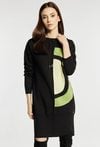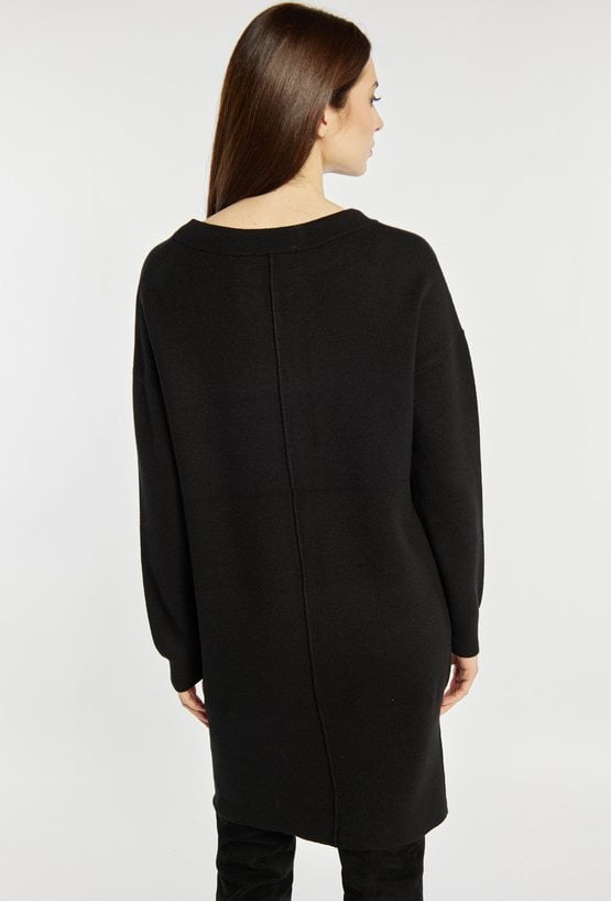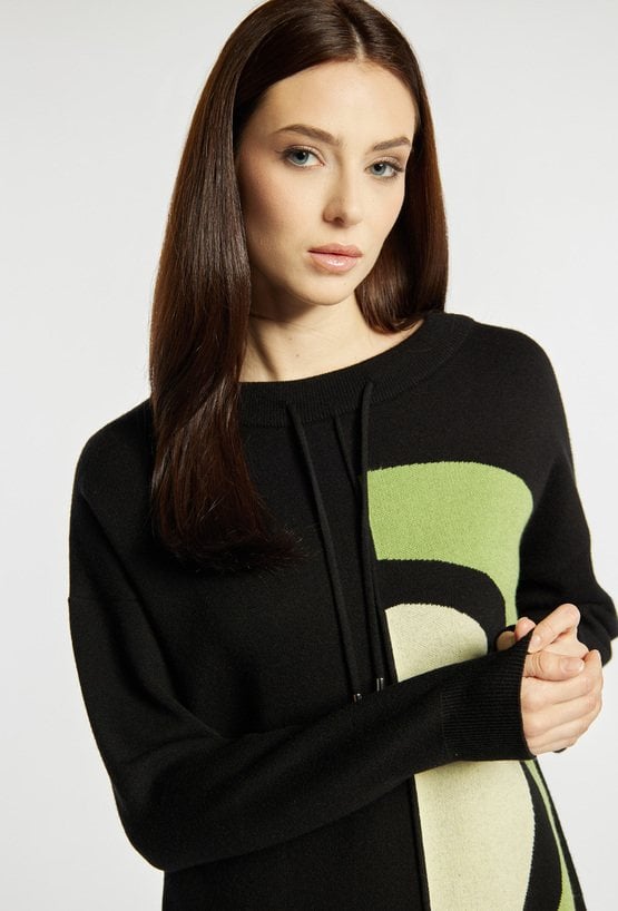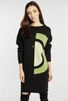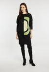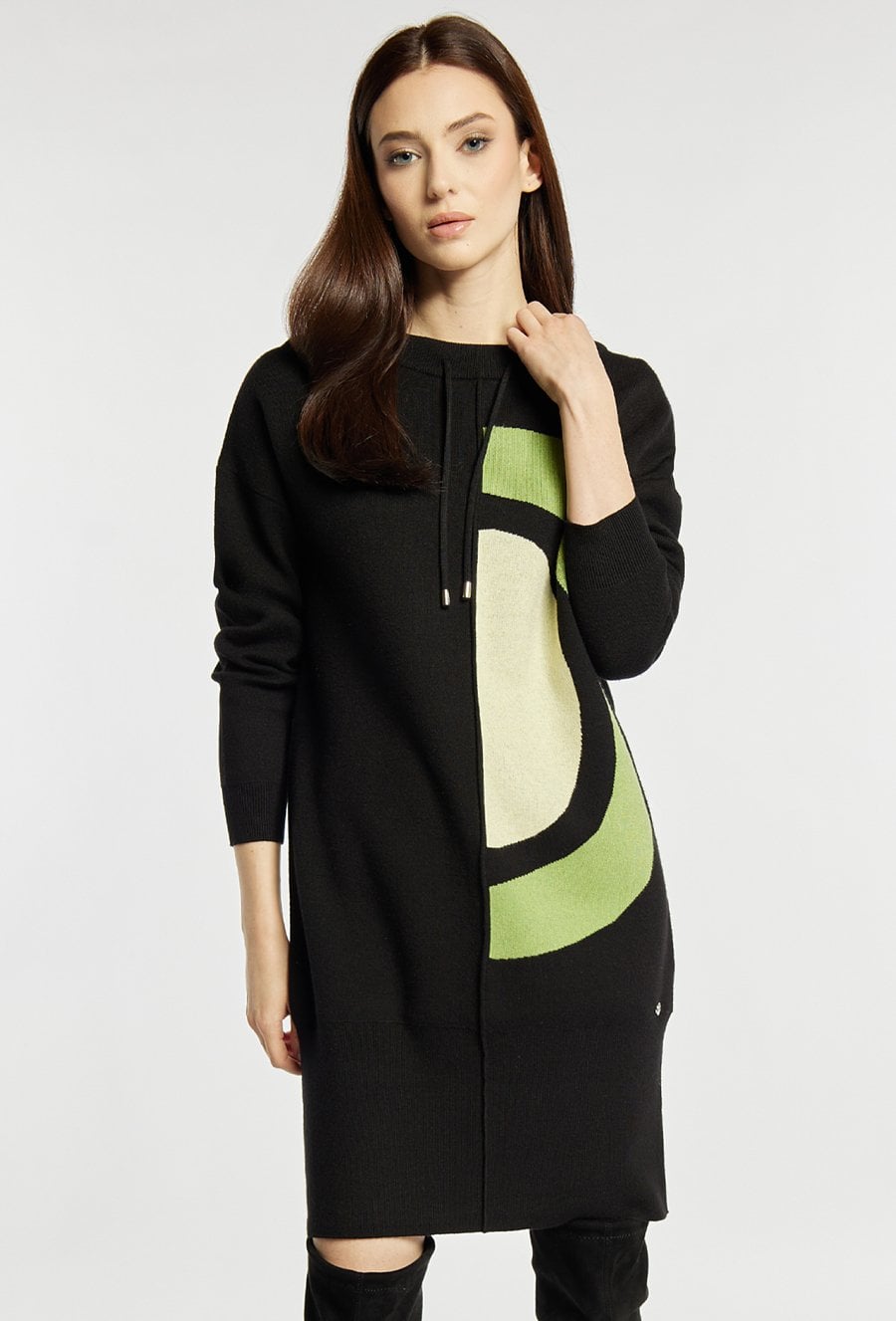 Sukienka damska o prostym, swobodnym kroju w czarnym kolorze. Sukienka ma długie rękawy oraz okrągły dekolt z troczkami. Sukienka wyróżnia się dużym, efektownym wzorem. Idealna na co dzień, zapewnia wygodę i nowoczesny charakter stylizacji. Modelka na zdjęciu ma 177 cm wzrostu i prezentuje rozmiar S.