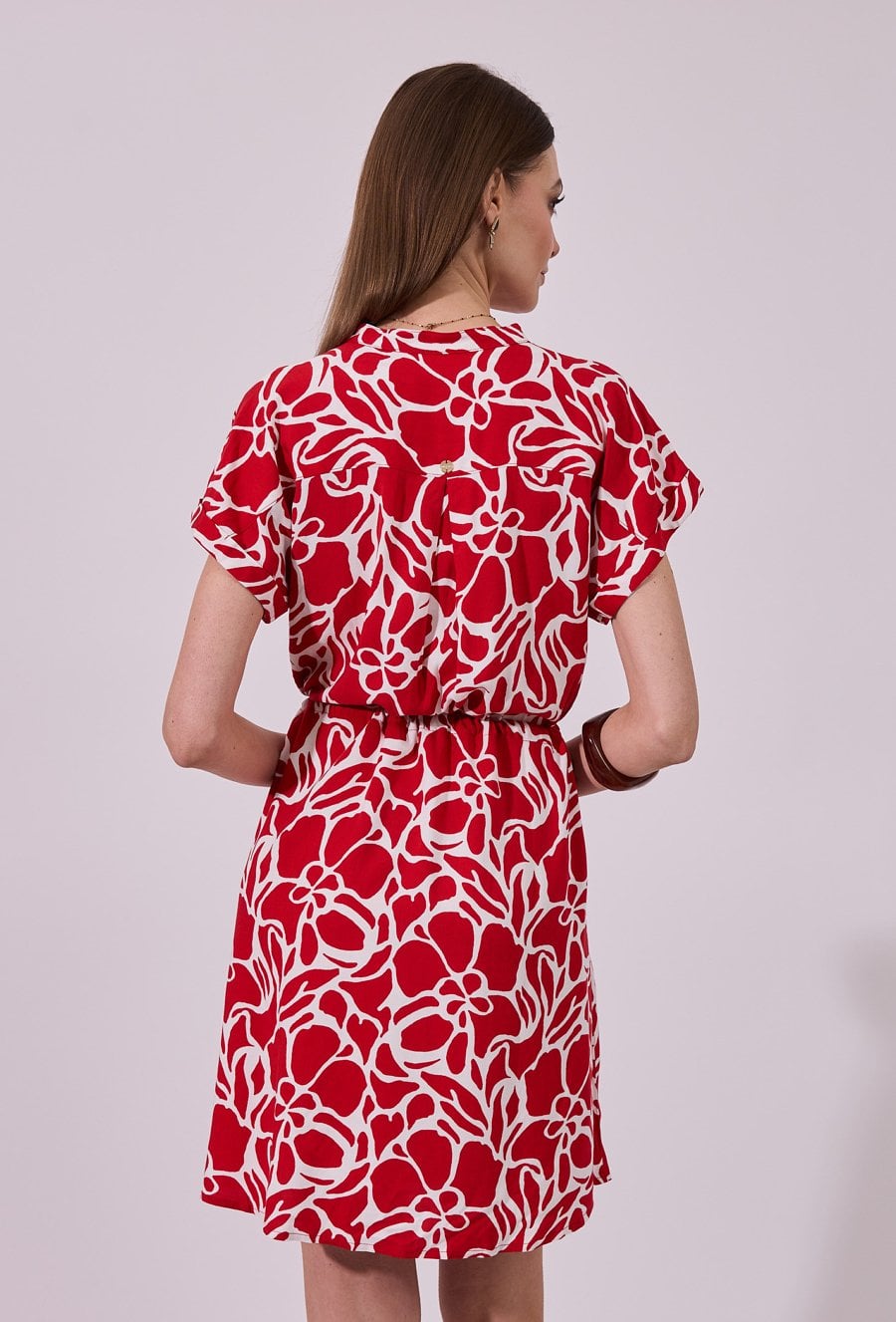 Sukienka damska o swobodnym, lekko rozkloszowanym kroju. Model o długości przed kolano z krótkim rękawem oraz dekoltem w kształcie litery V wykończonym subtelną stójką. Całość zdobi efektowny, graficzny wzór, który nadaje stylizacji nowoczesnego charakteru. Dodatkowym atutem są praktyczne kieszenie po bokach. Modelka na zdjęciu ma 177 cm wzrostu i prezentuje rozmiar 36.