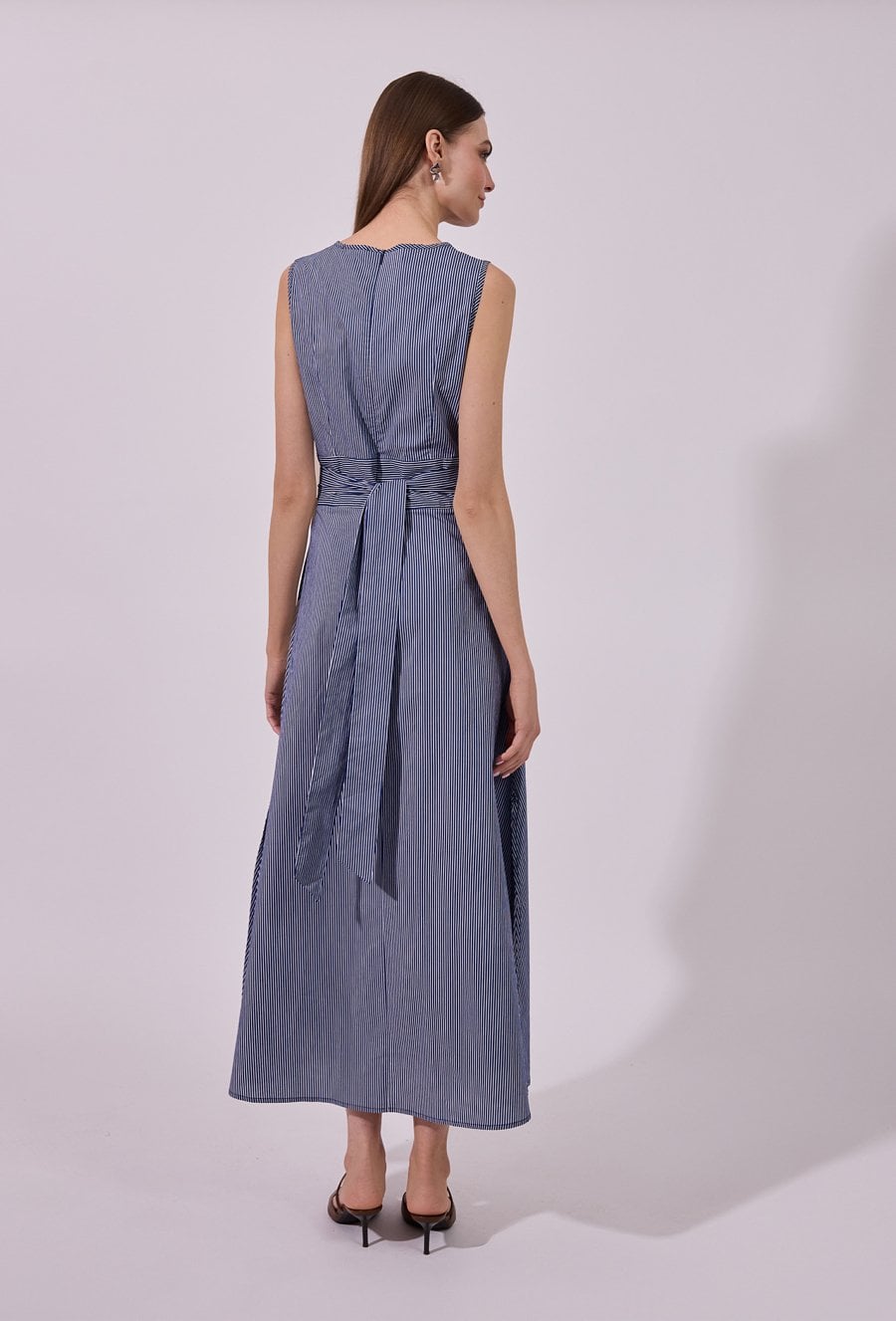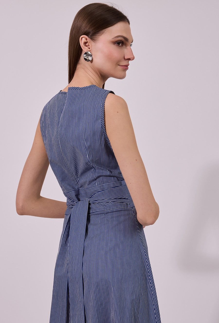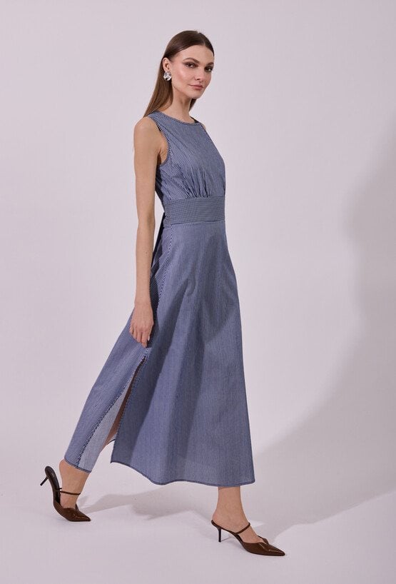 Sukienka damska o eleganckim, rozkloszowanym kroju maxi bez rękawów. Model z klasycznym, zabudowanym dekoltem, który nadaje całości minimalistycznego, ponadczasowego charakteru. W tylnej części zastosowano wiązanie, które podkreśla talię i pozwala na indywidualne dopasowanie fasonu. Modelka na zdjęciu ma 177 cm wzrostu i prezentuje rozmiar 36.