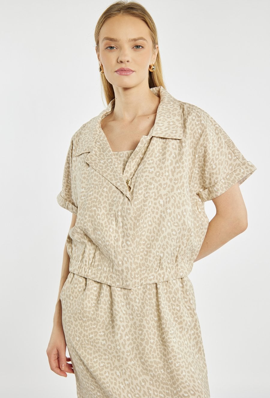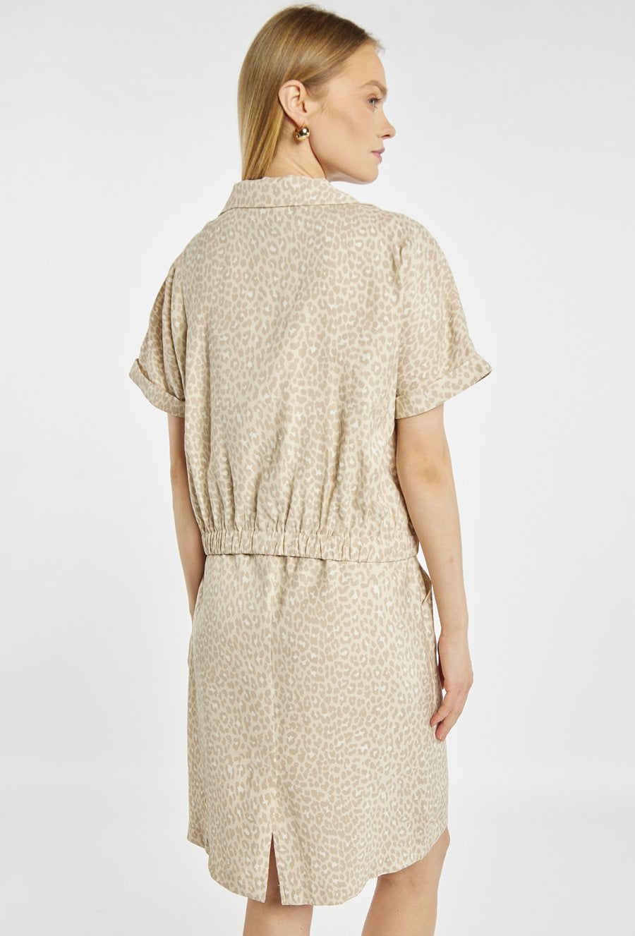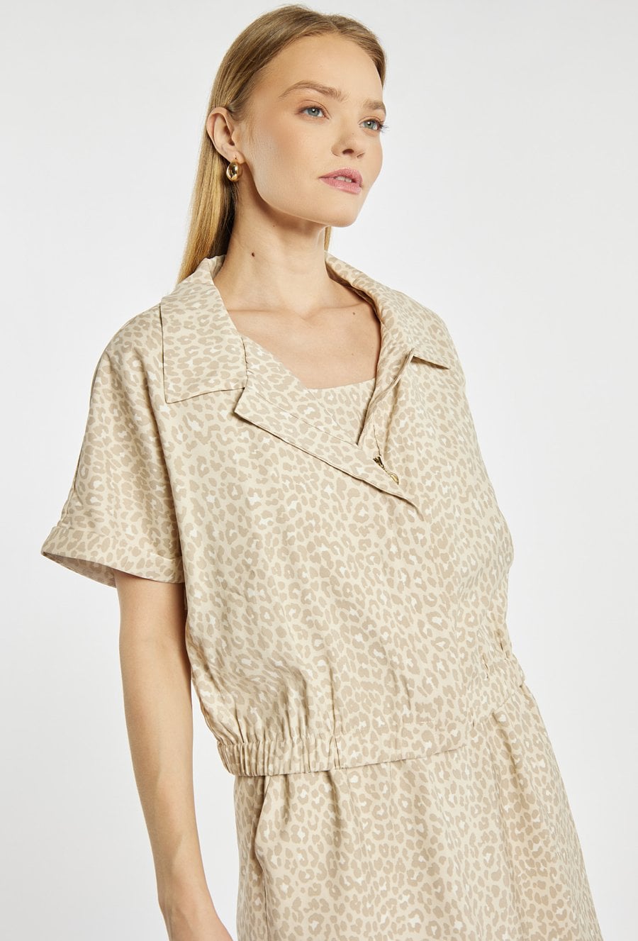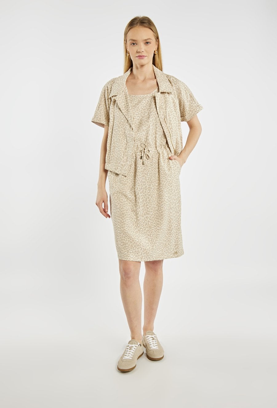 Sukienka damska midi w zestawie z lekką narzutką. Sukienka na ramiączkach, z wiązaniem w talii, które pozwala dopasować fason do sylwetki. W komplecie znajduje się krótka koszulka/narzutka z krótkim rękawem, idealnie dopasowana kolorystycznie i stylistycznie do sukienki. Sukienka w jasnym kolorze z subtelnym zwierzęcym wzorem. Modelka na zdjęciu ma 177 cm wzrostu i prezentuje rozmiar 36.