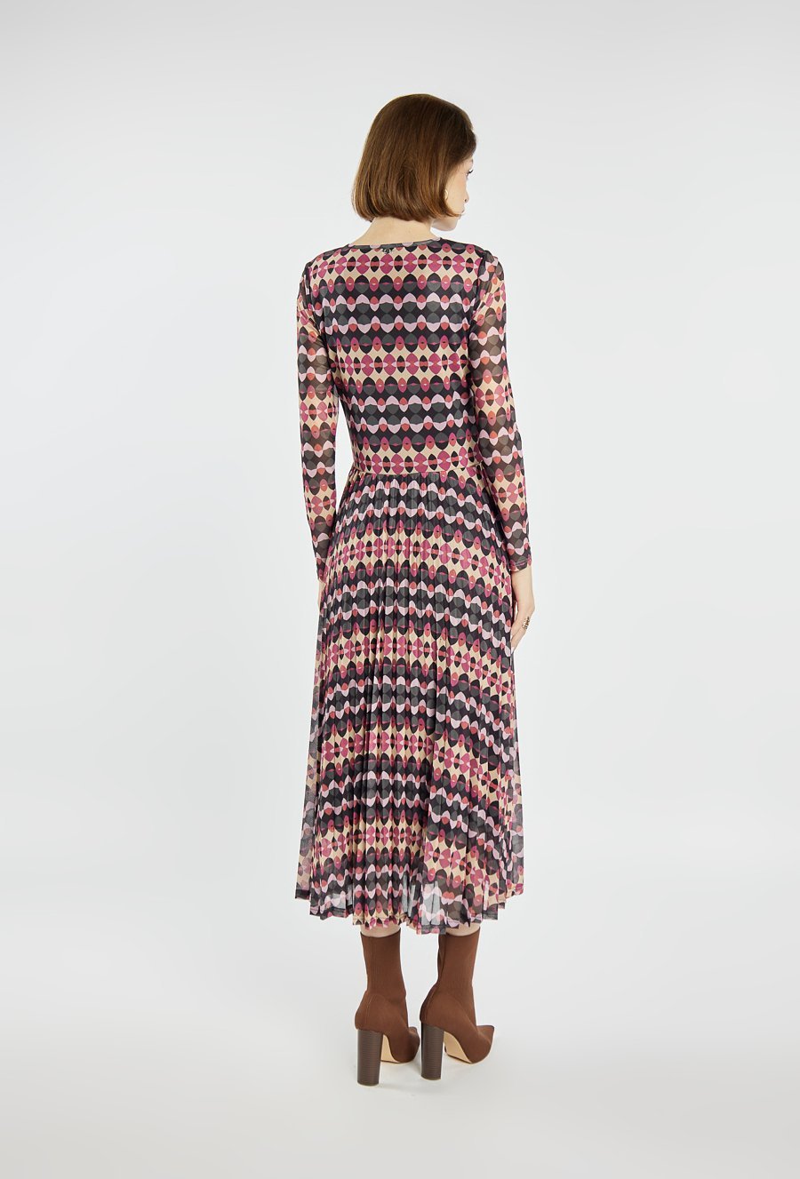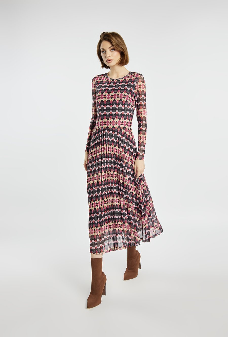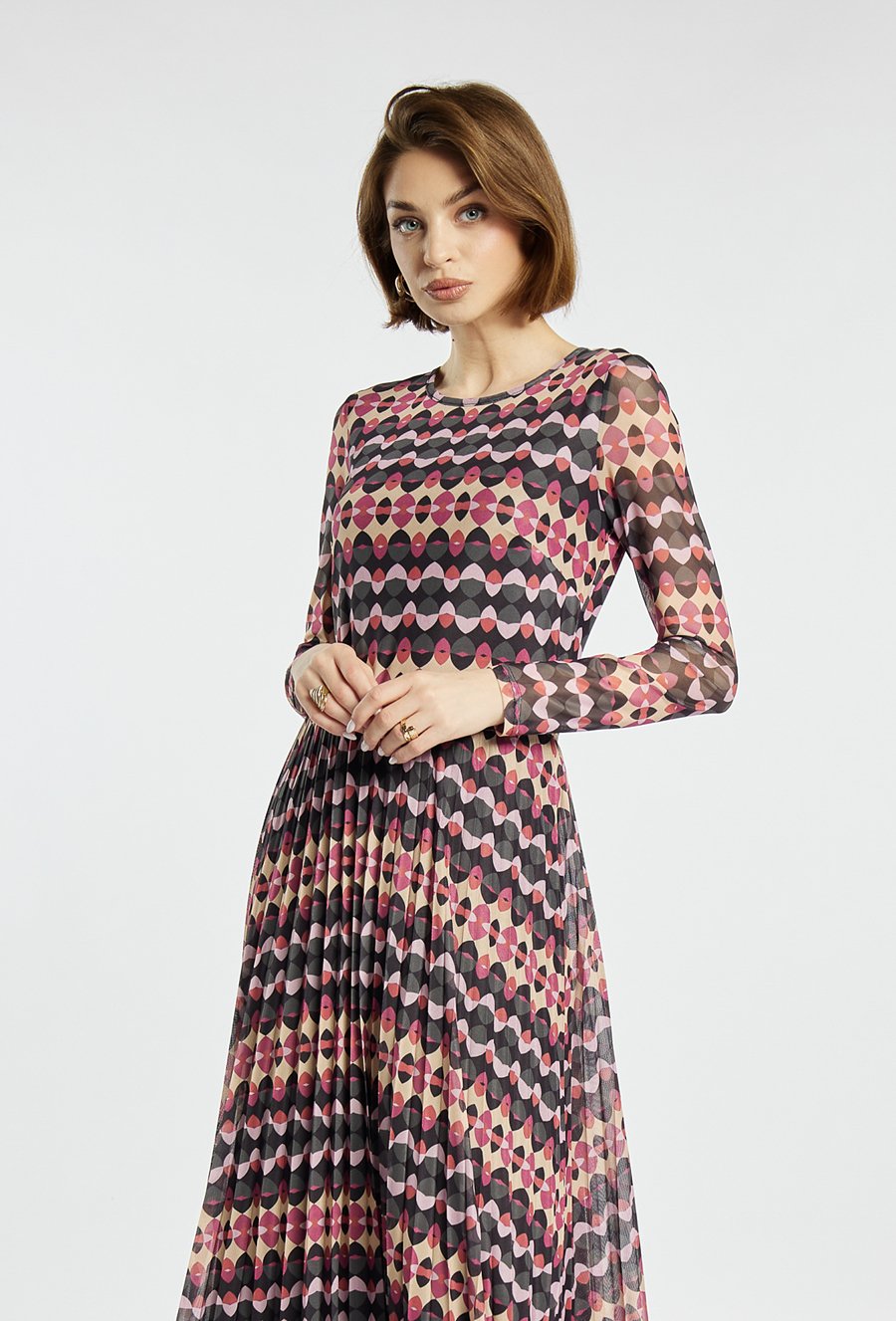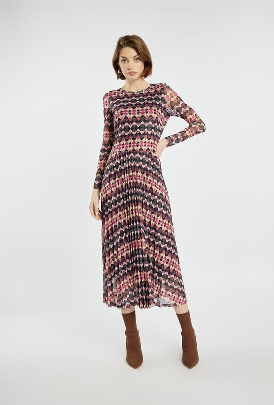 Sukienka damska midi z długim rękawem. Sukienka z okrągłym dekoltem oraz plisowaną spódnicą, która nadaje całości eleganckiego charakteru. Dopasowana góra i zwiewny dół podkreślają kobiecą sylwetkę. Idealna propozycja na specjalne okazje oraz wieczorne wyjścia. Modelka na zdjęciu ma 177 cm wzrostu i prezentuje rozmiar 36.