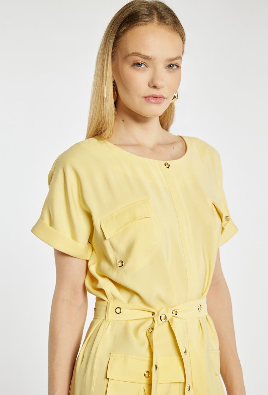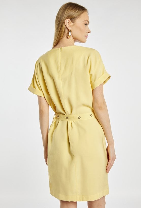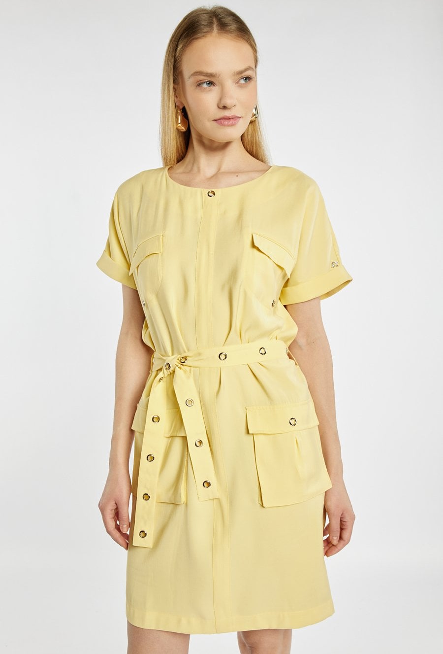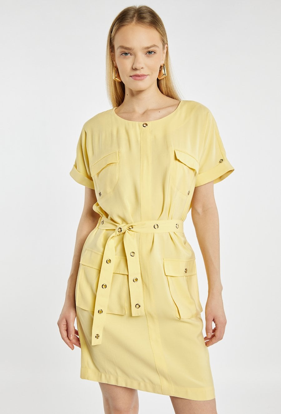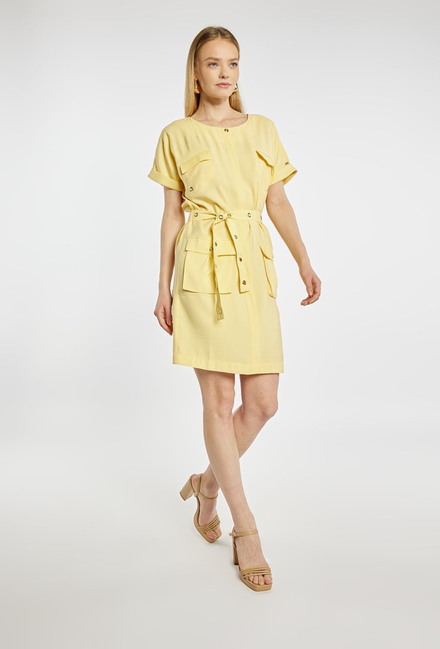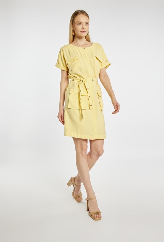 Sukienka mini o nowoczesnym, casualowym fasonie. Sukienka z okrągłym dekoltem, krótkimi rękawami oraz praktycznymi kieszeniami z przodu. Pasek w talii z metalowymi oczkami pozwala dopasować sukienkę do sylwetki i nadaje całości wyrazistego charakteru. Modelka na zdjęciu ma 177 cm wzrostu i prezentuje rozmiar 36.