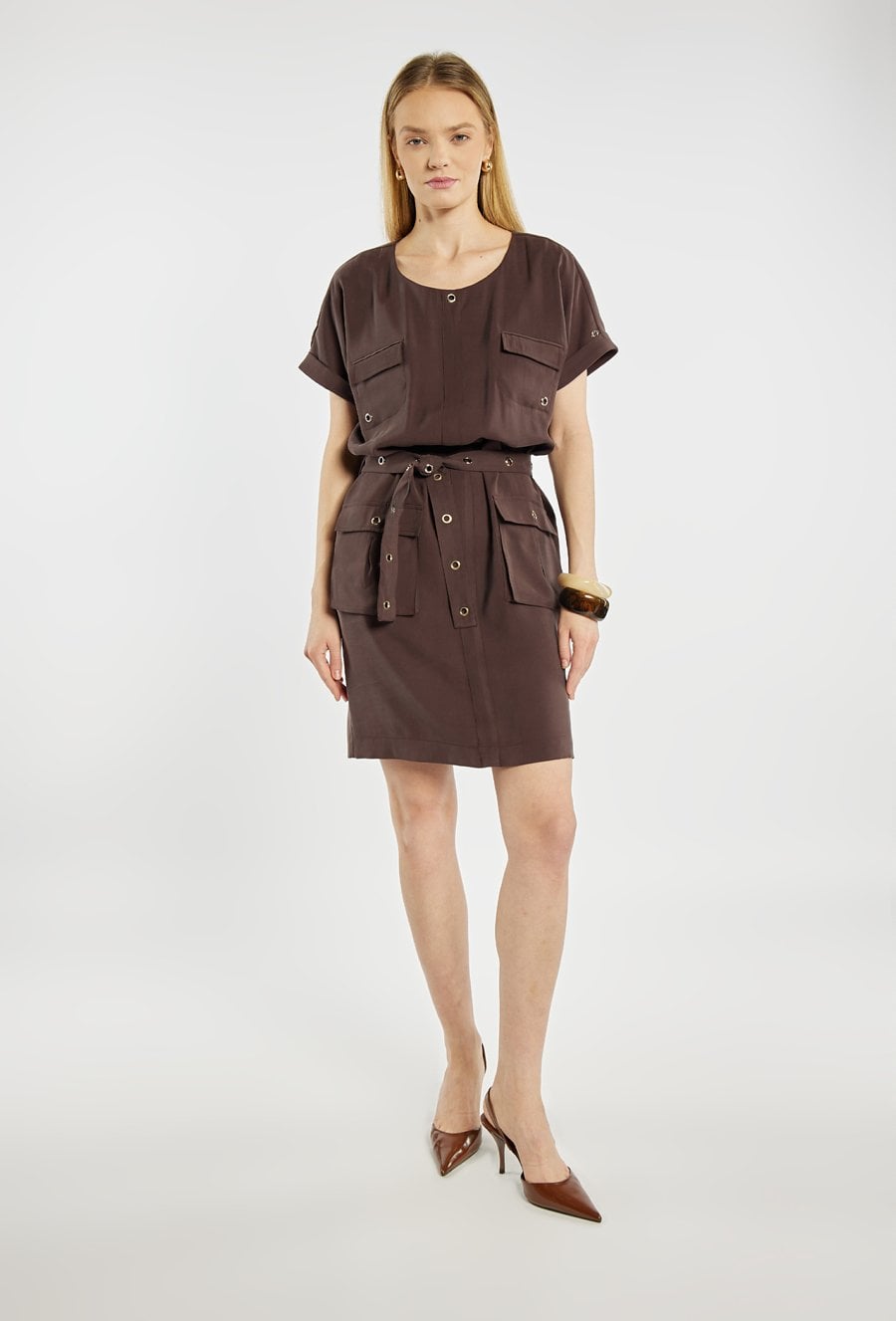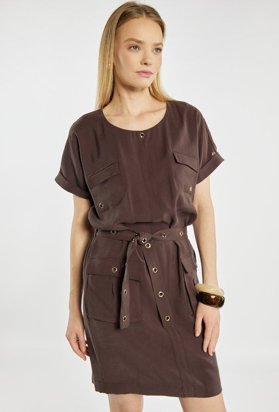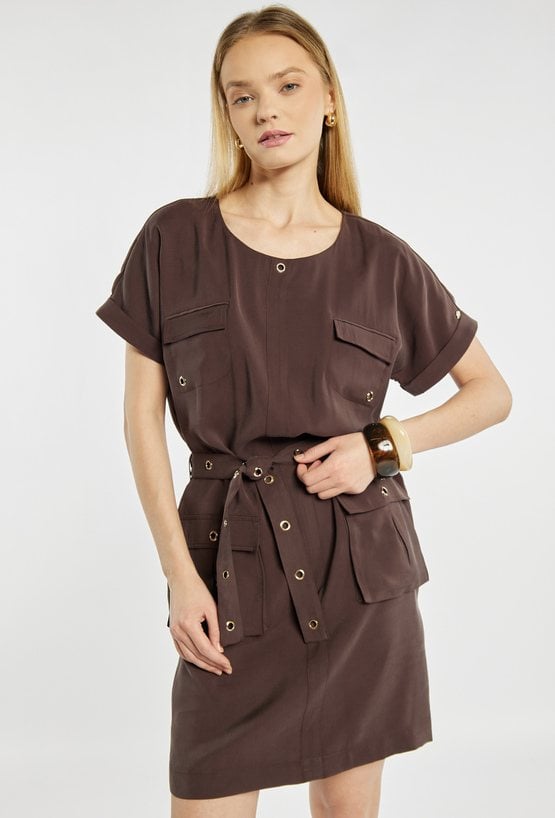 Sukienka mini o nowoczesnym, casualowym fasonie. Sukienka z okrągłym dekoltem, krótkimi rękawami oraz praktycznymi kieszeniami z przodu. Pasek w talii z metalowymi oczkami pozwala dopasować sukienkę do sylwetki i nadaje całości wyrazistego charakteru. Modelka na zdjęciu ma 177 cm wzrostu i prezentuje rozmiar 36.