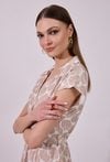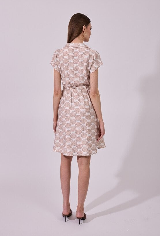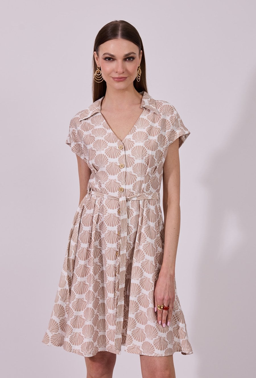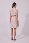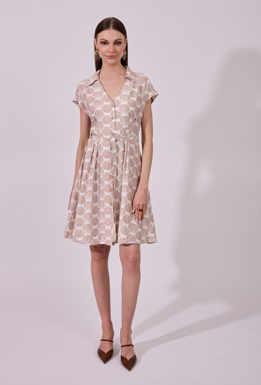 Sukienka damska o rozkloszowanym kroju mini z krótkim rękawem. W talii zastosowano wiązanie, pozwalające na podkreślenie sylwetki i dopasowanie fasonu. Lekki, przyjemny materiał zapewnia komfort noszenia, a subtelny wzór dodaje stylizacji świeżości. Modelka na zdjęciu ma 177 cm wzrostu i prezentuje rozmiar S.