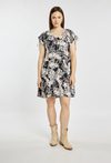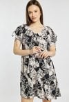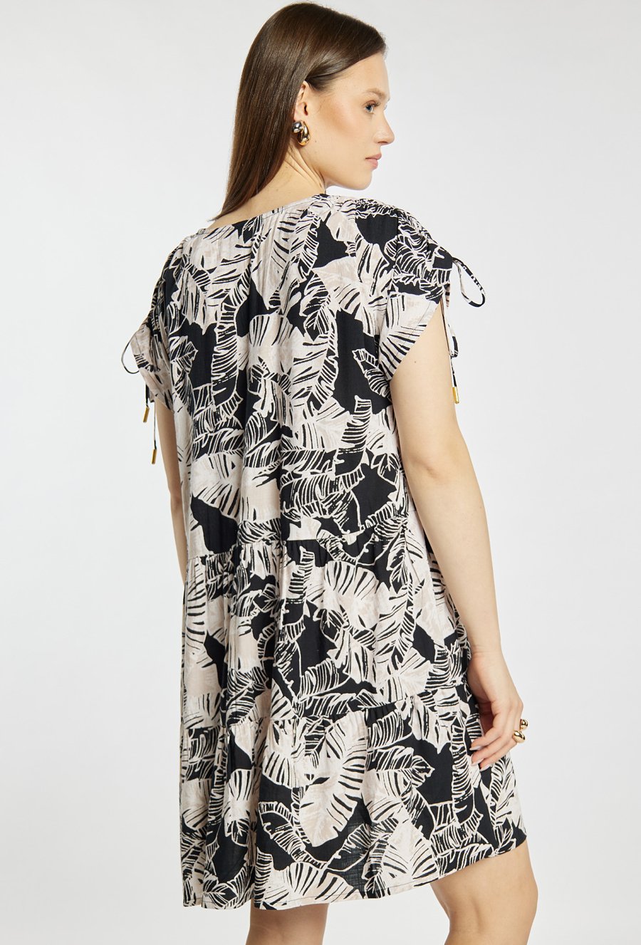 Sukienka mini o swobodnym fasonie z delikatnie marszczonymi poziomymi przeszyciami, które nadają całości lekkości i kobiecego uroku. Sukienka z krótkim rękawem i dekoltem w serek, wykończonym wiązaniem. Kwiatowo-roślinny print wprowadza wakacyjny klimat -świetnie sprawdzi się zarówno na urlopie, jak i w codziennych stylizacjach. Modelka na zdjęciu ma 177 cm wzrostu i prezentuje rozmiar 36.