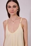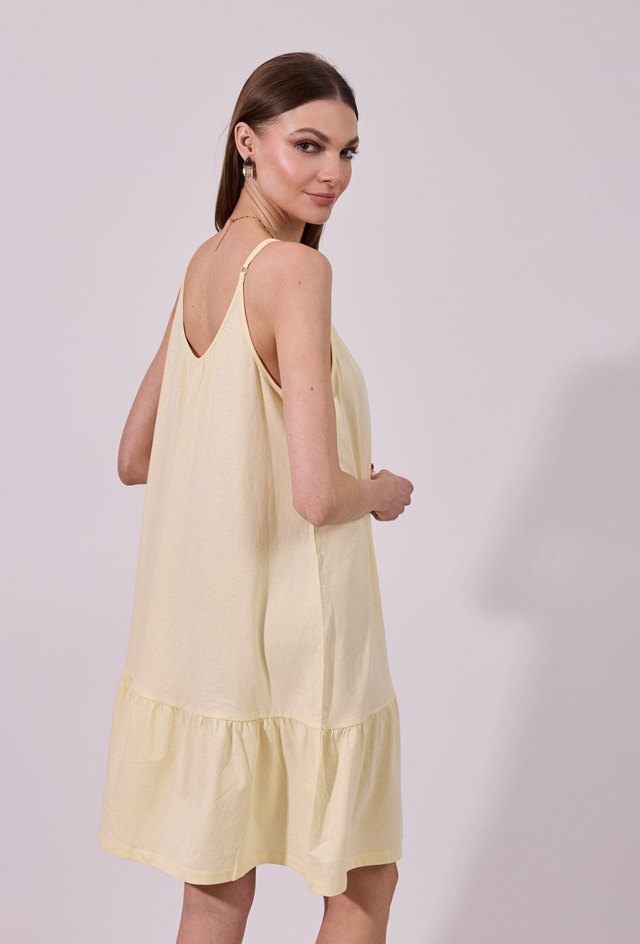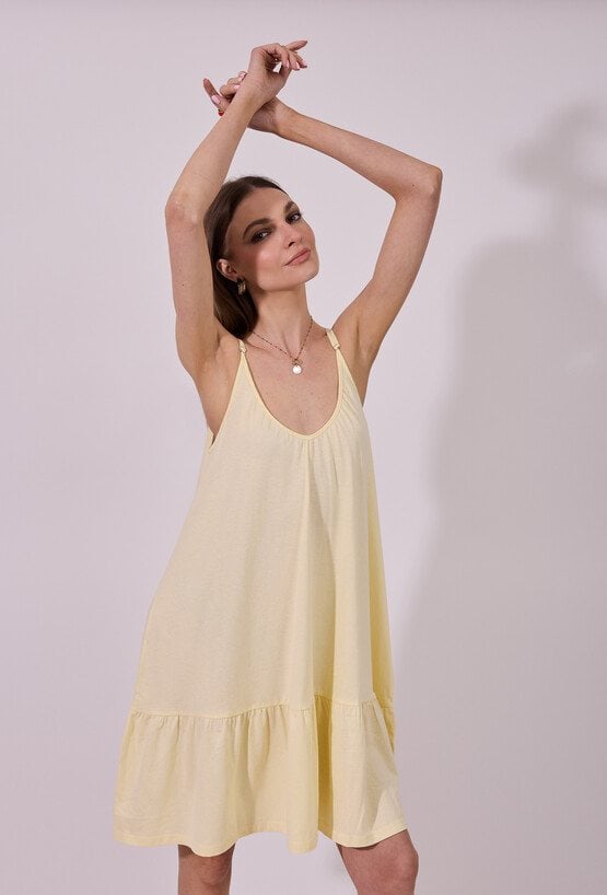 Sukienka damska o lekkim, zwiewnym kroju na cienkich ramiączkach. Model z dekoltem w kształcie litery V. Dół wykończony falbaną dodaje lekkości i swobody ruchu. Wykonana z przyjemnego, przewiewnego materiału, idealnie sprawdzi się w letnich, codziennych stylizacjach oraz podczas wakacyjnych wyjazdów. Modelka na zdjęciu ma 177 cm wzrostu i prezentuje rozmiar S.