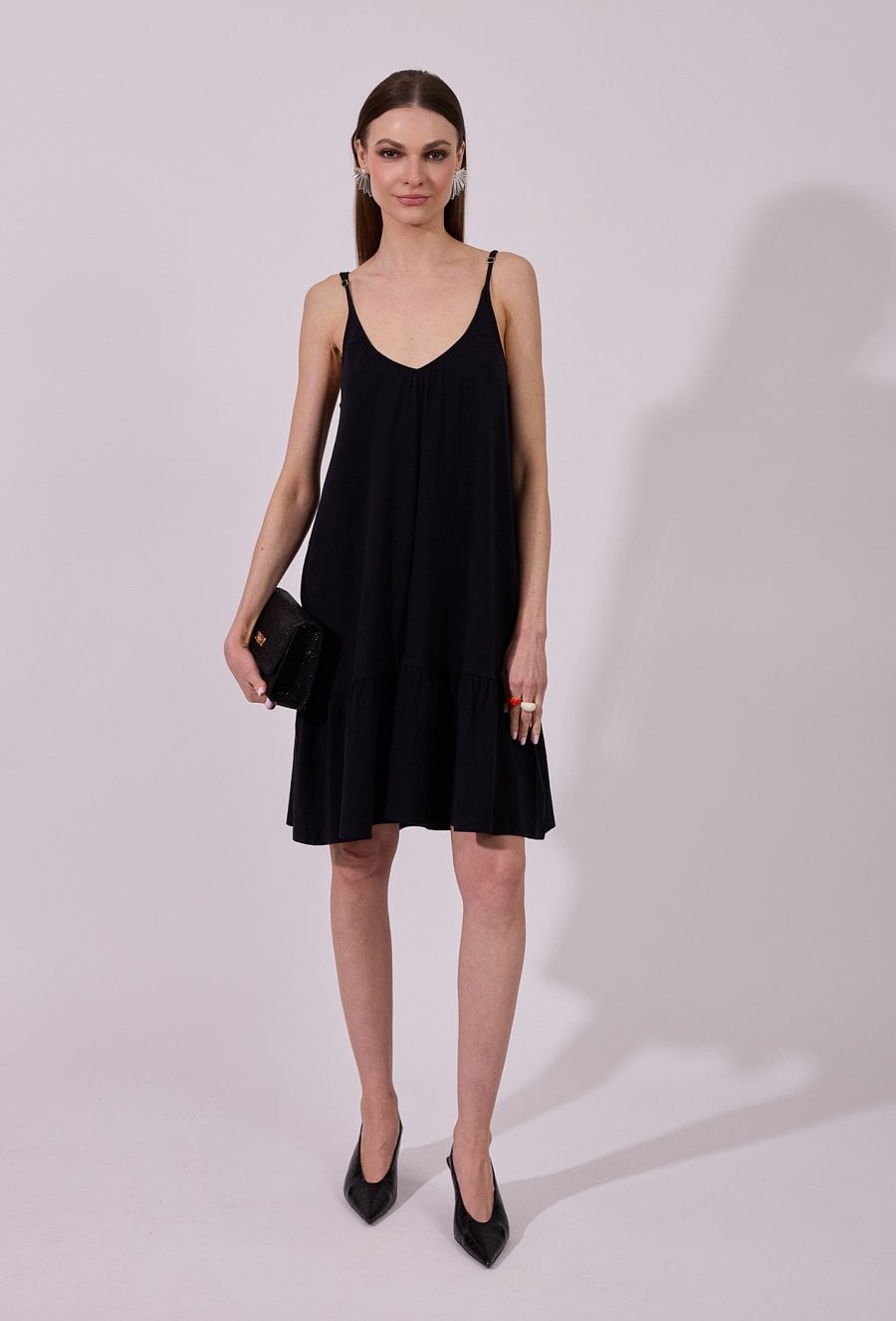 Sukienka damska o lekkim, zwiewnym kroju na cienkich ramiączkach. Model z dekoltem w kształcie litery V. Dół wykończony falbaną dodaje lekkości i swobody ruchu. Wykonana z przyjemnego, przewiewnego materiału, idealnie sprawdzi się w letnich, codziennych stylizacjach oraz podczas wakacyjnych wyjazdów. Modelka na zdjęciu ma 177 cm wzrostu i prezentuje rozmiar S.