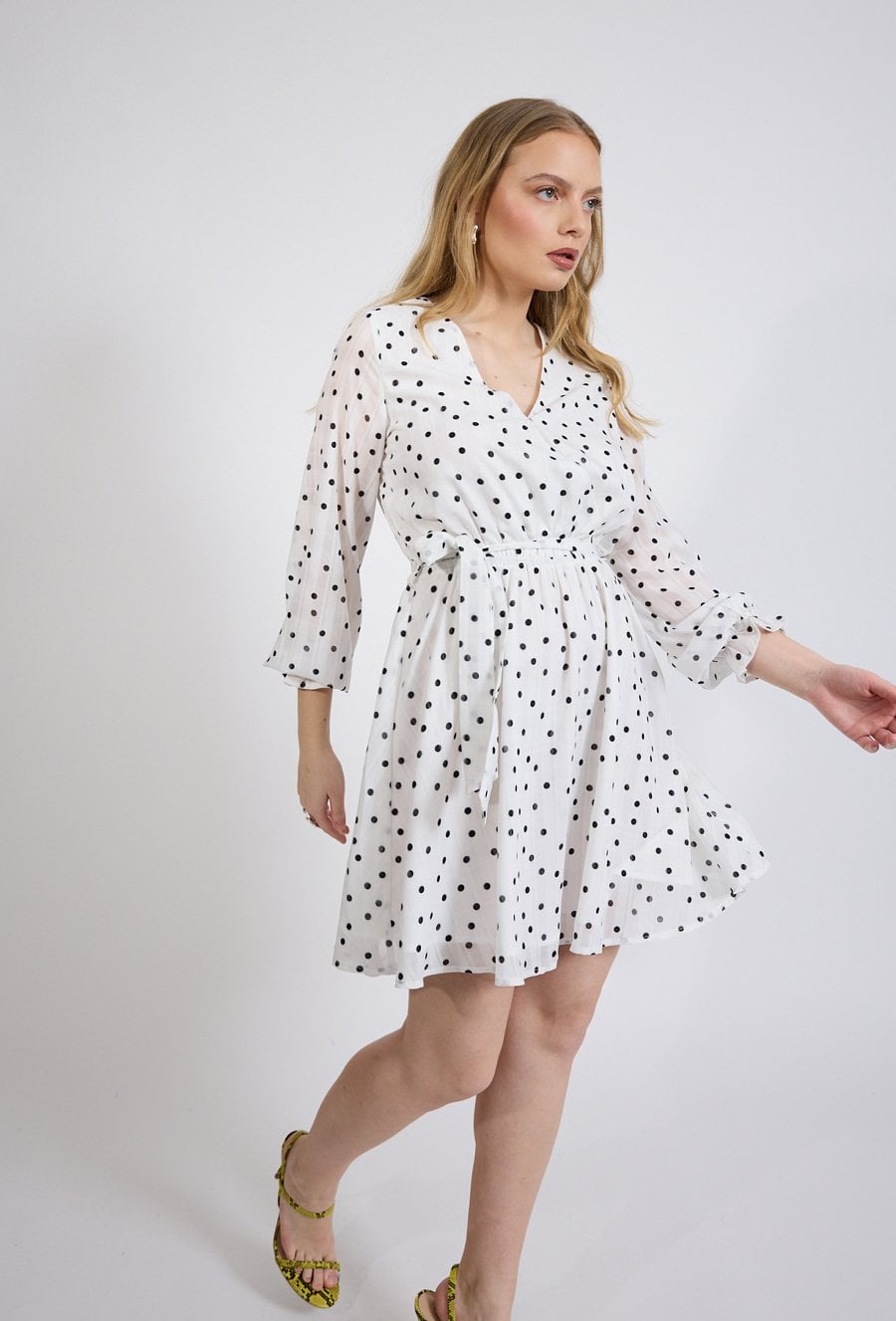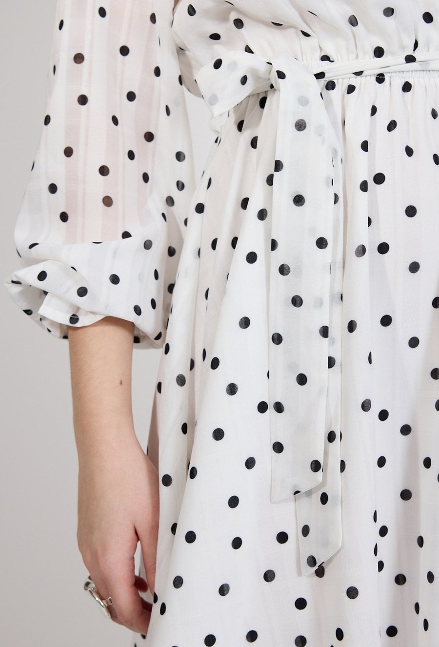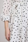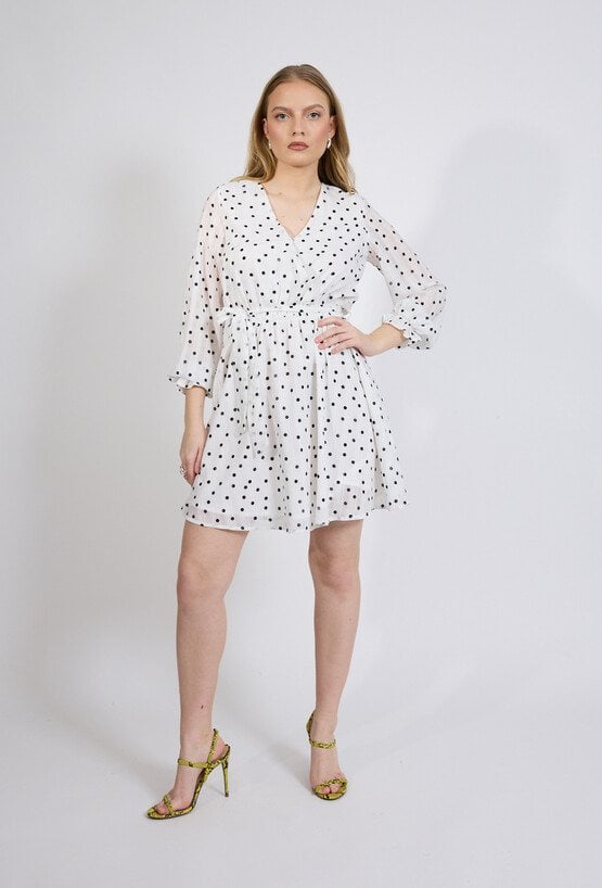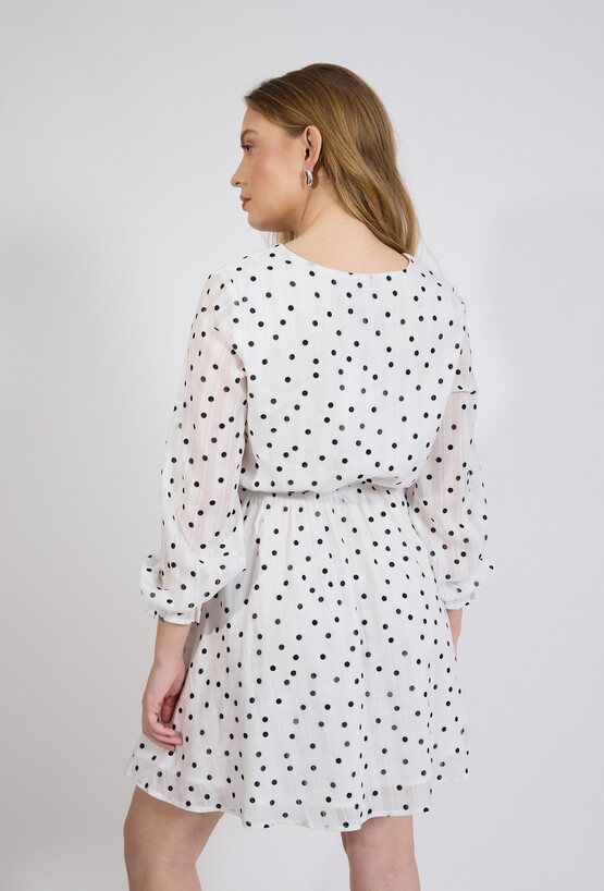 Sukienka damska o lekkim, kobiecym kroju. Model o długości przed kolano z długim rękawem zakończonym delikatnym marszczeniem oraz dekoltem w kształcie litery V, który subtelnie podkreśla linię szyi. Całość zdobi ponadczasowy wzór w kropki. Modelka na zdjęciu ma 177 cm wzrostu i prezentuje rozmiar 36.