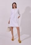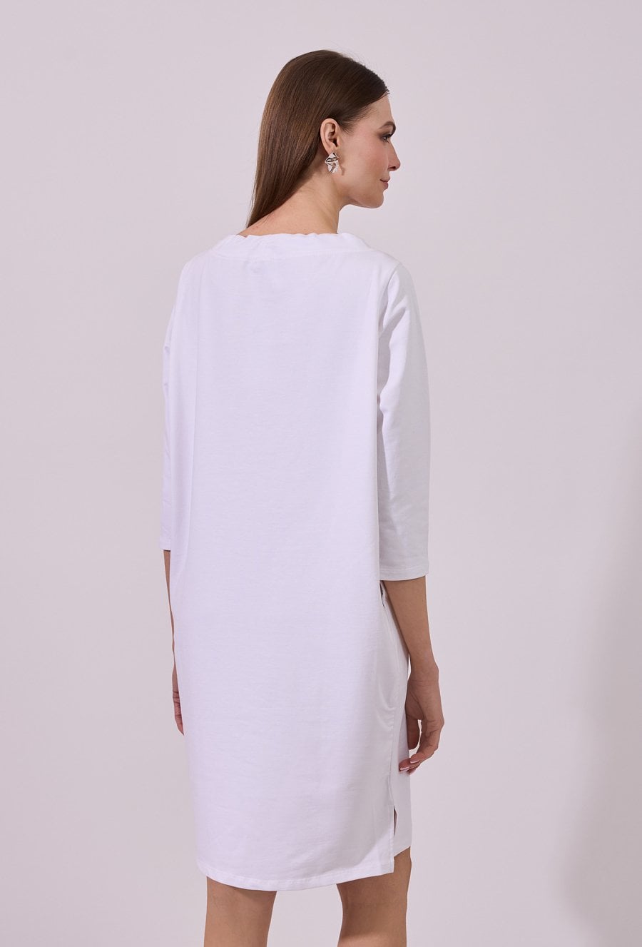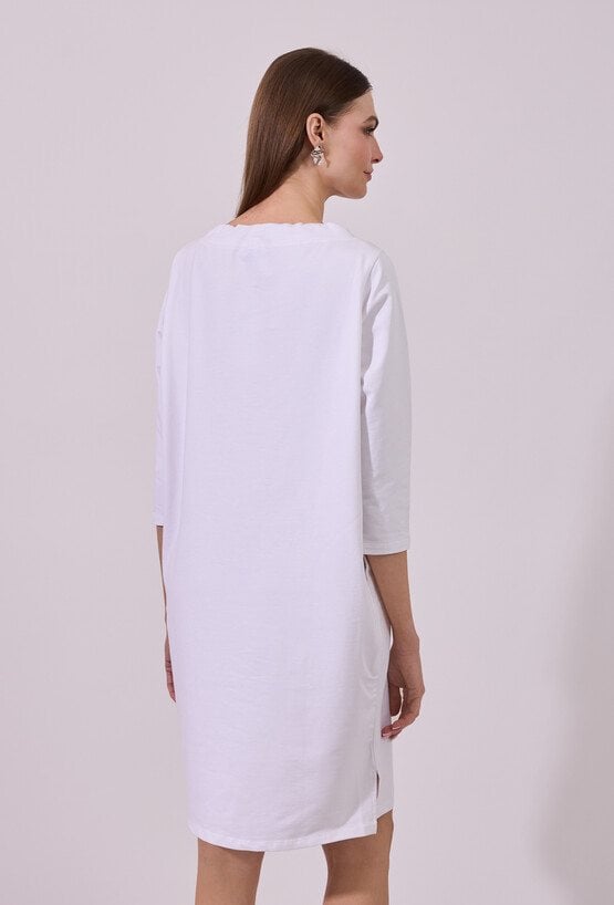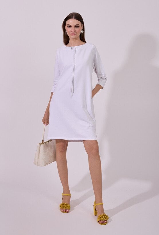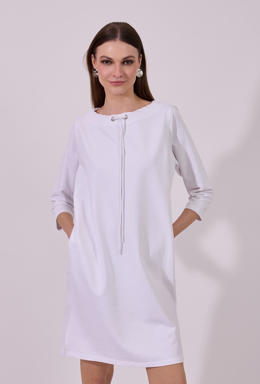 Sukienka damska o swobodnym, sportowym kroju z długim rękawem. Model z okrągłym dekoltem oraz dekoracyjnymi troczkami przy szyi, które nadają całości nowoczesnego, casualowego charakteru. raktyczne kieszenie oraz delikatne rozcięcia po bokach zwiększają wygodę i swobodę ruchów. Idealna propozycja do codziennych, niezobowiązujących stylizacji. Modelka na zdjęciu ma 177 cm wzrostu i prezentuje rozmiar S.