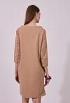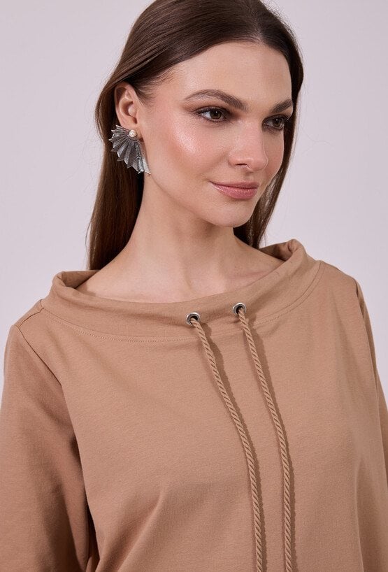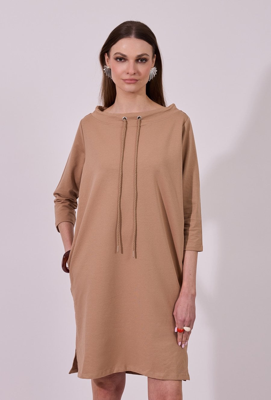 Sukienka damska o swobodnym, sportowym kroju z długim rękawem. Model z okrągłym dekoltem oraz dekoracyjnymi troczkami przy szyi, które nadają całości nowoczesnego, casualowego charakteru. raktyczne kieszenie oraz delikatne rozcięcia po bokach zwiększają wygodę i swobodę ruchów. Idealna propozycja do codziennych, niezobowiązujących stylizacji. Modelka na zdjęciu ma 177 cm wzrostu i prezentuje rozmiar S.