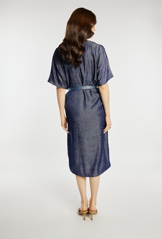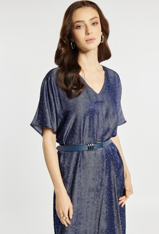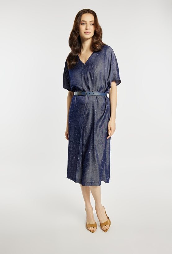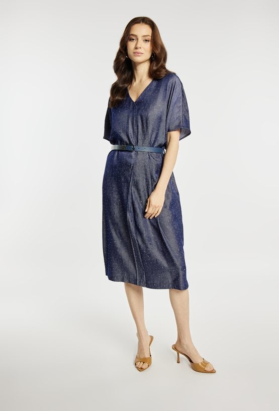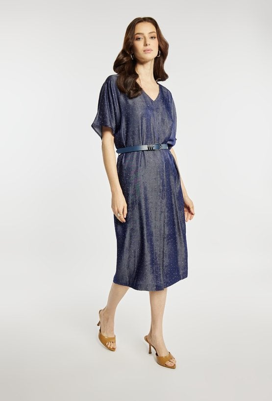 Sukienka o swobodnym, kobiecym kroju. Dekolt w kształcie litery V subtelnie podkreśla sylwetkę, a luźne rękawy dodają lekkości i komfortu noszenia. Długość midi sprawia, że sukienka świetnie sprawdzi się na wiosenne okazje – zarówno na co dzień, jak i na spotkania czy wyjścia wymagające bardziej eleganckiej stylizacji. Sukienka ozdobiona jest drobnymi dżetami, które delikatnie urozmaicają materiał, bez efektu połysku. Modelka na zdjęciu ma 177 cm wzrostu i prezentuje rozmiar 36.
