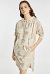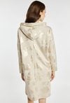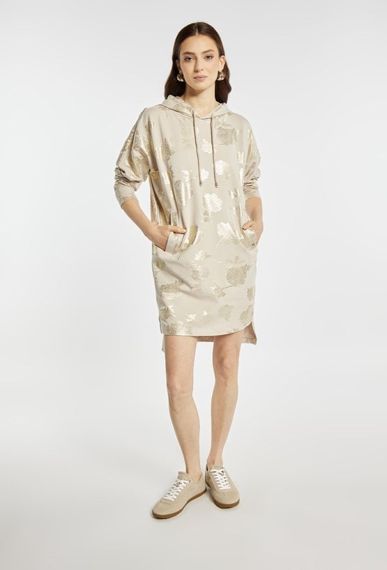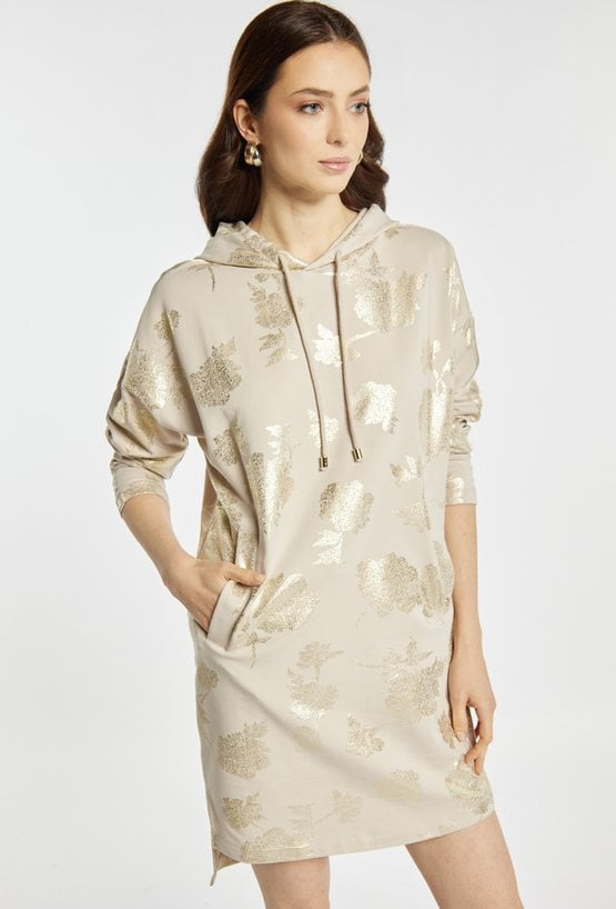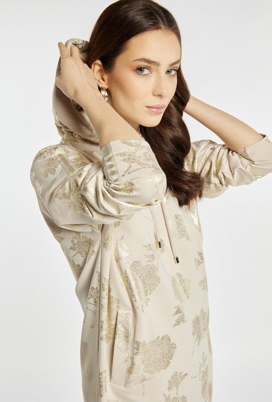 Sukienka o swobodnym, prostym kroju z delikatnym, złotym wzorem. Sukienka ma kaptur z troczkami oraz praktyczne kieszenie, a niewielkie rozcięcie z boku dodaje jej lekkości i swobody ruchów. Sukienka sprawdzi się na co dzień, na wiosenne spacery, do pracy w mniej formalnym wydaniu lub na casualowe spotkania. Modelka na zdjęciu ma 177 cm wzrostu i prezentuje rozmiar S.
