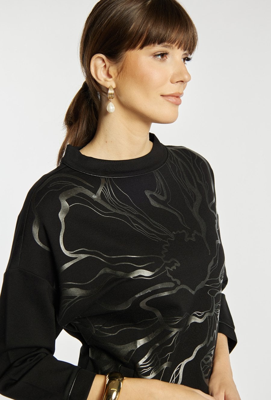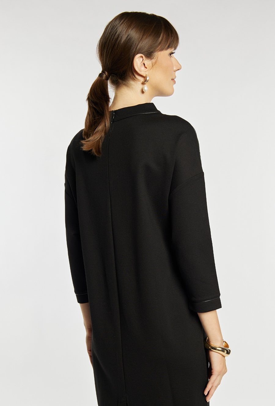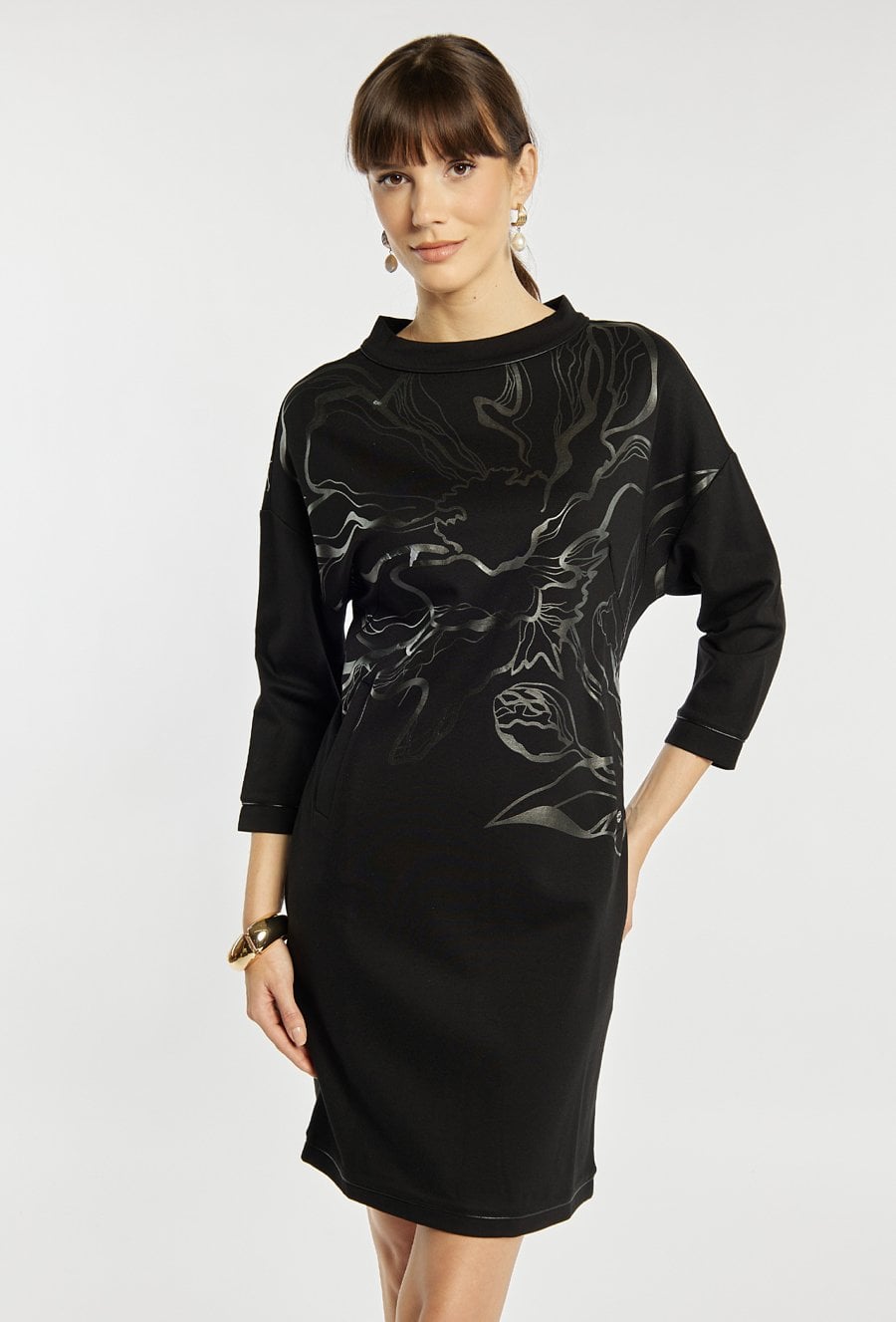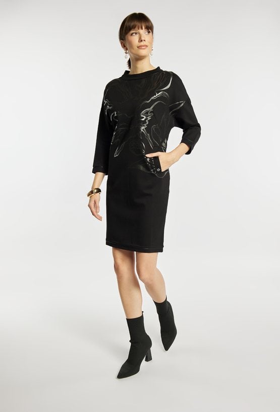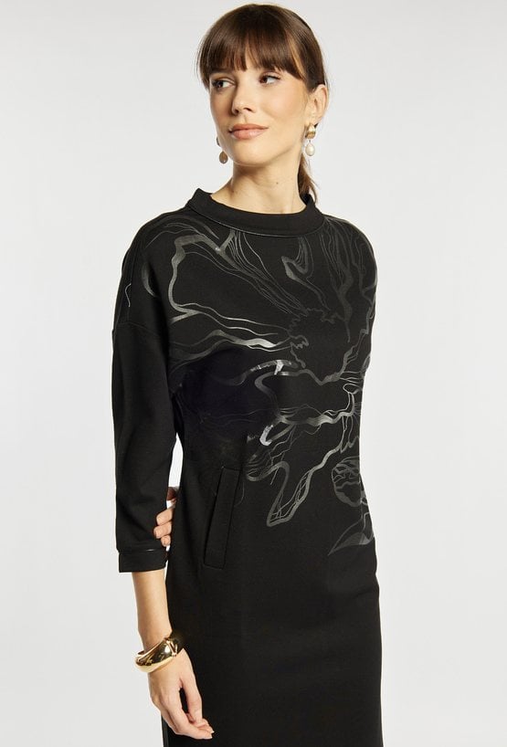 Sukienka o prostym kroju z wygodnym rękawem 3/4 i dekoracyjnym, metalicznym nadrukiem umieszczonym z przodu. Sukienka zachwyca miękką dzianiną, elegancką stójką przy dekolcie i długością idealną na co dzień, tworząc stylowe, a jednocześnie komfortowe połączenie. Modelka na zdjęciu ma 177 cm wzrostu i prezentuje rozmiar S.