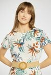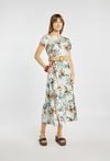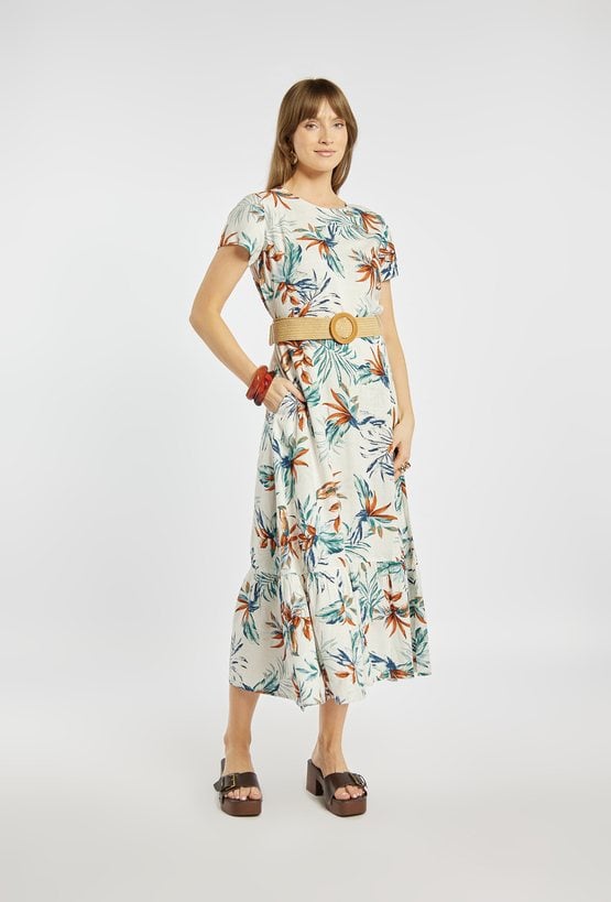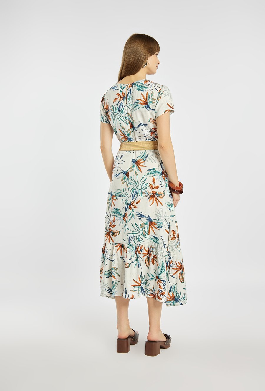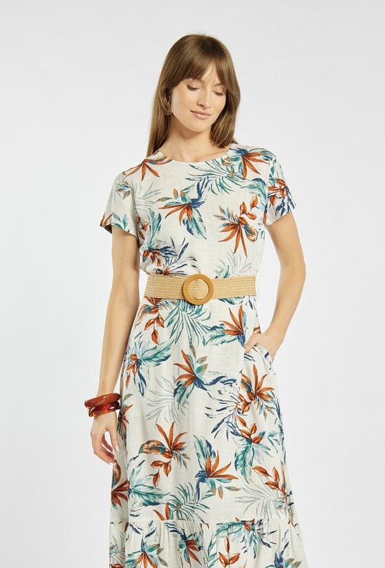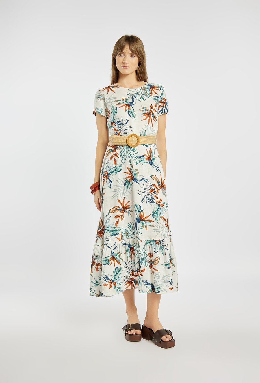 Sukienka z wiskozy o kobiecym, rozkloszowanym kroju z falbaną na dole. Sukienka z krótkim rękawem i klasycznym, okrągłym dekoltem. Wzór w roślinne motywy nadaje jej świeżości i wakacyjnego charakteru. W talii efektowny, pleciony pasek z ozdobną klamrą, który pięknie podkreśla sylwetkę. Idealna na urlop, spacer po plaży czy letnie spotkania na mieście. Modelka na zdjęciu ma 177 cm wzrostu i prezentuje rozmiar 36