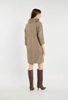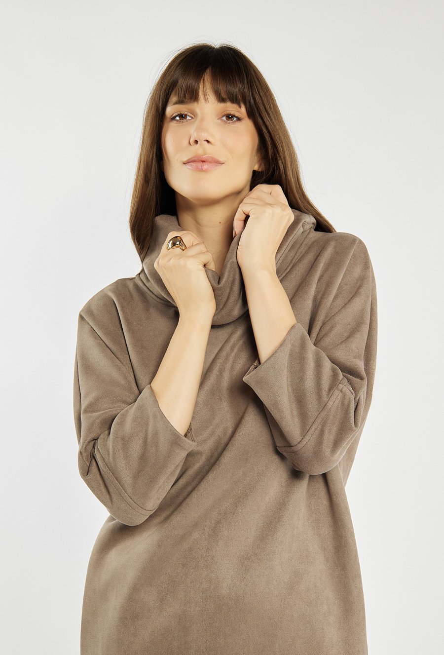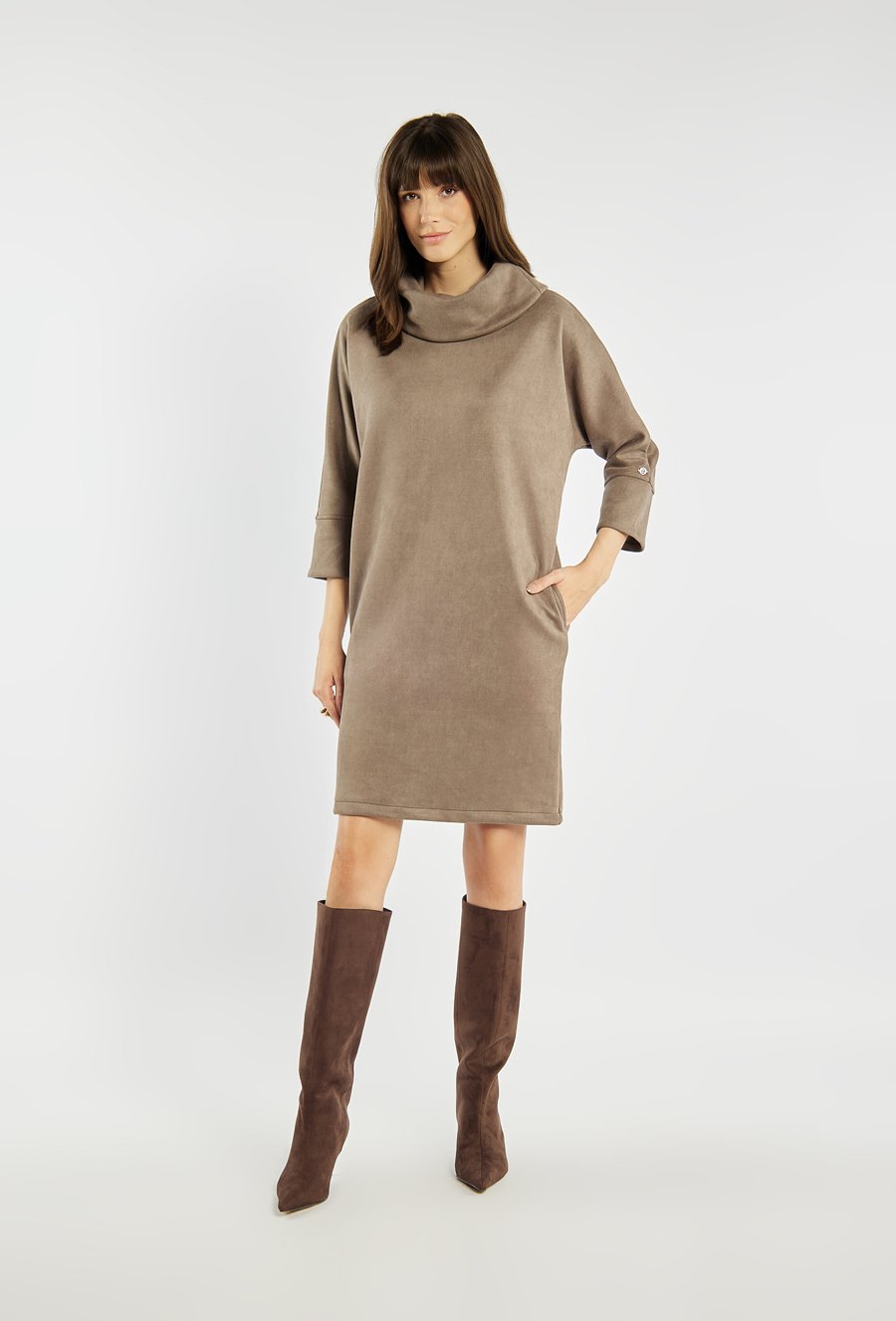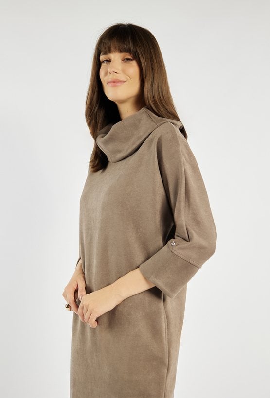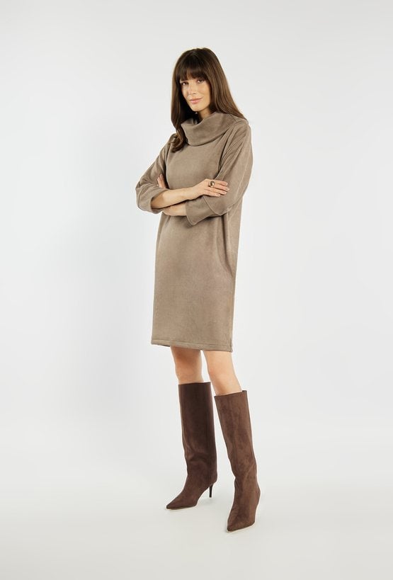 Sukienka damska o prostym kroju, z szerokim kołnierzem typu komin i rękawem 3/4. Sukienki mini, idealne na co dzień oraz na mniej formalne spotkania. Minimalistyczny fason sprawia, że łatwo zestawić ją zarówno z kozakami, jak i bardziej eleganckimi dodatkami. Modelka na zdjęciu ma 177 cm wzrostu i prezentuje rozmiar 36