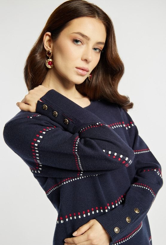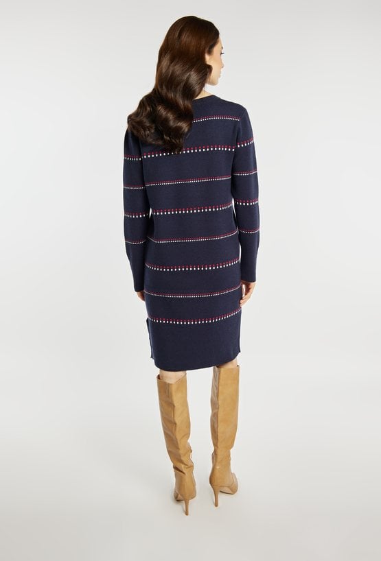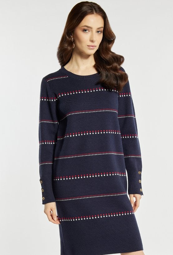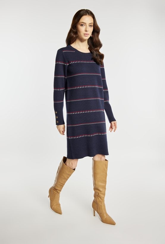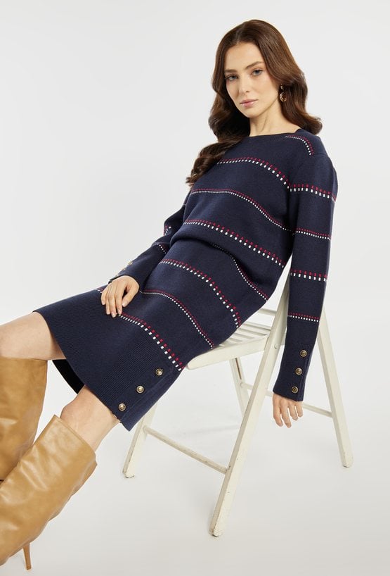 Sukienka o prostym, swobodnym kroju. Sukienka ma długość do kolan oraz długie rękawy wykończone ozdobnymi guzikami. Subtelny wzór w poziome pasy nadaje całości eleganckiego, a jednocześnie codziennego charakteru. Sukienka sprawdzi się na co dzień, do pracy, jak i na wiosenne wyjścia, dobrze komponując się zarówno z kozakami, jak i lżejszym obuwiem. Modelka na zdjęciu ma 177 cm wzrostu i prezentuje rozmiar S.