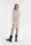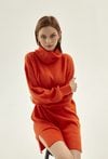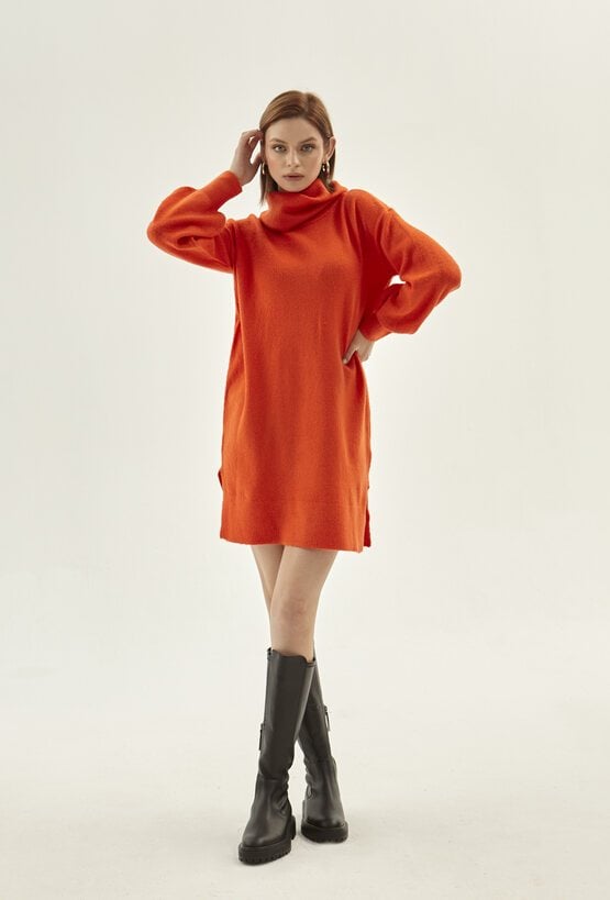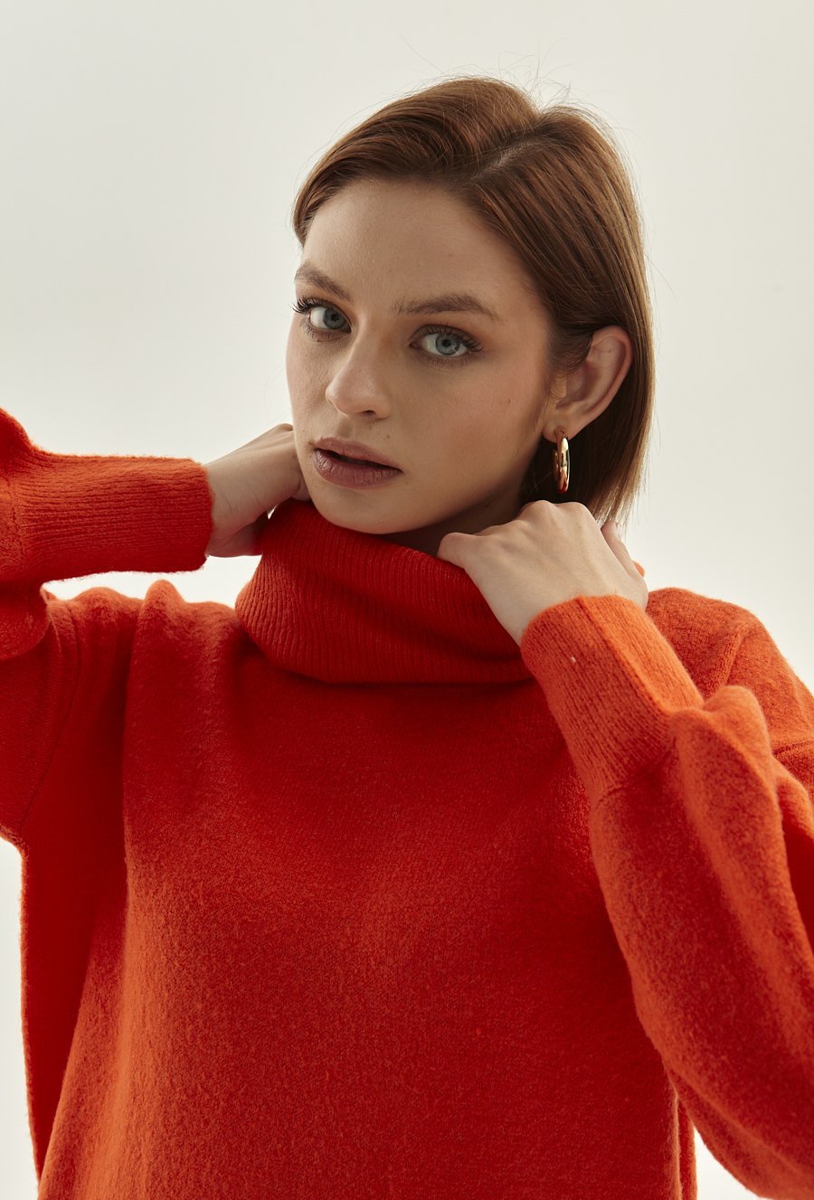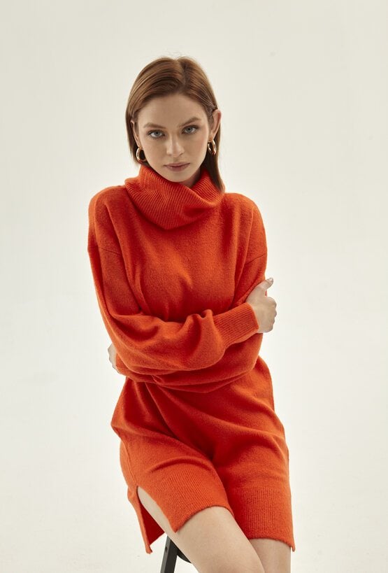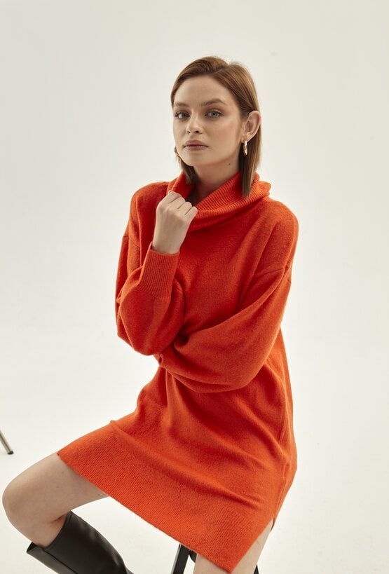 Pomarańczowa sukienka z golfem wykonana z miękkiej i przyjemnej w dotyku dzianiny . Ma dopasowany fason z obszernym golfem. Długość przed kolna prezentuje się kobieco. Sukienka ma długie rękawy. Bedzie doskonałą propozycją na chłodne jesienne dni. Noś ją z kozakami lub szpilkami. Modelka na zdjęciu ma 175 cm wzrostu i prezentuje rozmiar 36.