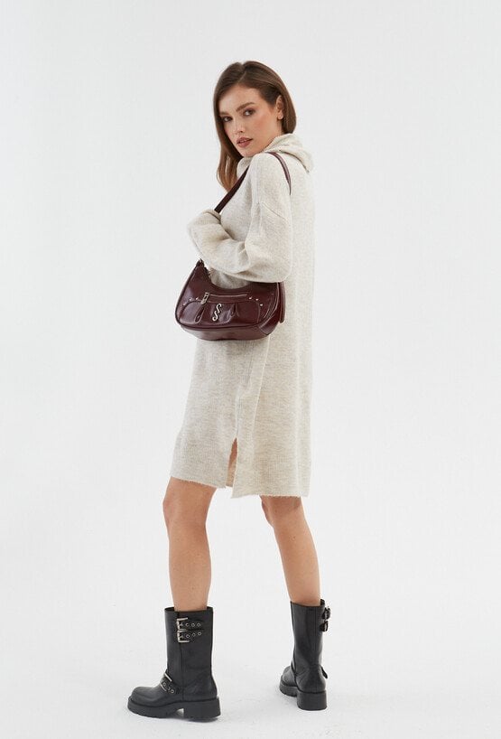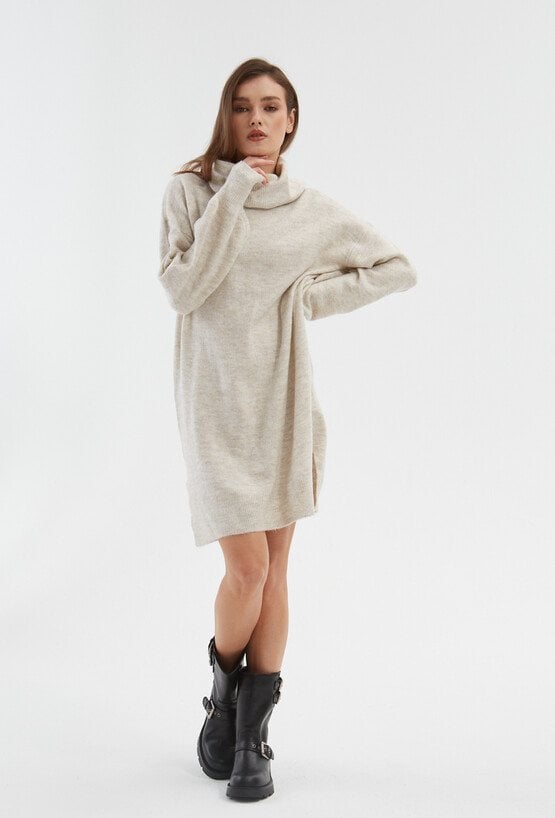 Beżowa sukienka z golfem wykonana z miękkiej i przyjemnej w dotyku dzianiny . Ma dopasowany fason z obszernym golfem. Długość przed kolna prezentuje się kobieco. Sukienka ma długie rękawy. Bedzie doskonałą propozycją na chłodne jesienne dni. Noś ją z kozakami lub szpilkami. Modelka na zdjęciu ma 175 cm wzrostu i prezentuje rozmiar 36.