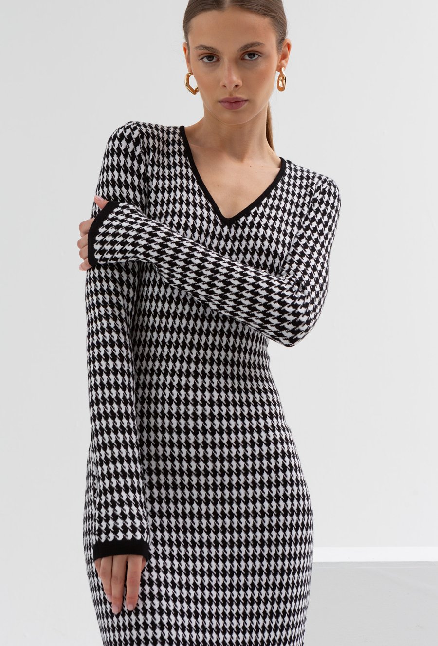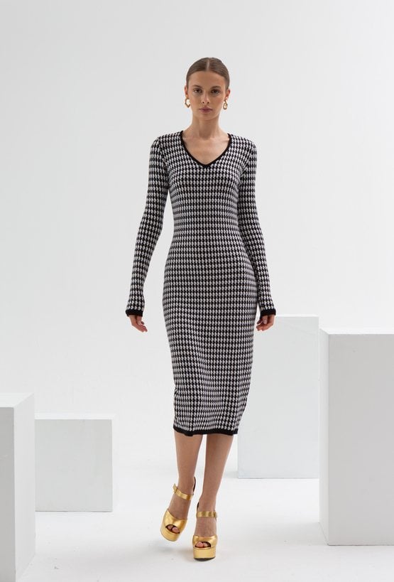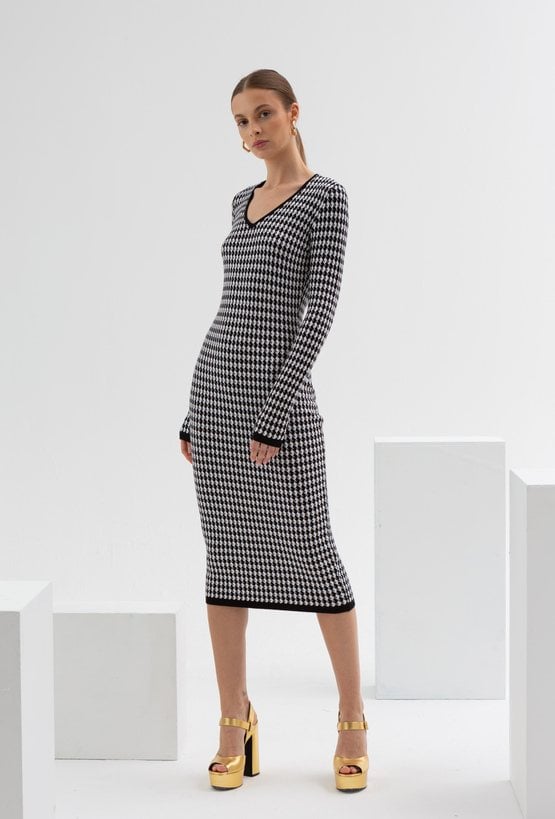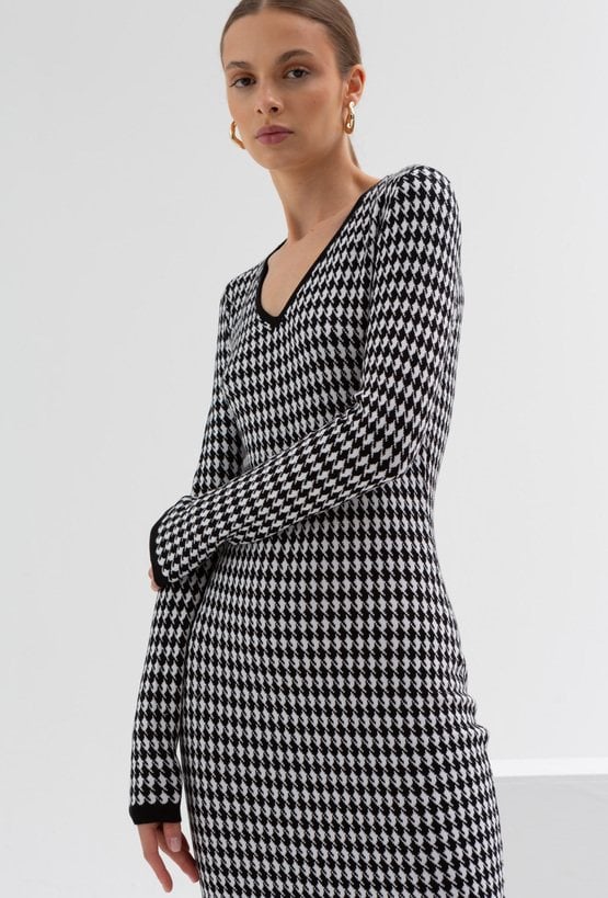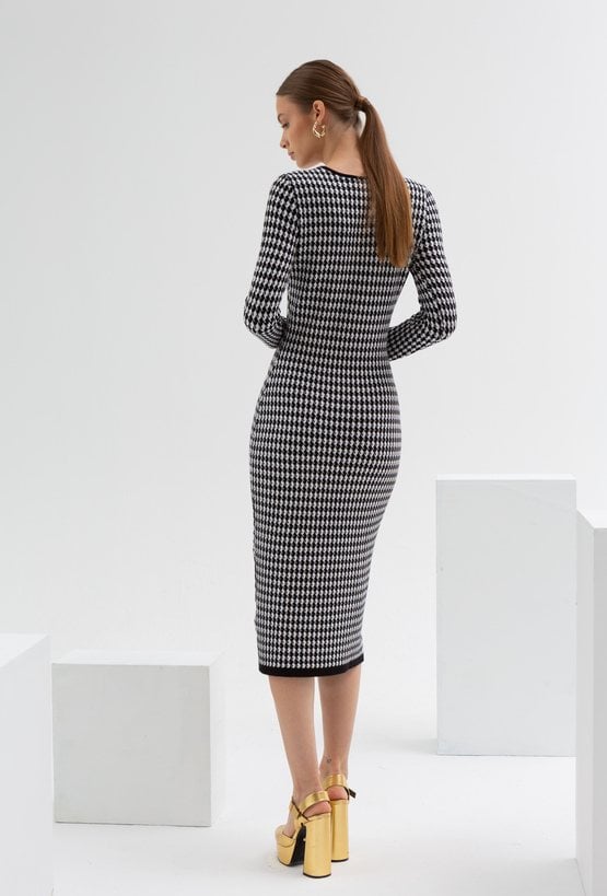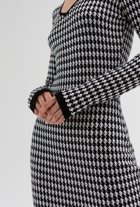 Dopasowana sukienka w pepitkę wykona z przyjemnej w dotyku wiskozy. Długie rękawy, dekolt w serek i długość midi. Ten bardzo kobiecy model, pięknie podkreśli kształty kobiecej sylwetki. To świetna propozycja na jesienne wyjścia nie tylko będzie Cię ogrzewać w jesienne chłody ale sprawi , ze będziesz wyglądała pięknie. Modelka na zdjęciu ma 177 cm wzrostu i prezentuje rozmiar 36.