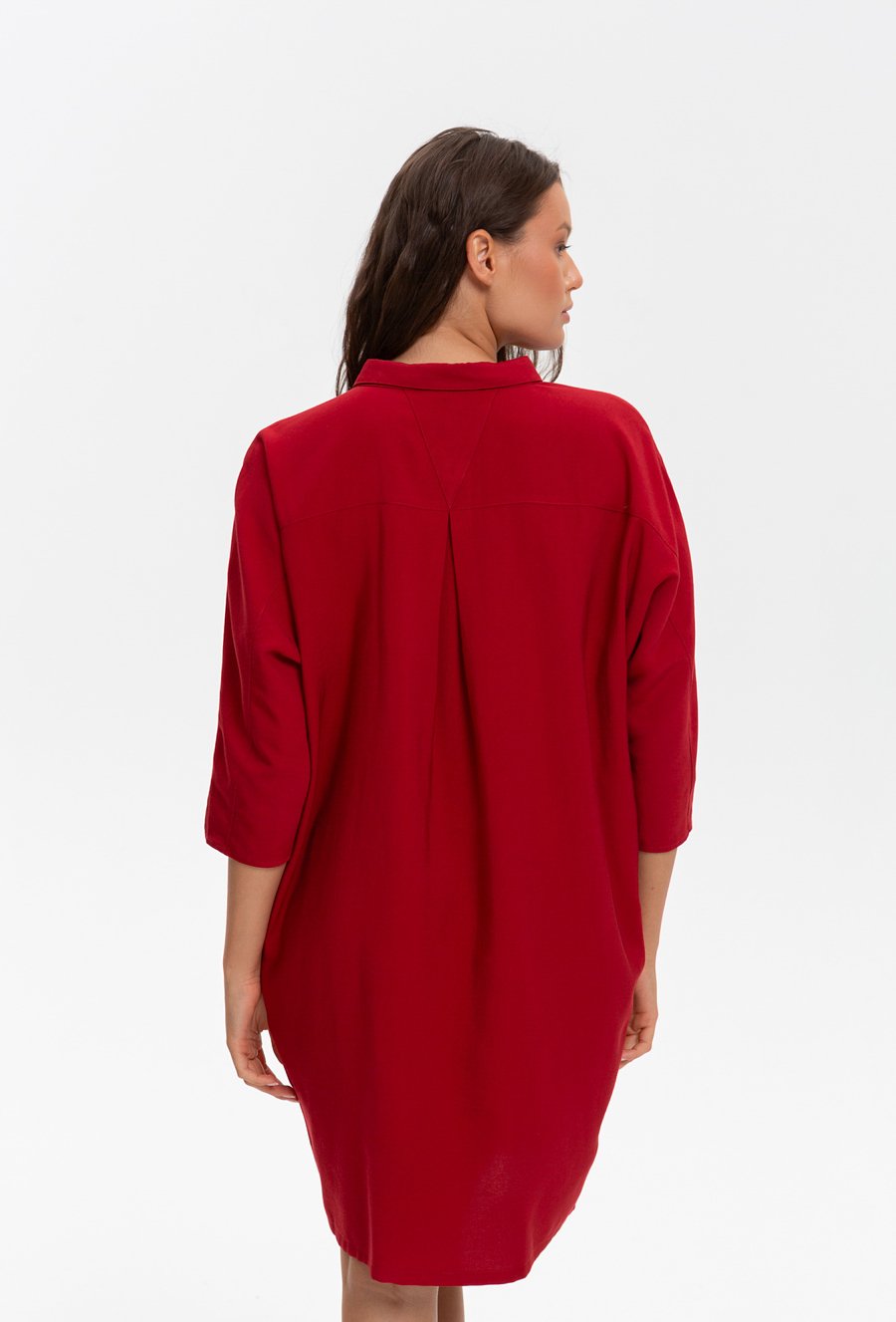 Sukienka damska w stylu koszulowym w kolorze niebieskim, z kołnierzem, zapinana na guziki z krytą plisą guzikową. Sukienka posiada prosty krój oraz nietoperzowe rękawy ¾ z delikatnym rozcięciem. Sukienka ma kieszenie po obydwu stronach. Sukienka jest idealną propozycją na lato, którą można nosić na co dzień.
