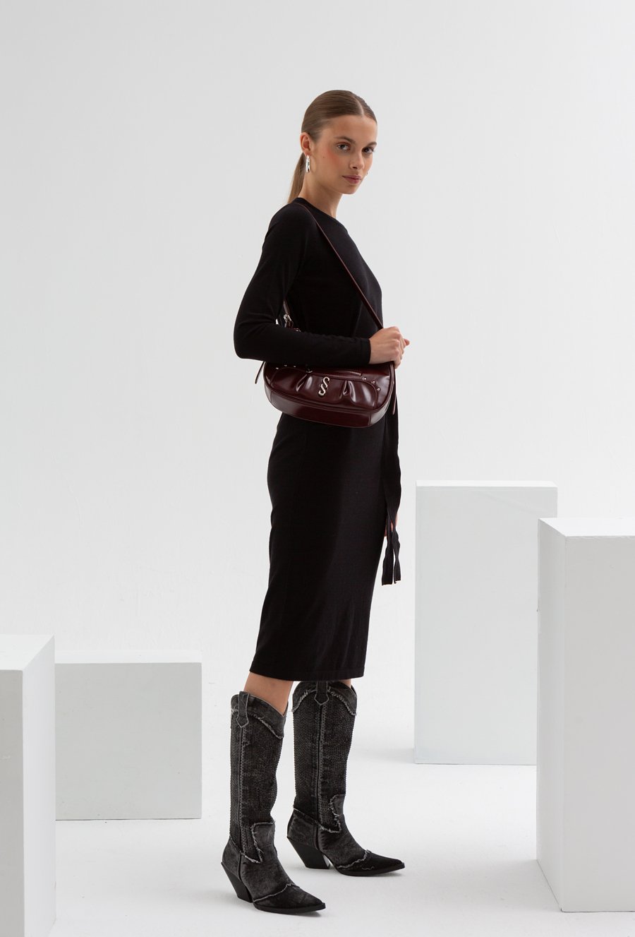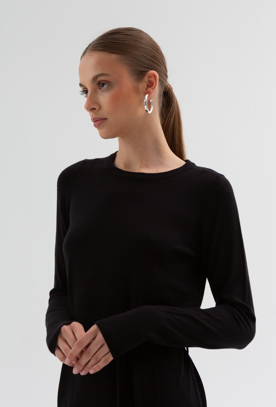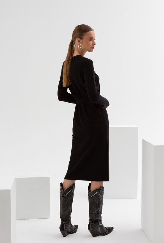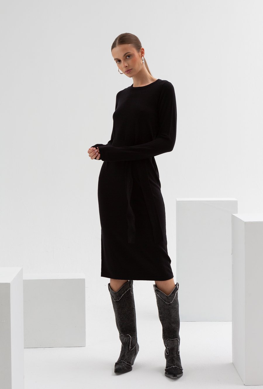 Czarna sukienka wykonana z przyjemnej w dotyku wiskozowej dzianiny. Długość poniżej kolan prezentuje się klasycznie. Wiązanie w talii pięknie podkreśla sylwetkę. Sukienka ma długie rękawy i okrągły dekolt. Modelka na zdjęciu ma 178 cm wzrostu i prezentuje rozmiar 36.