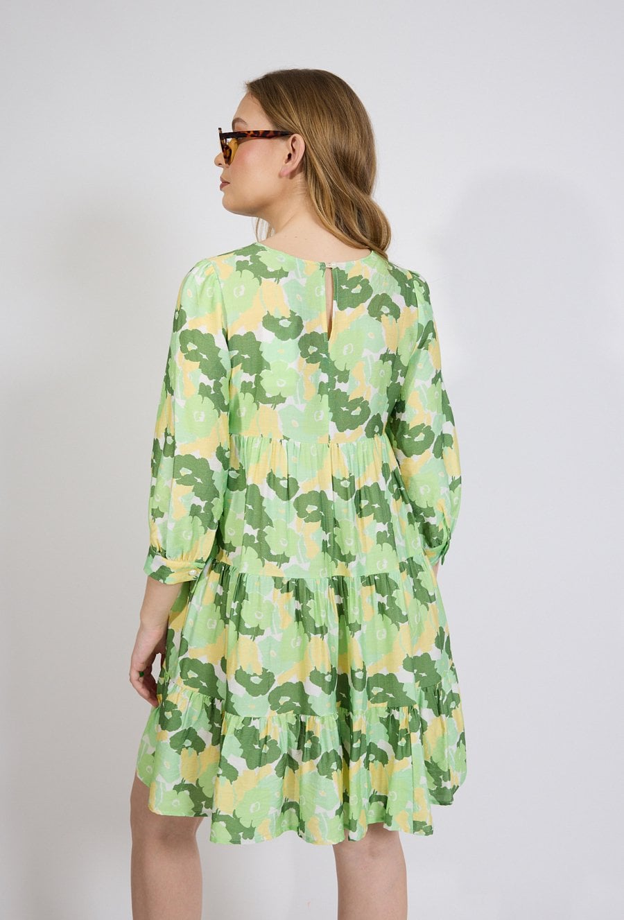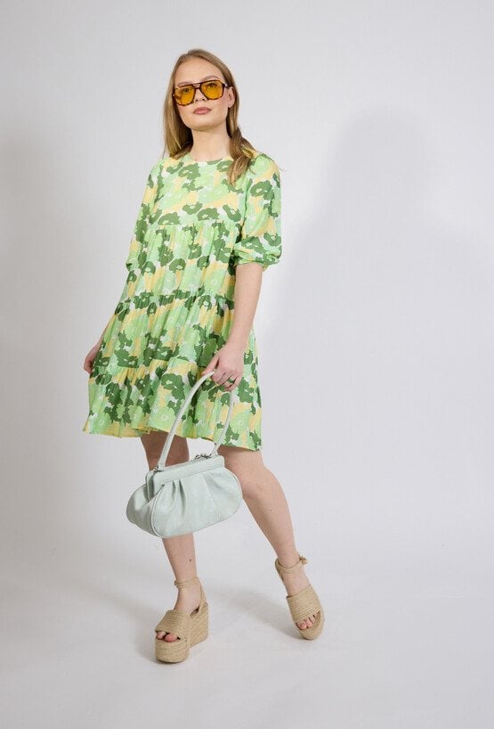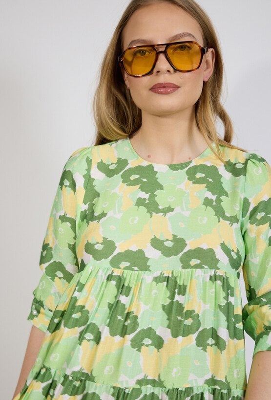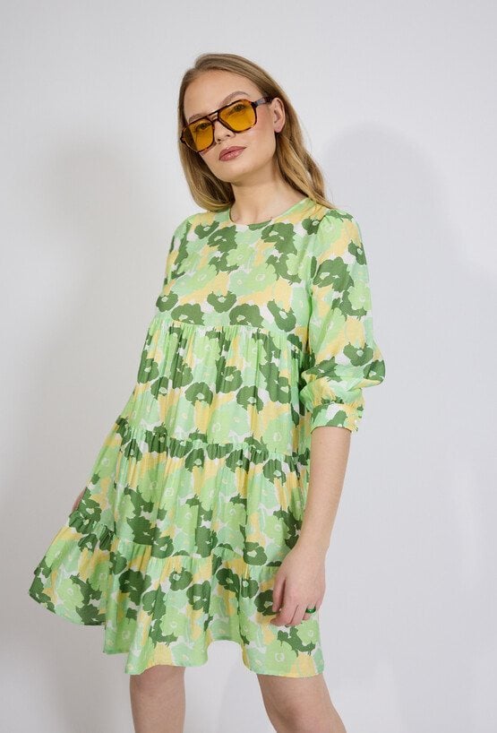 Sukienka damska o swobodnym, rozkloszowanym kroju. Model o długości przed kolano z rękawem o długości 3/4 zakończonym delikatnym marszczeniem oraz klasycznym, zaokrąglonym dekoltem. Sukienkę zdobi efektowny, wielokolorowy wzór, który nadaje stylizacji świeżości i lekkości. Sukienka w połączeniu z sandałami, balerinami lub lekkimi butami na obcasie stworzy stylowy i wygodny zestaw na cieplejsze dni. Modelka na zdjęciu ma 177 cm wzrostu i prezentuje rozmiar 36.