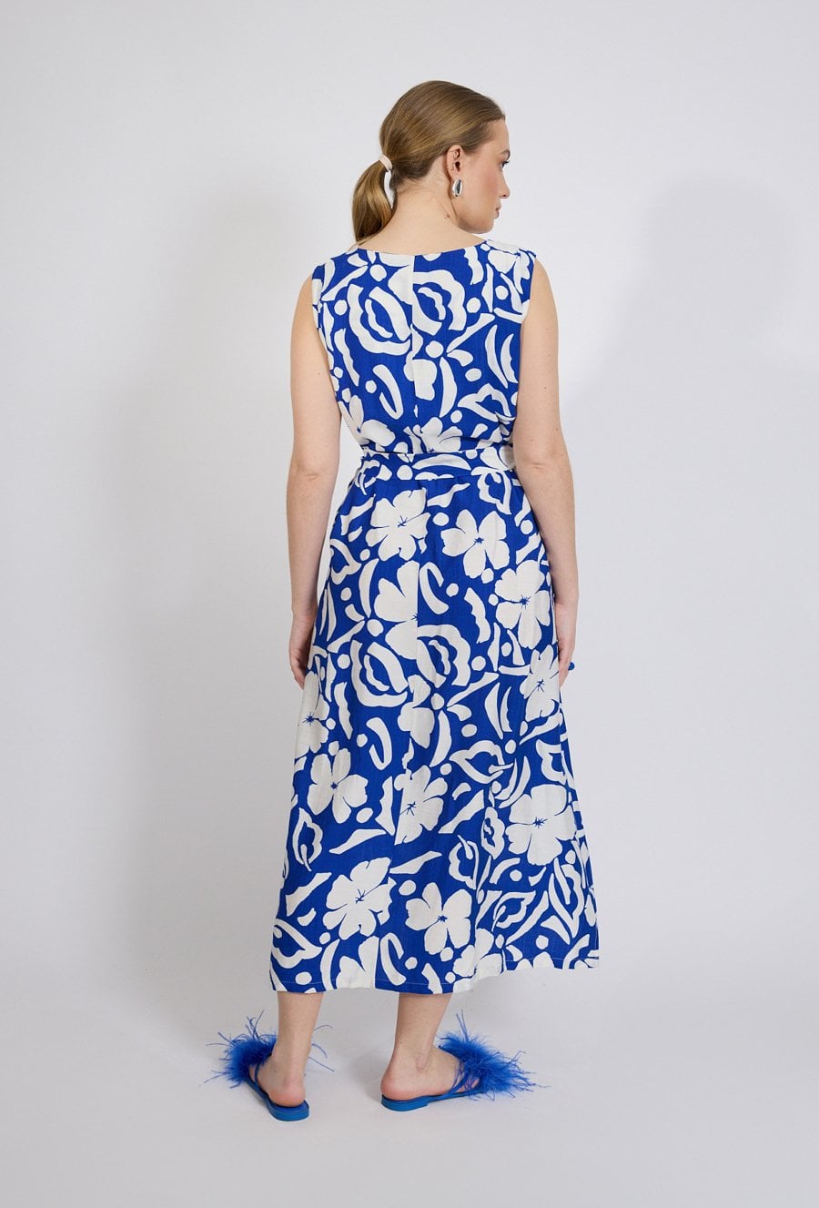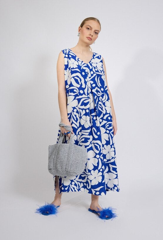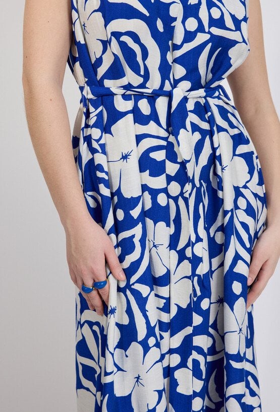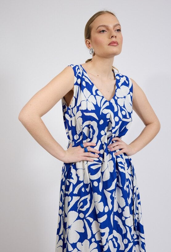 Sukienka damska o lekkim, swobodnym fasonie. Model bez rękawów z kobiecym dekoltem w kształcie litery V, który subtelnie podkreśla linię szyi. Całość zdobi wyrazisty wzór roślinny w kontrastowej kolorystyce, nadający stylizacji letniego i świeżego charakteru. Luźny krój zapewnia komfort noszenia i pięknie układa się na sylwetce. Modelka na zdjęciu ma 177 cm wzrostu i prezentuje rozmiar 36.