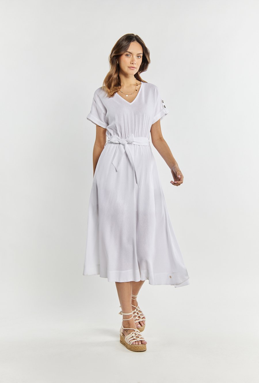 Zwiewna sukienka damska wykonana z wiskozy z dodatkiem lnu. Sukienka dekoltem w serek, krótkimi rękawami wykończonymi guzikami. Sukienka z kieszeniami oraz ściągaczem z wiązaniem na linii talii. Model ten świetnie sprawdzi się na letnie dni. Modelka na zdjęciu ma 177 cm wzrostu i prezentuje rozmiar 36 cm.