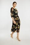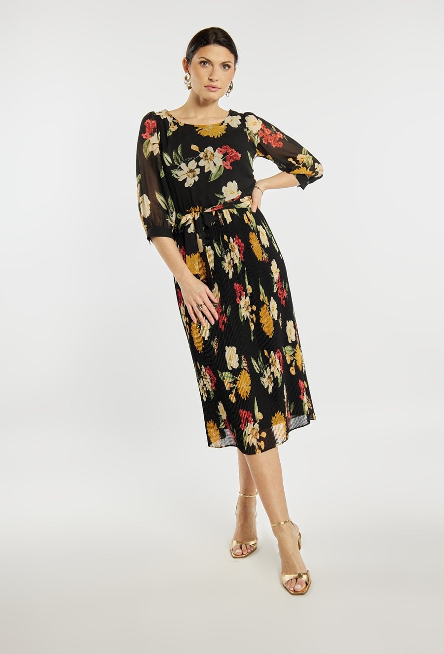 Elegancka sukienka damska o długości midi z plisowanym dołem i rękawem 3/4. Model z delikatnym wzorem oraz wiązaniem w pasie, które podkreśla sylwetkę. Sukienka doskonale sprawdzi się na komunię, rodzinne przyjęcia, spotkania oraz inne uroczystości. Modelka na zdjęciu ma 177 cm wzrostu i prezentuje rozmiar 36.