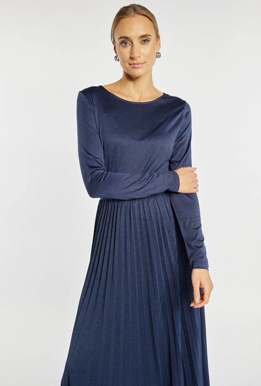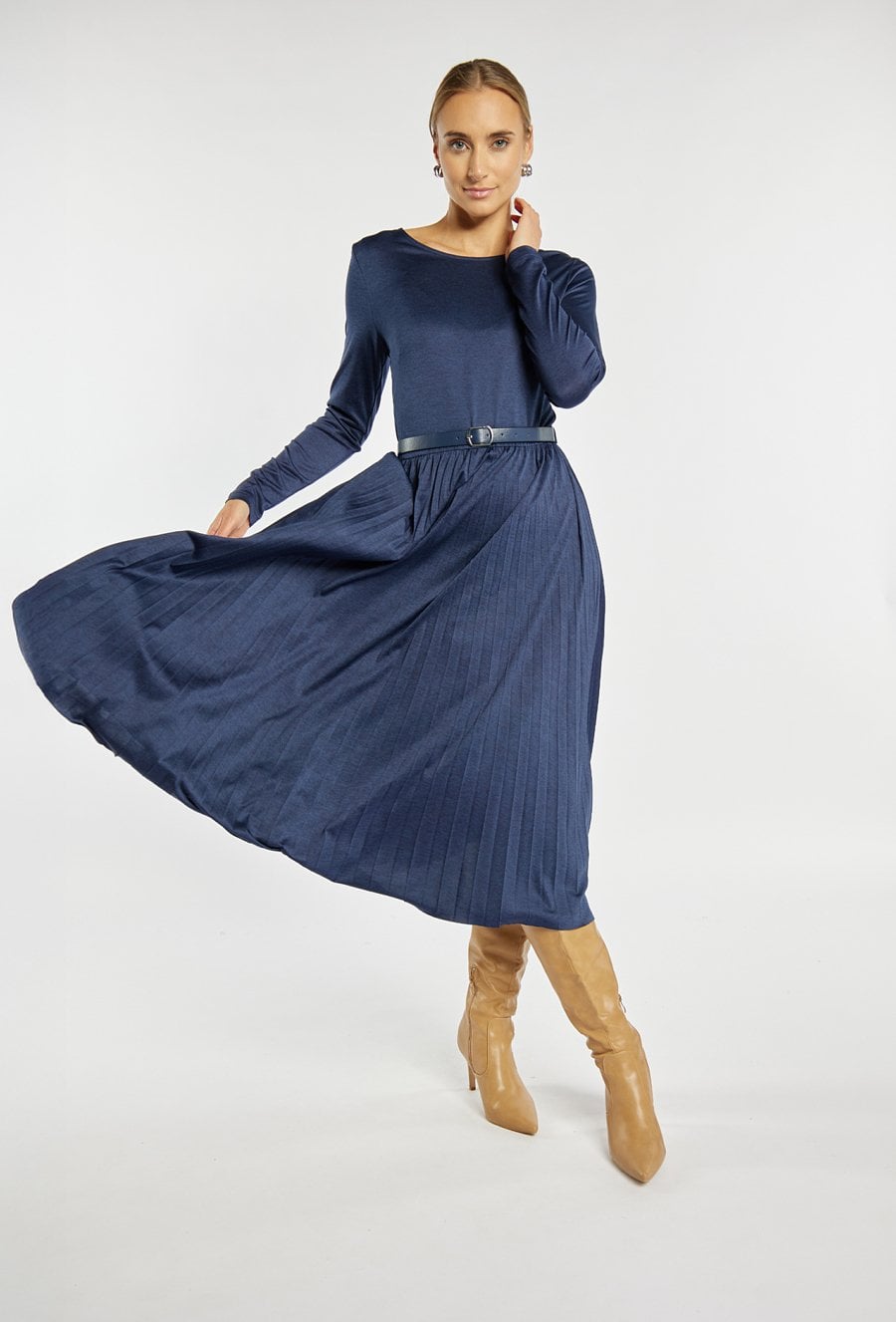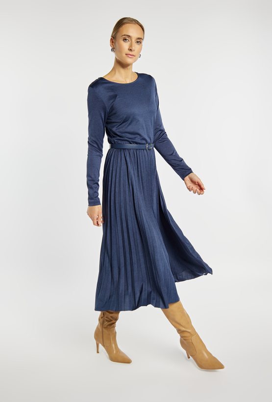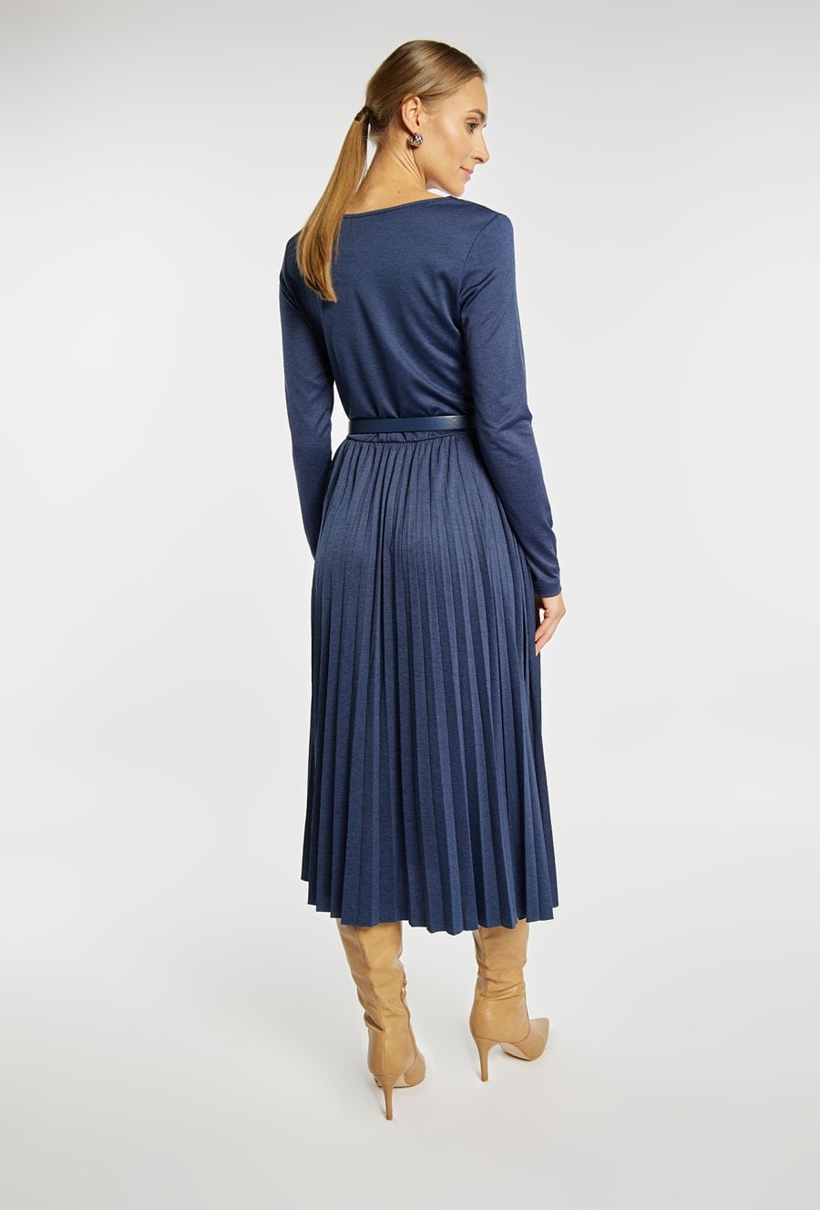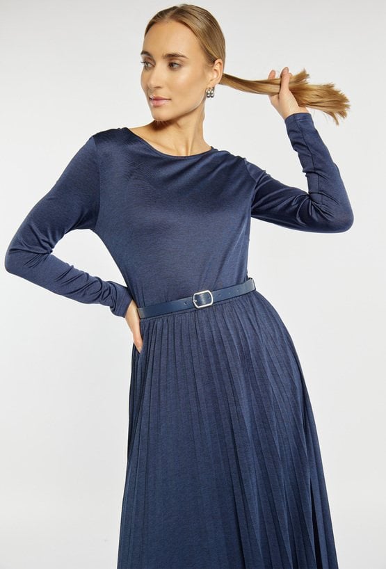 Sukienka o kobiecym, lekko rozkloszowanym kroju. Góra gładka z długim rękawem, dół w efektowne, drobne plisowanie, które tworzy elegancką linię i pięknie pracuje w ruchu. W talii pasek podkreślający sylwetkę. Idealna na codzienne wyjścia i bardziej eleganckie okazje. Modelka na zdjęciu ma 177 cm wzrostu i prezentuje rozmiar S.