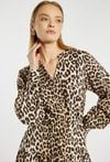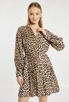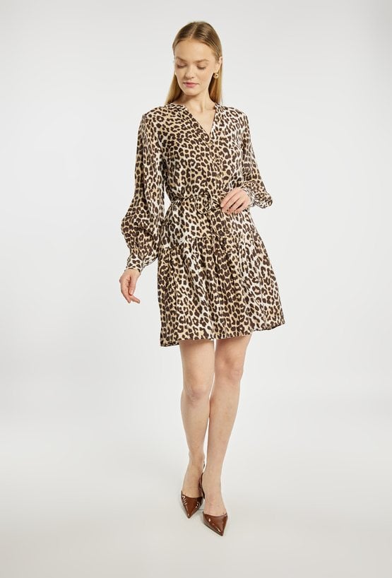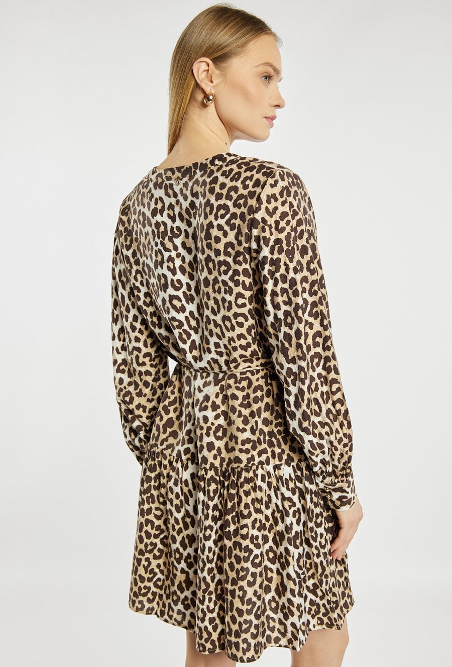 Sukienka o lekkim, kobiecym kroju z dekoracyjnym wzorem. Sukienka ma dekolt w kształcie litery V oraz talię podkreśloną wiązaniem, które pozwala dopasować fason do sylwetki. Sukienka sprawdzi się na wiosenne dni, do pracy, na spotkania lub codzienne stylizacje. Modelka na zdjęciu ma 177 cm wzrostu i prezentuje rozmiar 36.