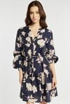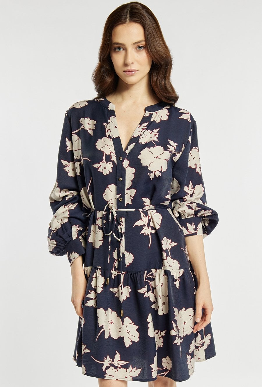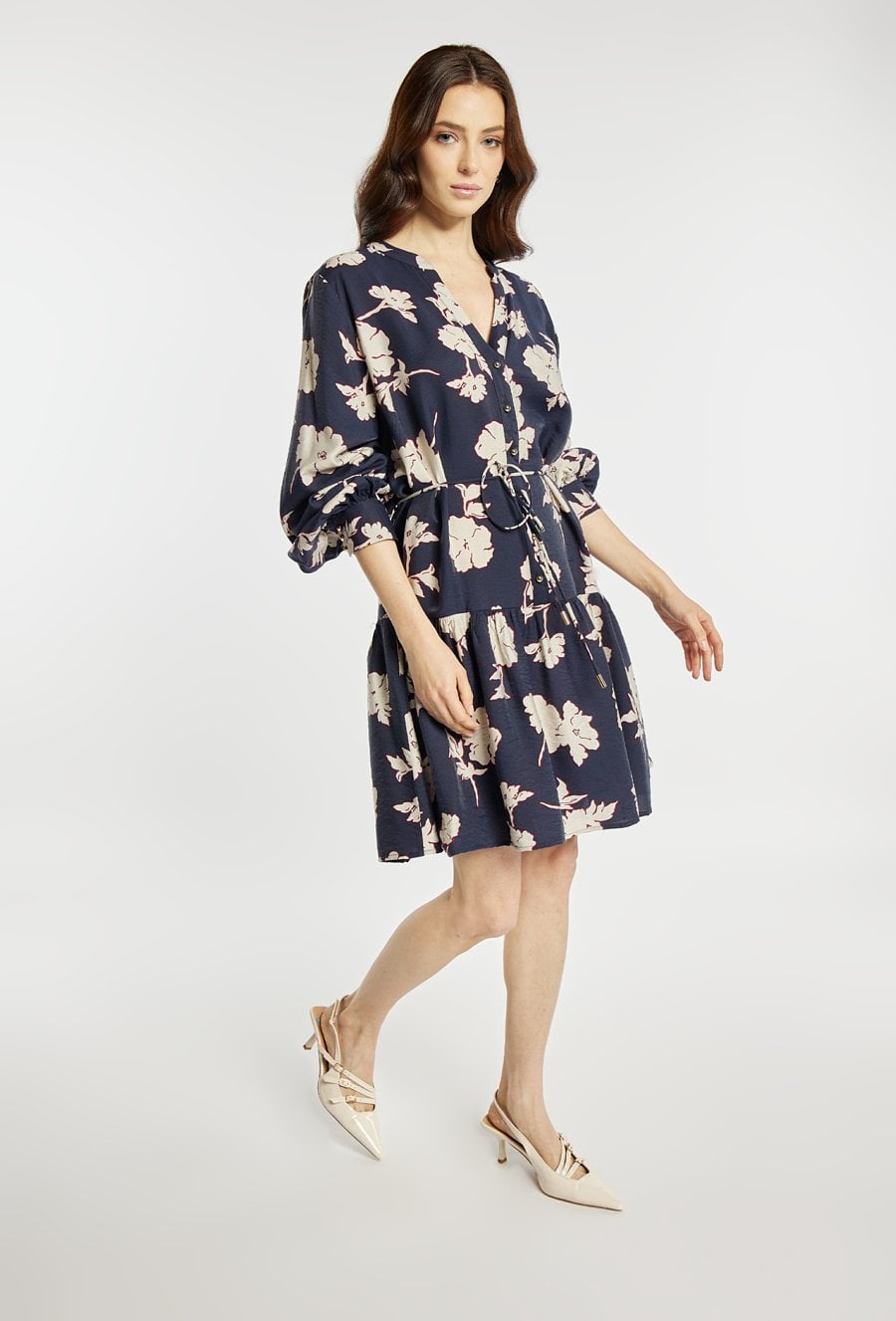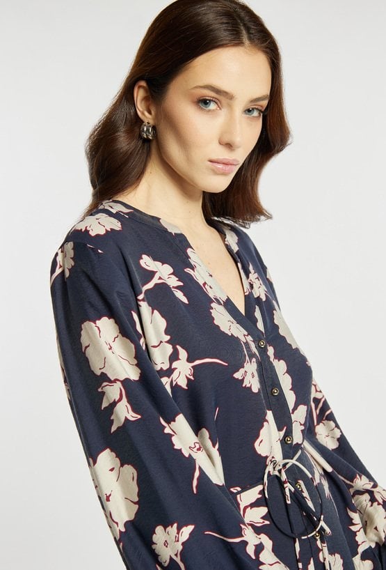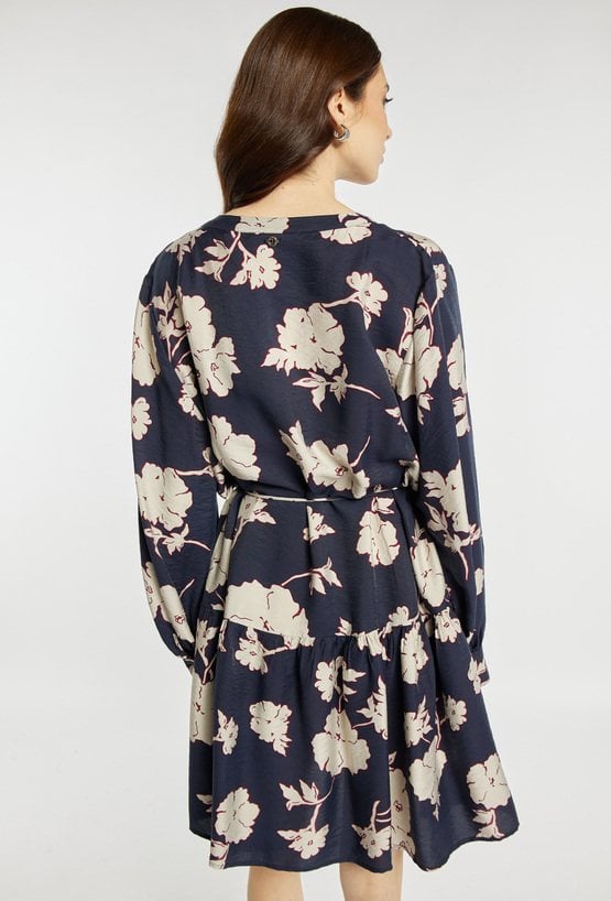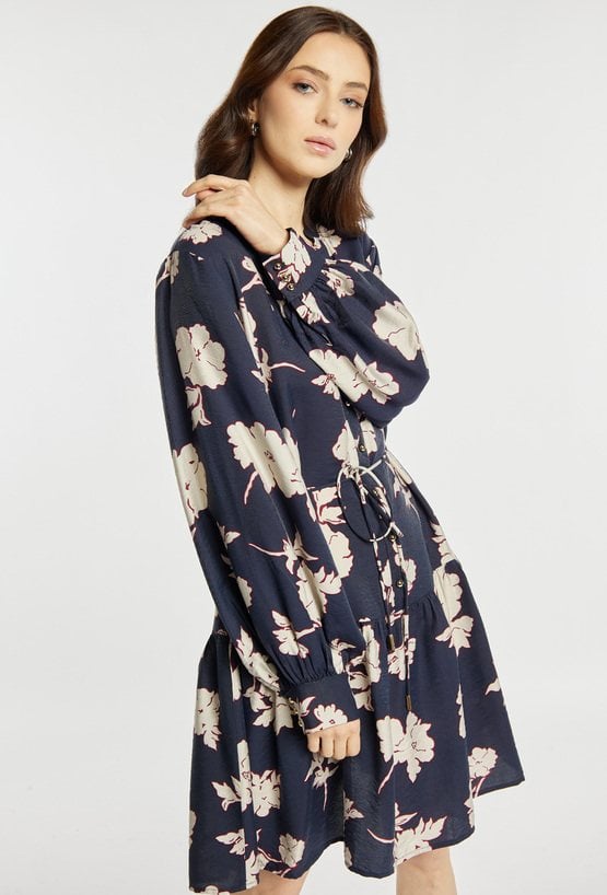 Sukienka o lekkim, kobiecym kroju z dekoracyjnym wzorem. Sukienka ma dekolt w kształcie litery V oraz talię podkreśloną wiązaniem, które pozwala dopasować fason do sylwetki. Sukienka sprawdzi się na wiosenne dni, do pracy, na spotkania lub codzienne stylizacje. Modelka na zdjęciu ma 177 cm wzrostu i prezentuje rozmiar 36.