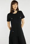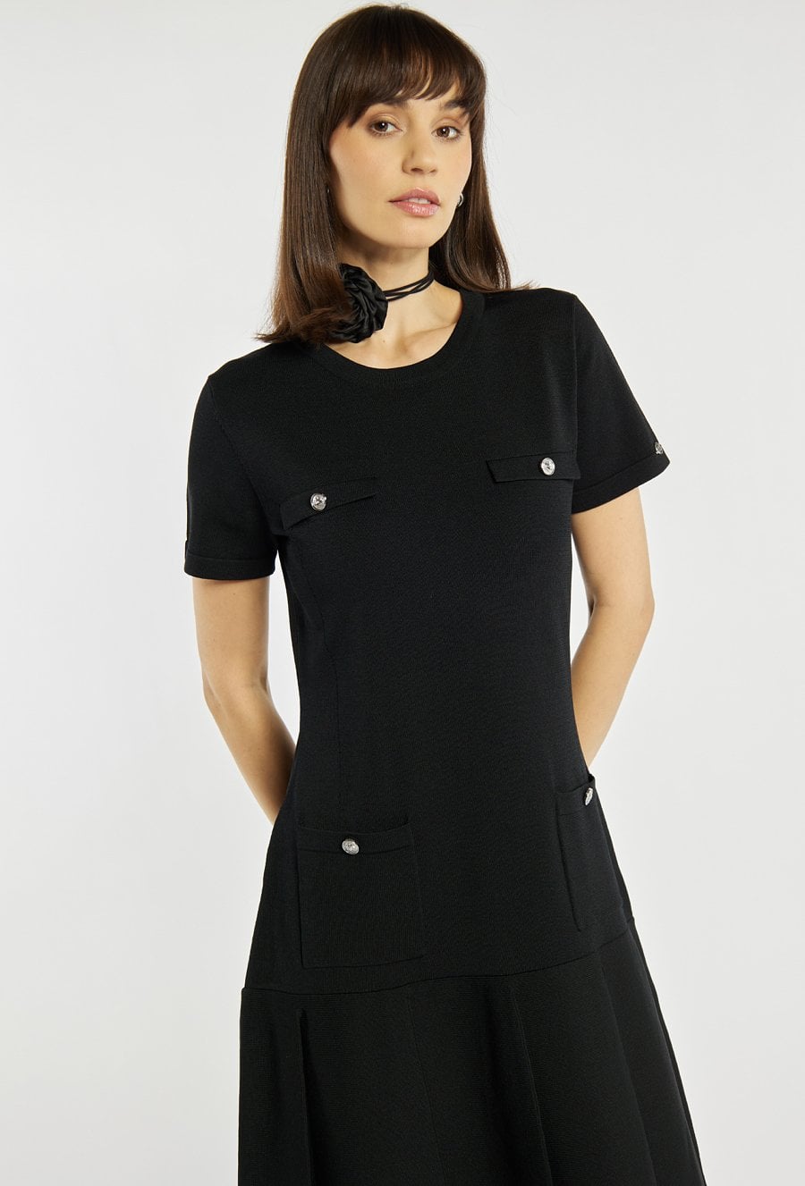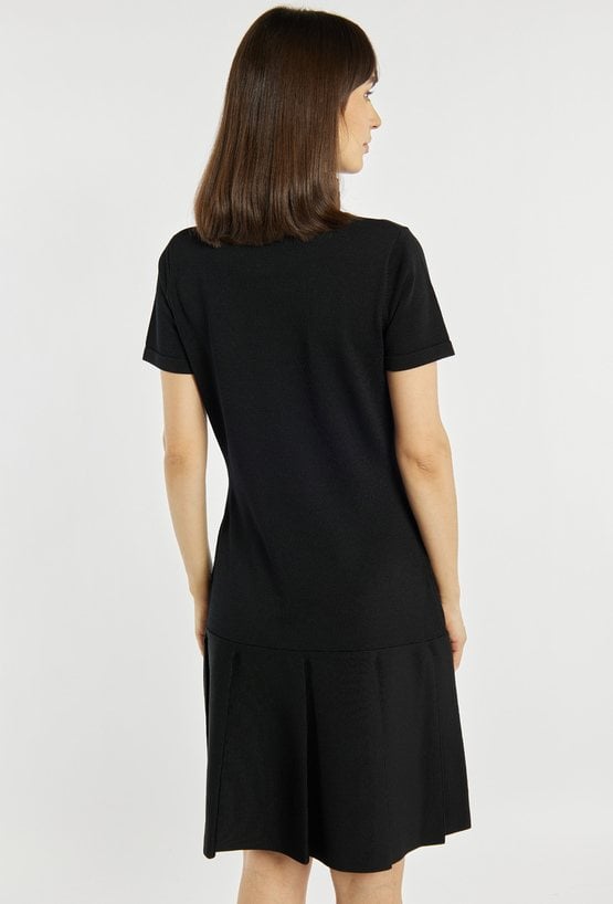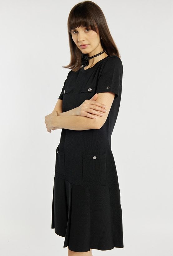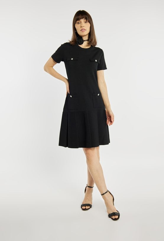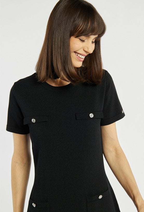 Sukienka o prostym kroju z krótkim rękawem wyróżnia się ozdobnymi kieszonkami na biuście i przy talii, które nadają jej eleganckiego, lekko retro charakteru. Rozkloszowany dół subtelnie podkreśla sylwetkę i dodaje całości lekkości. Modelka na zdjęciu ma 177 cm wzrostu i prezentuje rozmiar S.
