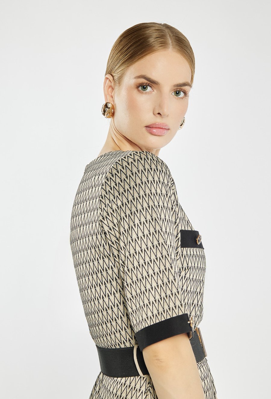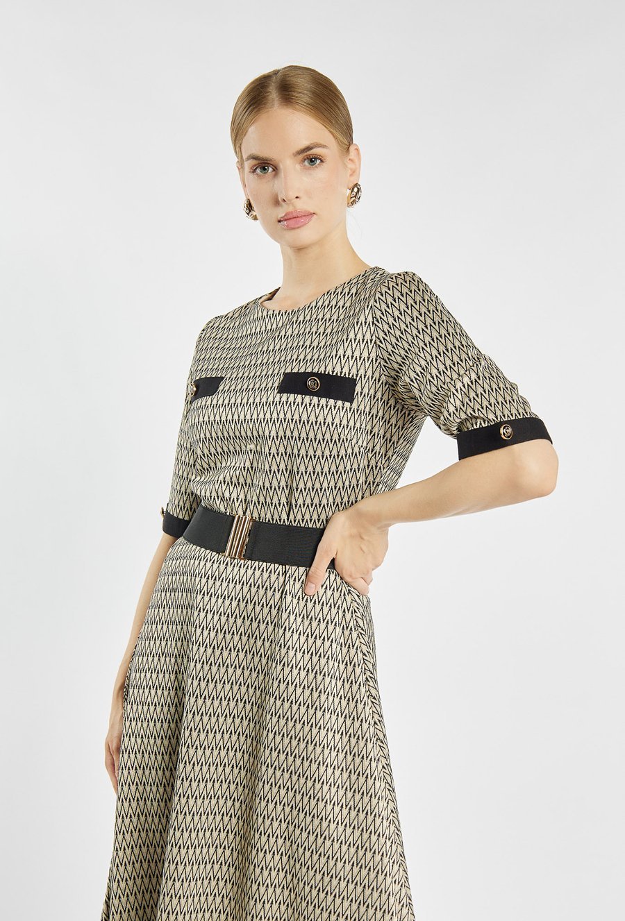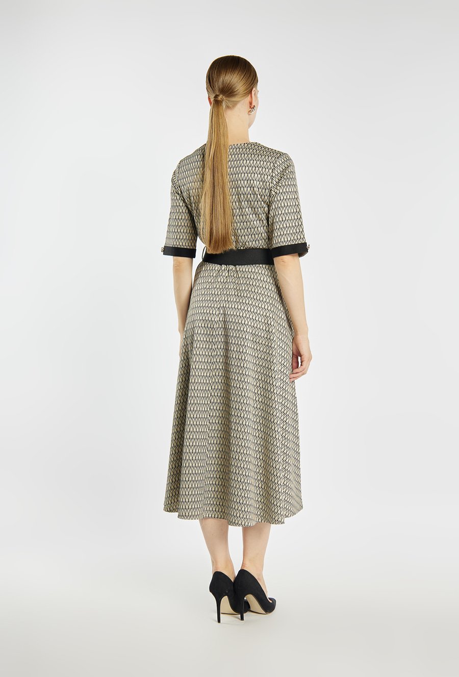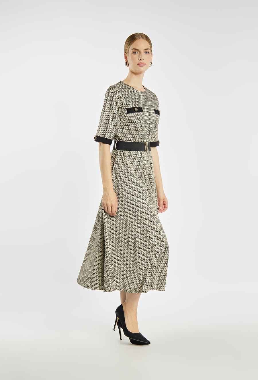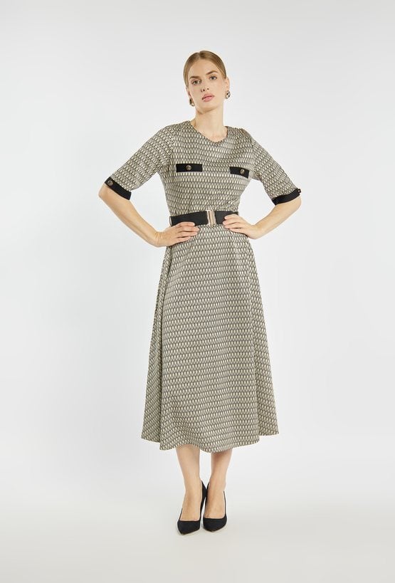Sukienka o długości midi w drobny geometryczny wzór. Sukienka z krótkimi rękawami ozdobionymi kontrastowymi mankietami i guziczkami. Talię podkreśla szeroki pasek z dekoracyjną klamrą. Zapinana na kryty suwak z tyłu. Idealna zarówno do pracy, jak i na wyjątkowe okazje. Modelka na zdjęciu ma 177 cm wzrostu i prezentuje rozmiar 36.