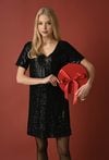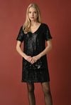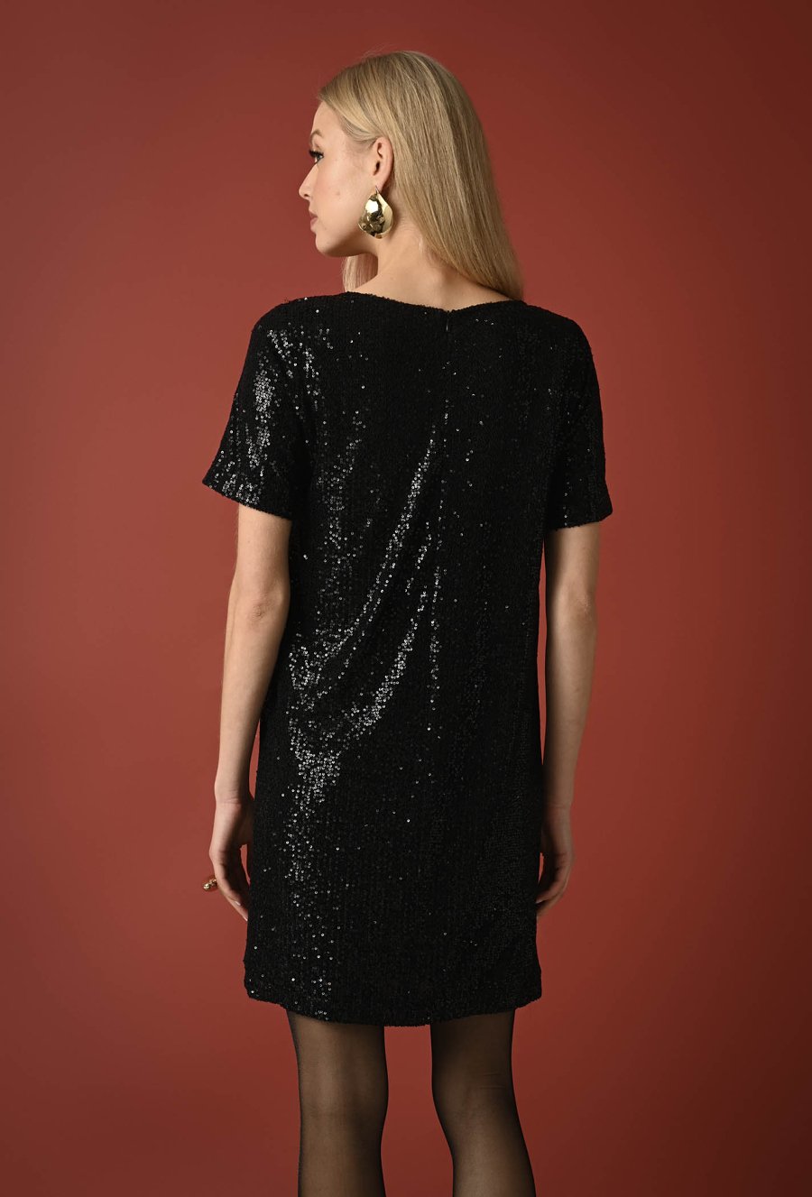 Czarna cekinowa sukienka o eleganckim kroju z krótkim rękawem to doskonały wybór na wiele okazji. Jej prosty fason oraz zabudowany dekolt sprawiają, że pasuje na wszystkie rodzaje sylwetki. Wykonana z drobnych cekinów, które pięknie połyskują sprawi, że ciężko w niej przejść niezauważoną. Długość nad kolano sprawia, że jest idealna zarówno na dzienne, jak i wieczorowe wydarzenia. Ta sukienka stanie się niezastąpionym elementem Twojej garderoby. Modelka na zdjęciu ma 177 cm wzrostu i prezentuje rozmiar 36.