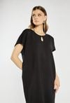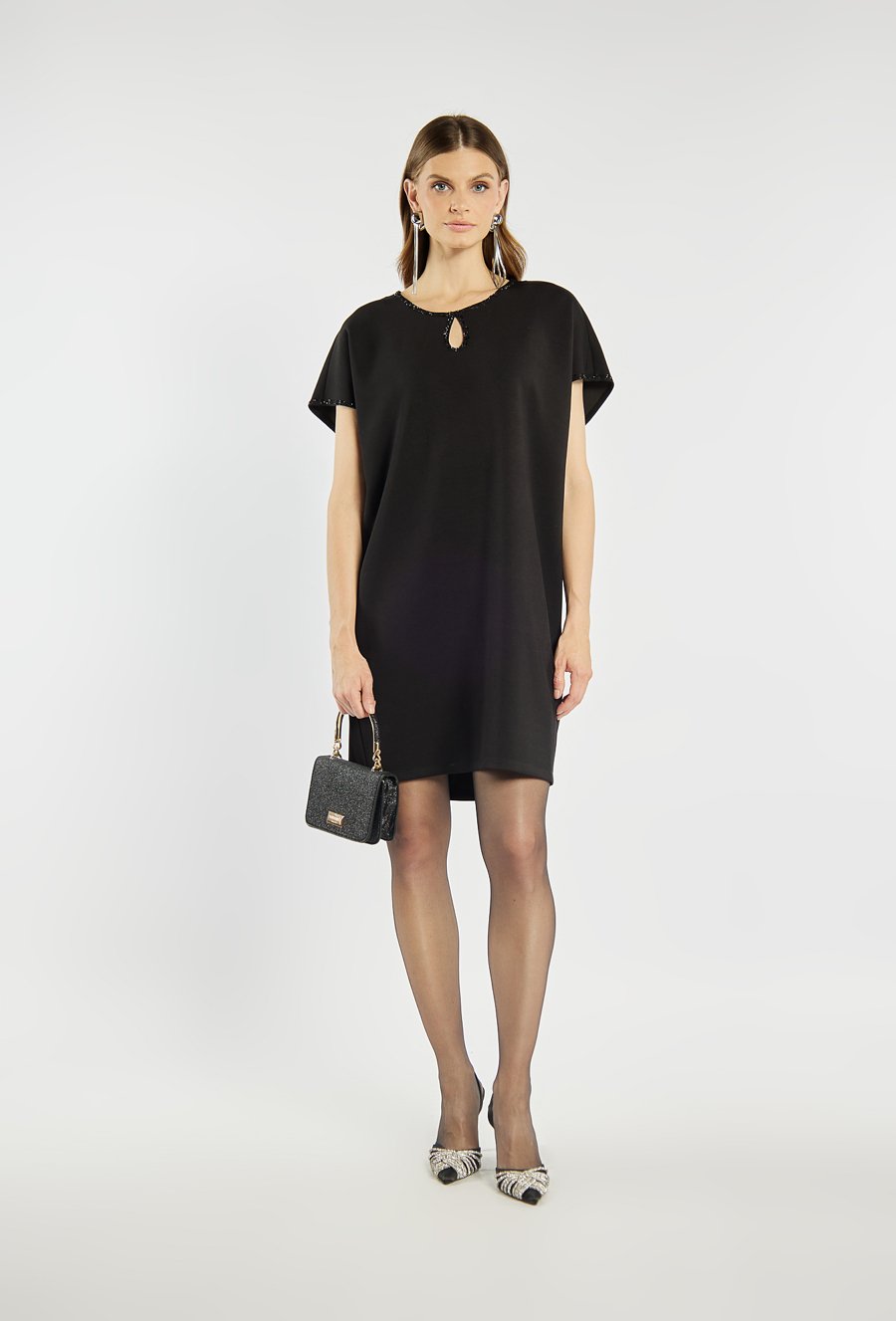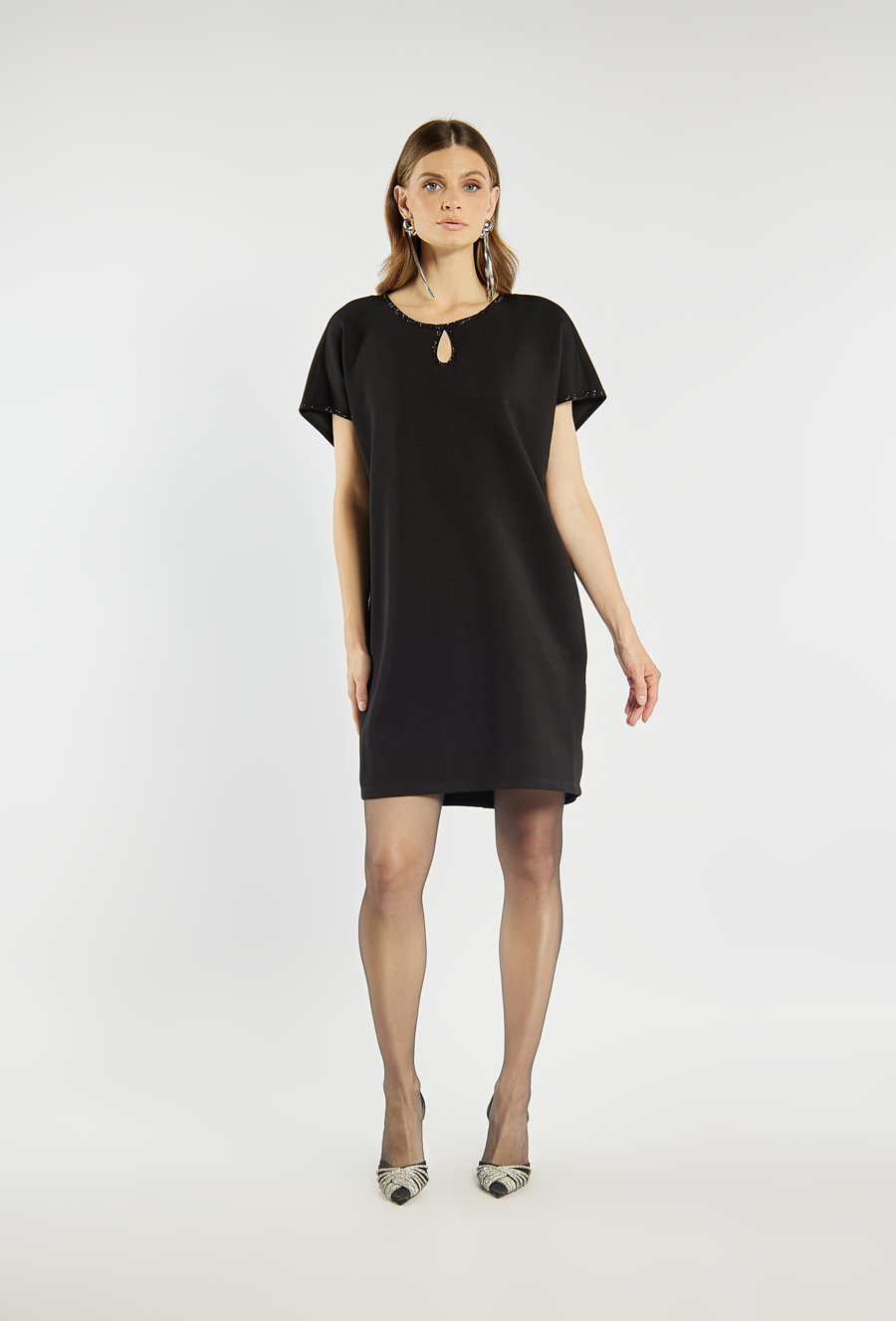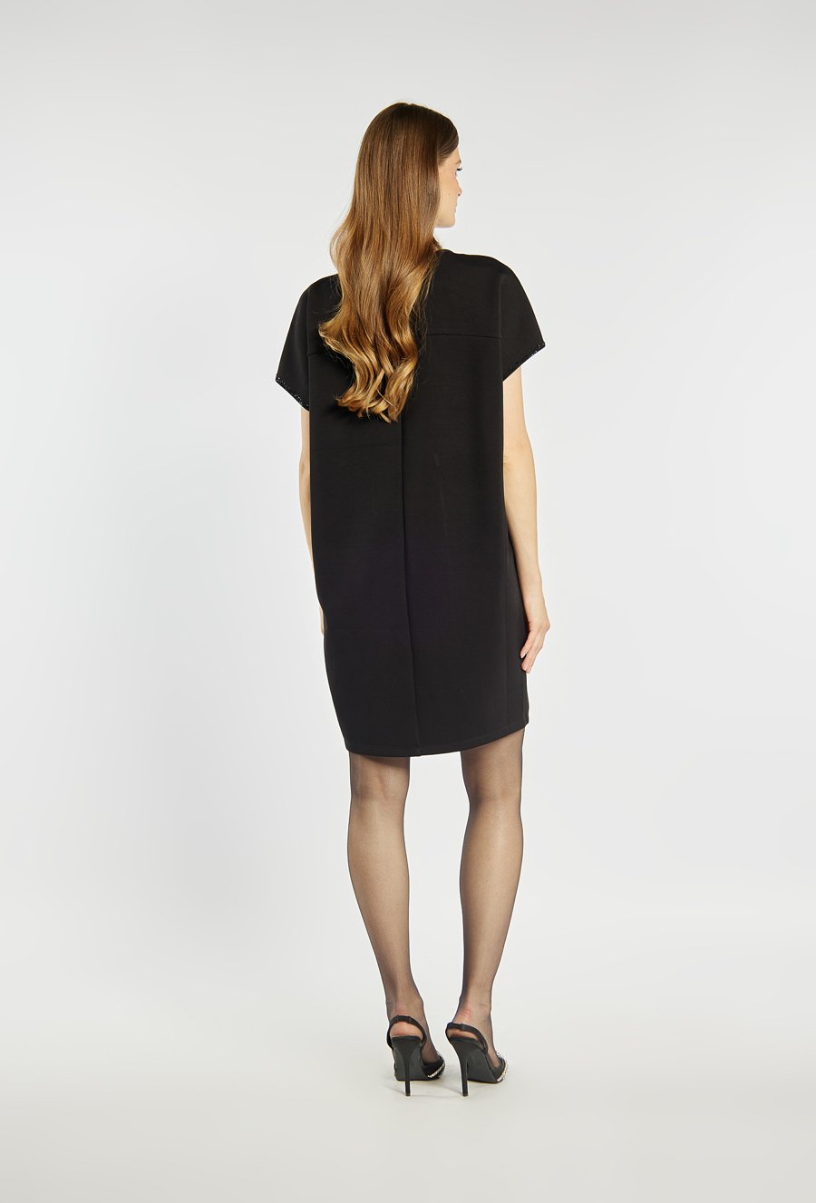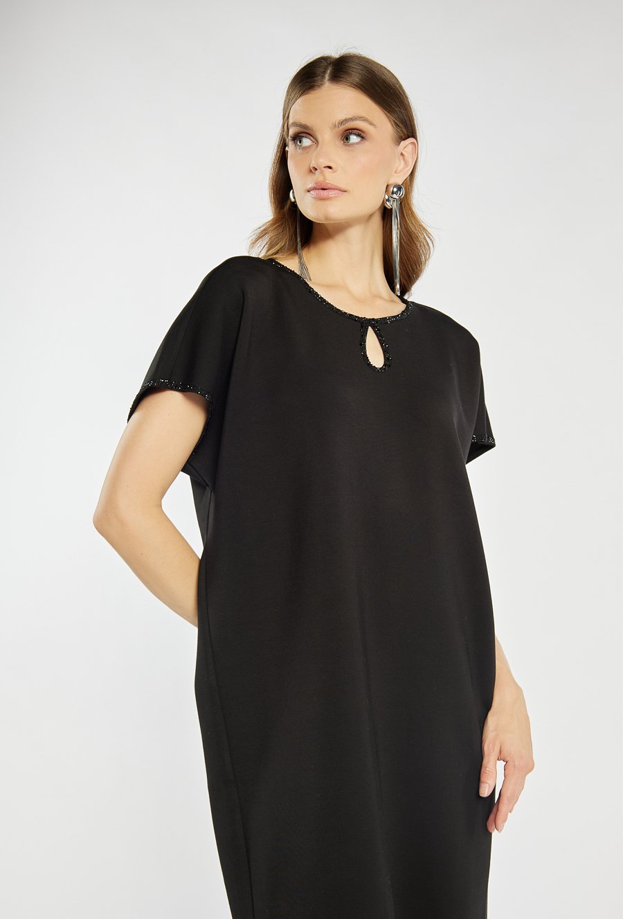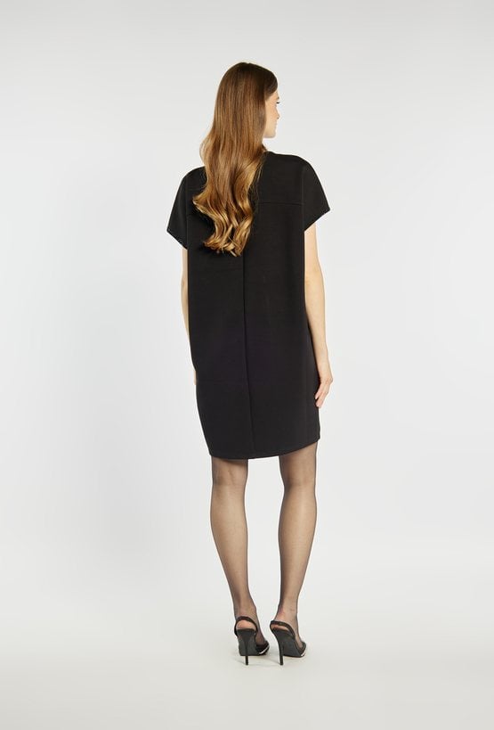 Elegancka, czarna sukienka o prostym kroju z krótkim rękawem. Dekolt z ozdobnym wycięciem i subtelnym zdobieniem drobnymi kryształkami dodaje jej wyjątkowego uroku. Delikatne połyskujące wykończenia przy krawędziach podkreślają jej wieczorowy charakter. Modelka na zdjęciu ma 177 cm wzrostu i prezentuje rozmiar 36.