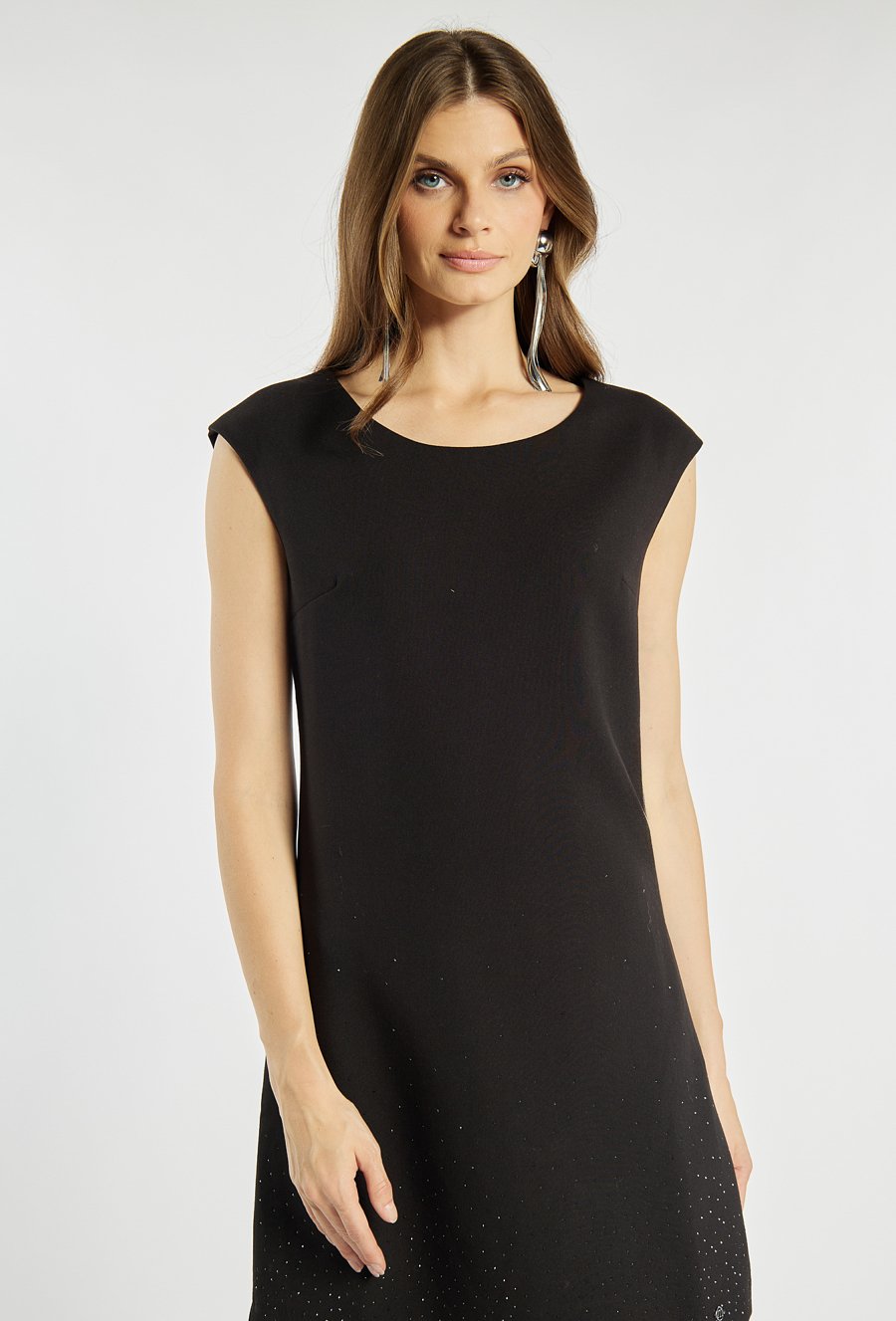 Klasyczna, elegancka sukienka o prostym kroju, zapinana z tyłu na kryty suwak. Subtelne zdobienia w dolnej części nadają jej delikatnego blasku, tworząc efektowny, ale stonowany look. To idealna propozycja na święta, sylwestra lub każdą wyjątkową okazję, kiedy chcesz wyglądać stylowo i z klasą. Modelka na zdjęciu ma 177 cm wzrostu i prezentuje rozmiar 36.