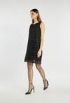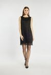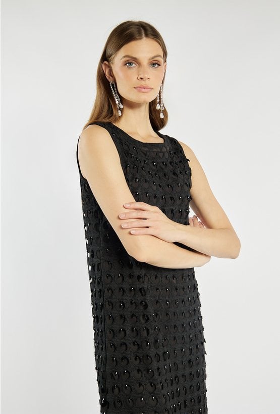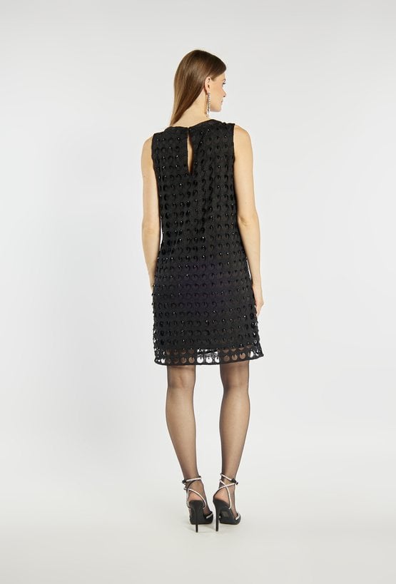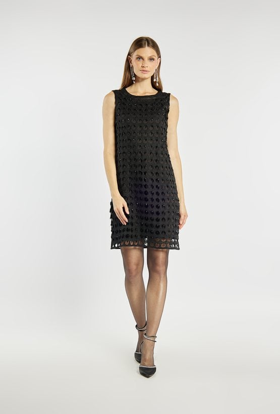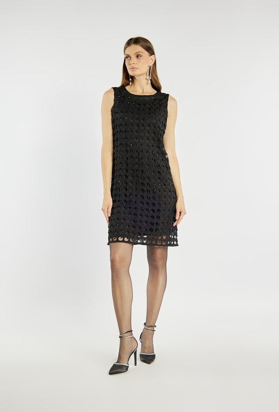 Krótka, wieczorowa sukienka damska z koralikami. Sukienka o dopasowanym kroju, o długości mini, pięknie eksponując nogi. Sukienka zawieszona na grubszych ramiączkach oraz półokrągłym dekoltem. Idealna na wieczorne wyjścia, przyjęcia czy uroczyste kolacje – ponadczasowa i efektowna w swojej prostocie. Modelka na zdjęciu ma 177 cm wzrostu i prezentuje rozmiar 36.